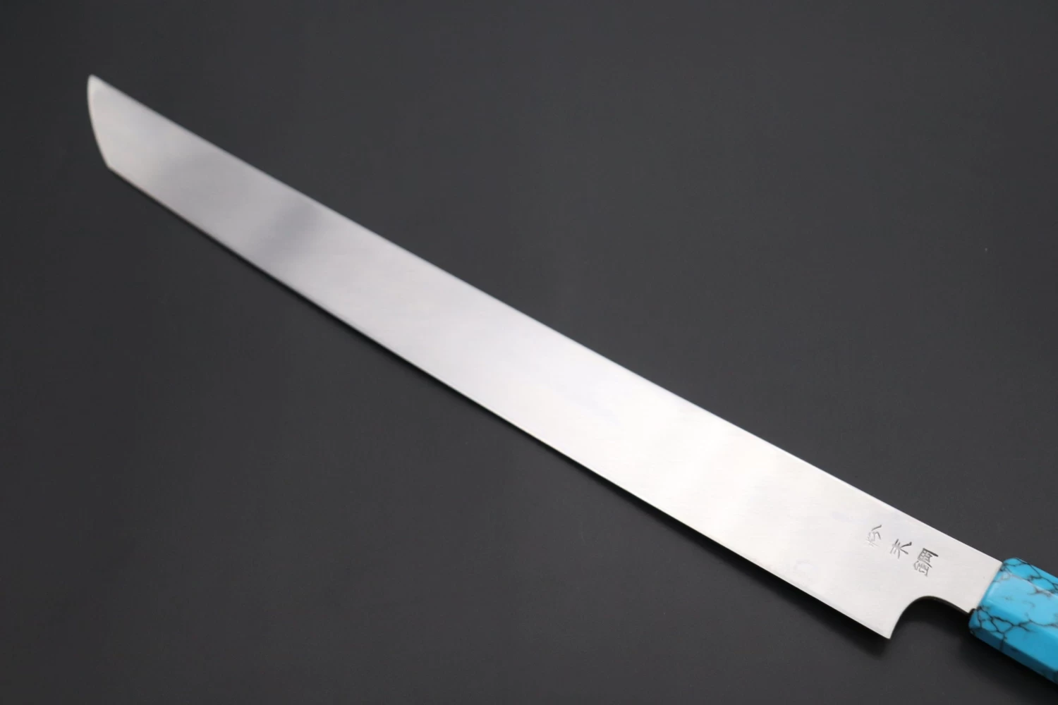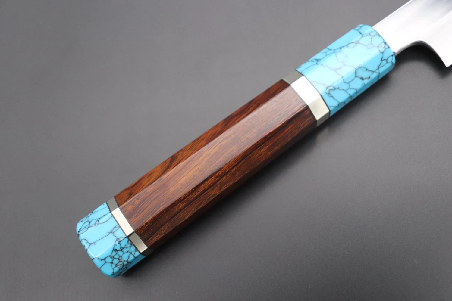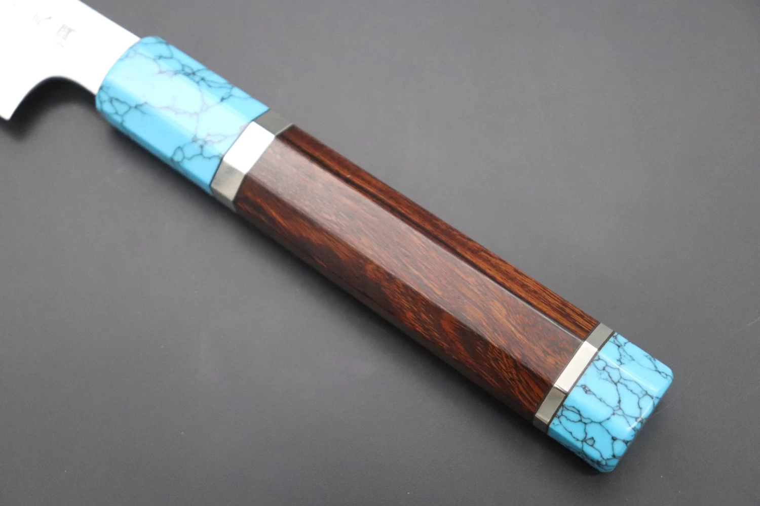 This Custom Limited Edition Sukenari SG-II Hon Kasumi Sakimaru Takohiki Knife comes with a Innovative Octagonal Desert Ironwood Handle with Nickel Silver Spacers and a Turquoise Composite Stone Ferrule & Butt.