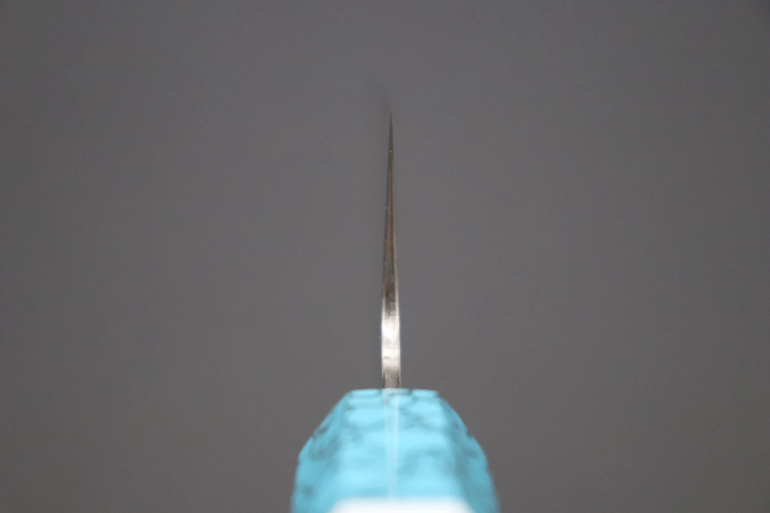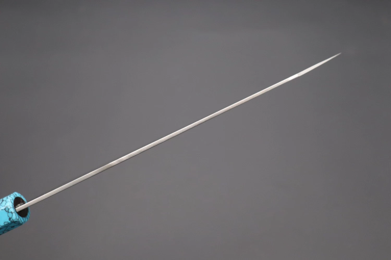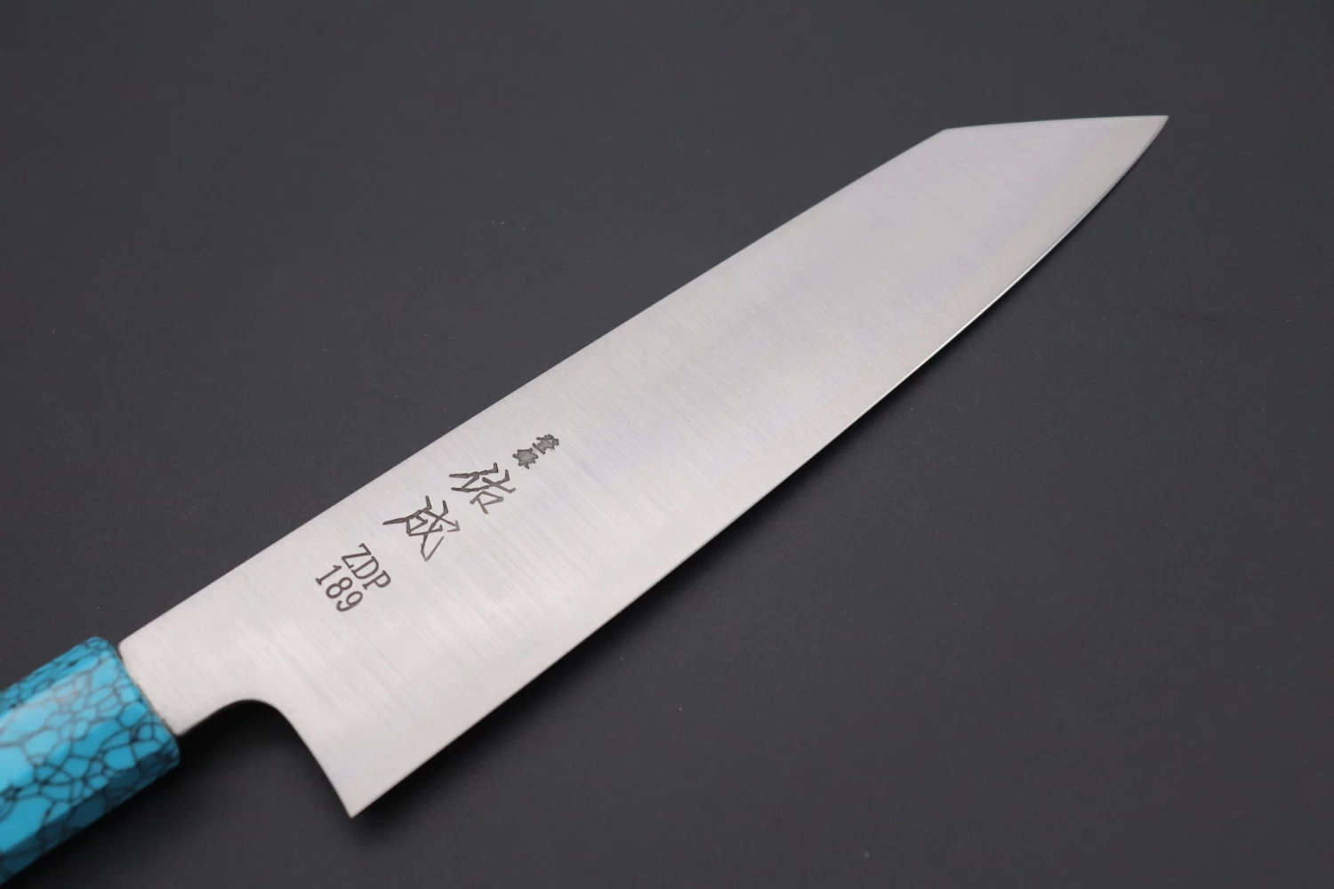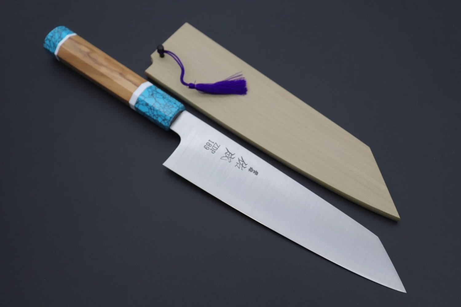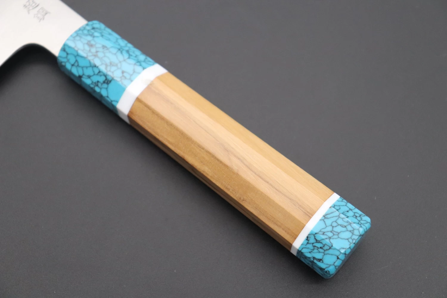 This Custom Limited Edition Sukenari ZDP-189 Clad Kiritsuke knife is fitted with a Innovative Octagonal Olive wood Handle with White Spacers and a Turquoise Composite Stone Ferrule & Butt. A matching Magnolia wood Saya (Sheath) with a black pakkawood Saya pin is also included with the knife.