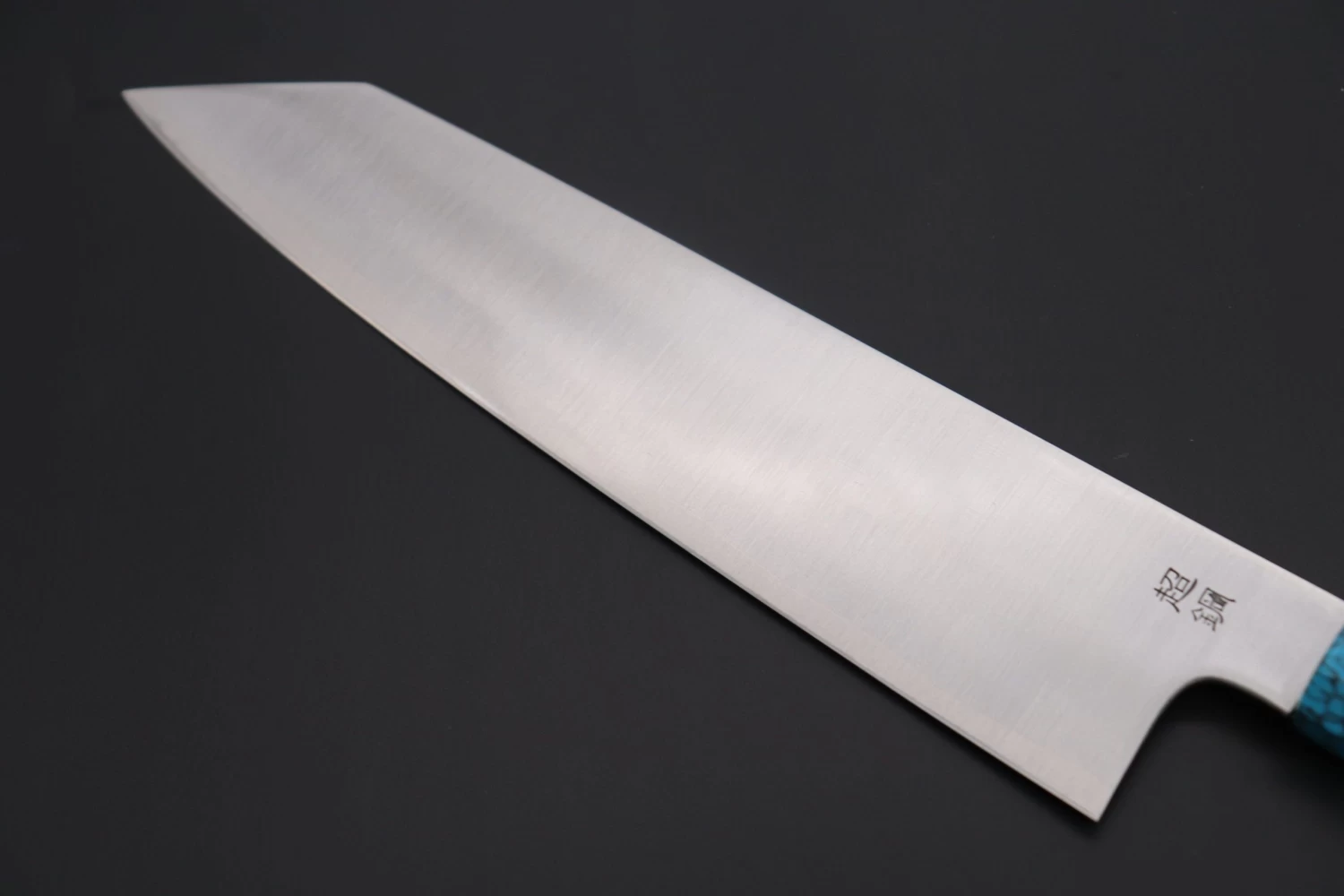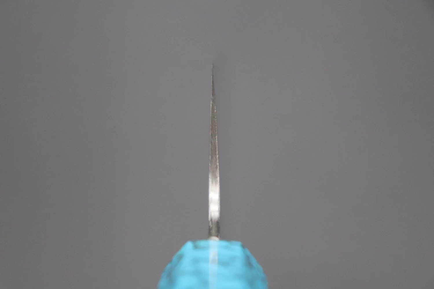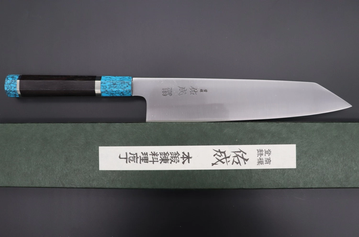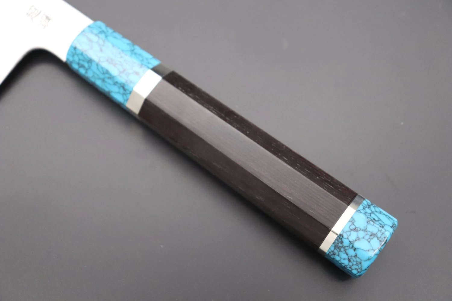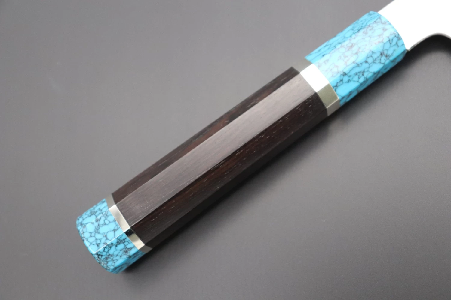 This Custom Limited Edition Sukenari ZDP-189 Clad Kiritsuke knife is fitted with a Innovative Octagonal Ebonywood Handle with Nickel Silver Spacers and a Turquoise Composite Stone Ferrule & Butt. A matching Magnolia wood Saya (Sheath) with a black pakkawood Saya pin is also included with the knife.