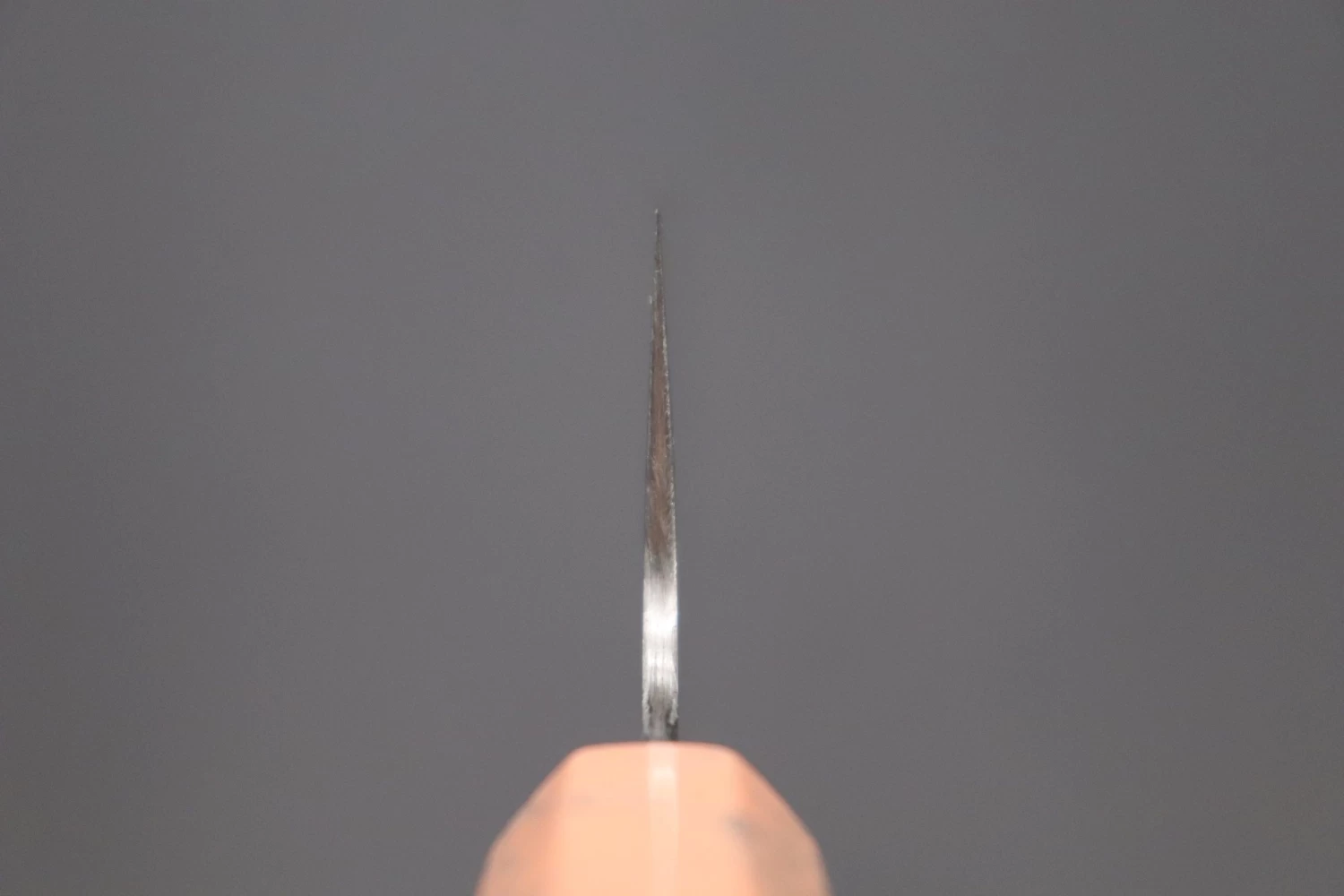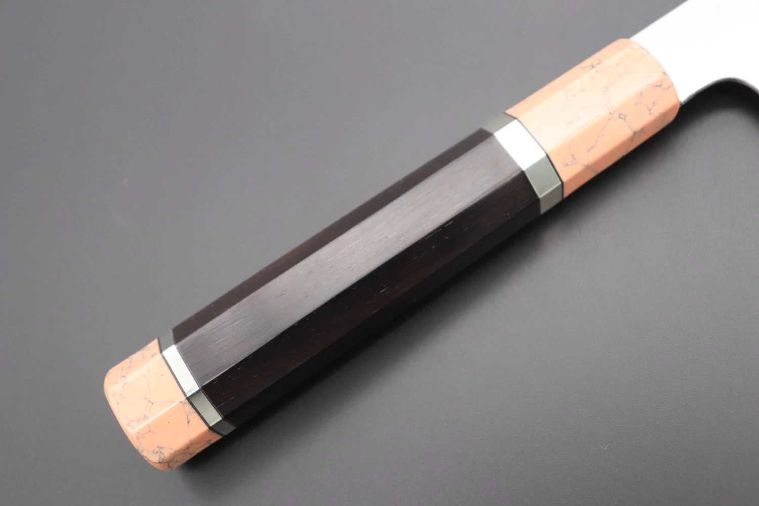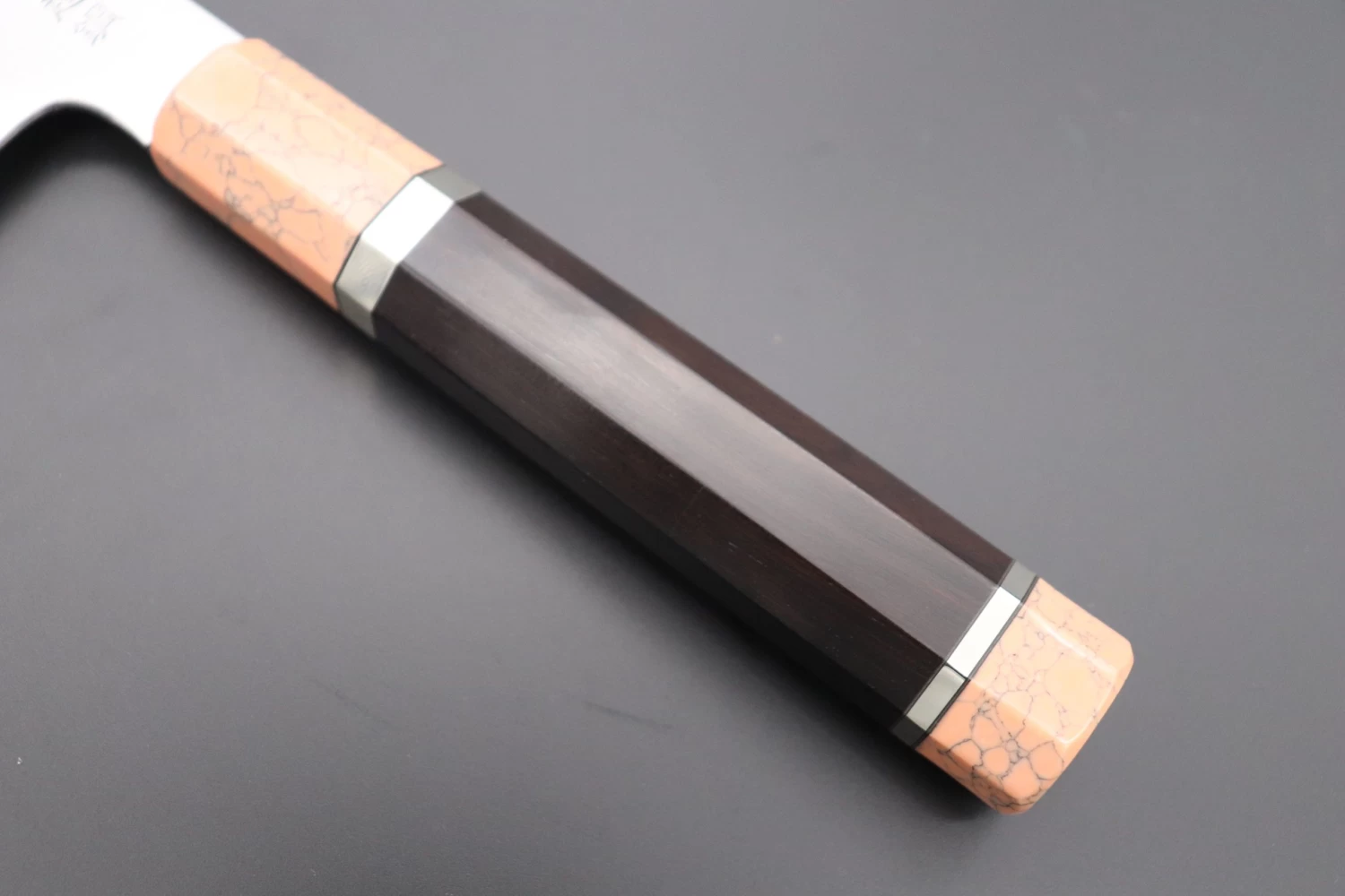 This Custom Limited Edition Sukenari ZDP-189 Clad Kiritsuke knife is fitted with a Innovative Octagonal Ebonywood Handle with Nickel Silver Spacers and a Soft Pink Turquoise Composite Stone Ferrule & Butt. A matching Magnolia wood Saya (Sheath) with a black pakkawood Saya pin is also included with the knife.