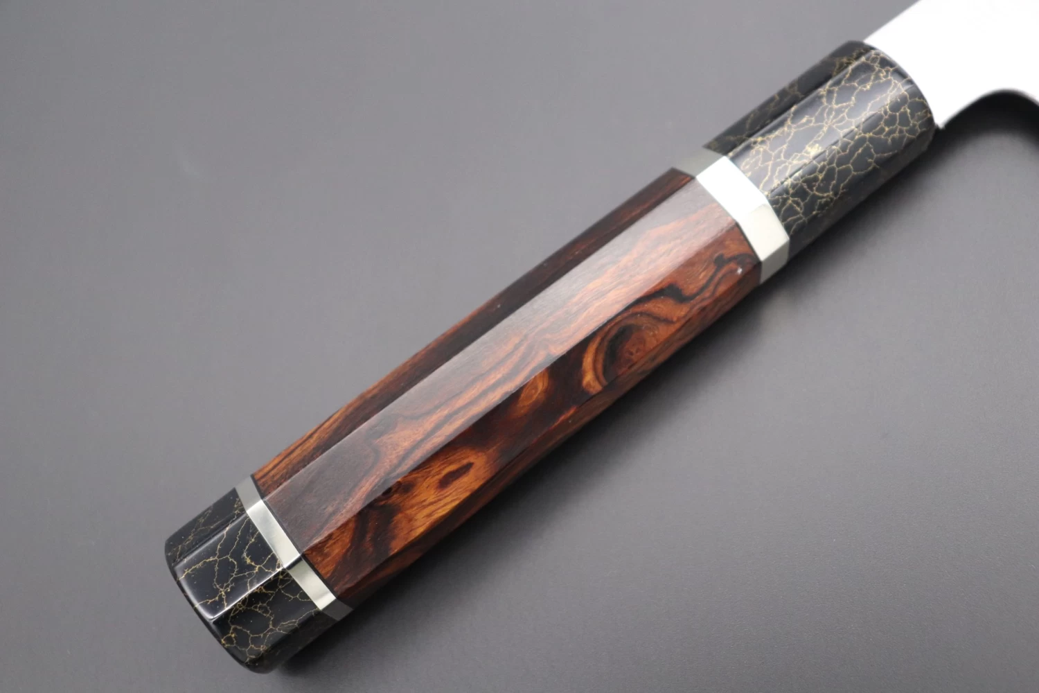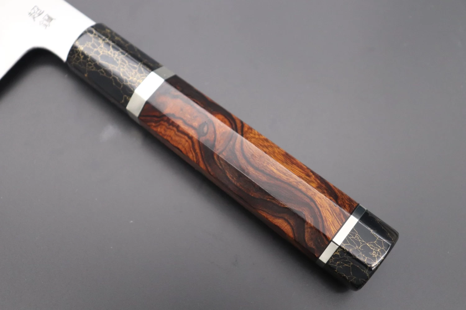 This Custom Limited Edition Sukenari ZDP-189 Clad Kiritsuke knife is fitted with a Innovative Octagonal Desert Ironwood Handle with Nickel Silver Spacers and a Black-Golden Color Turquoise Composite Stone Ferrule & Butt. A matching Magnolia wood Saya (Sheath) with a black pakkawood Saya pin is also included with the knife.