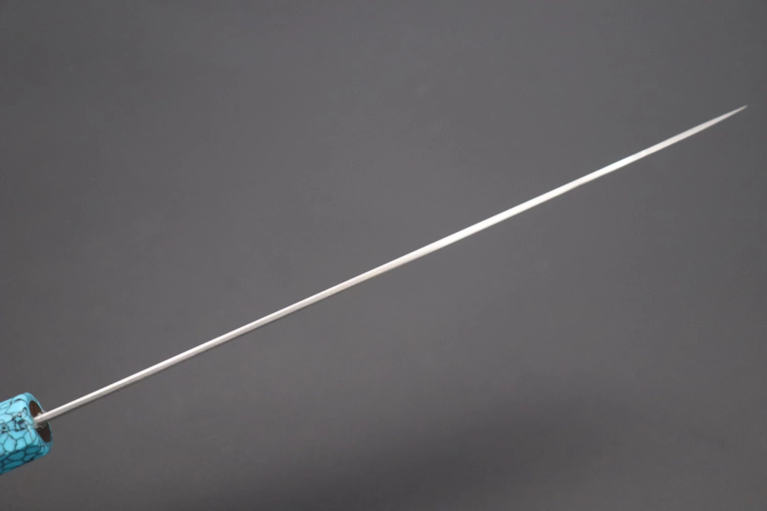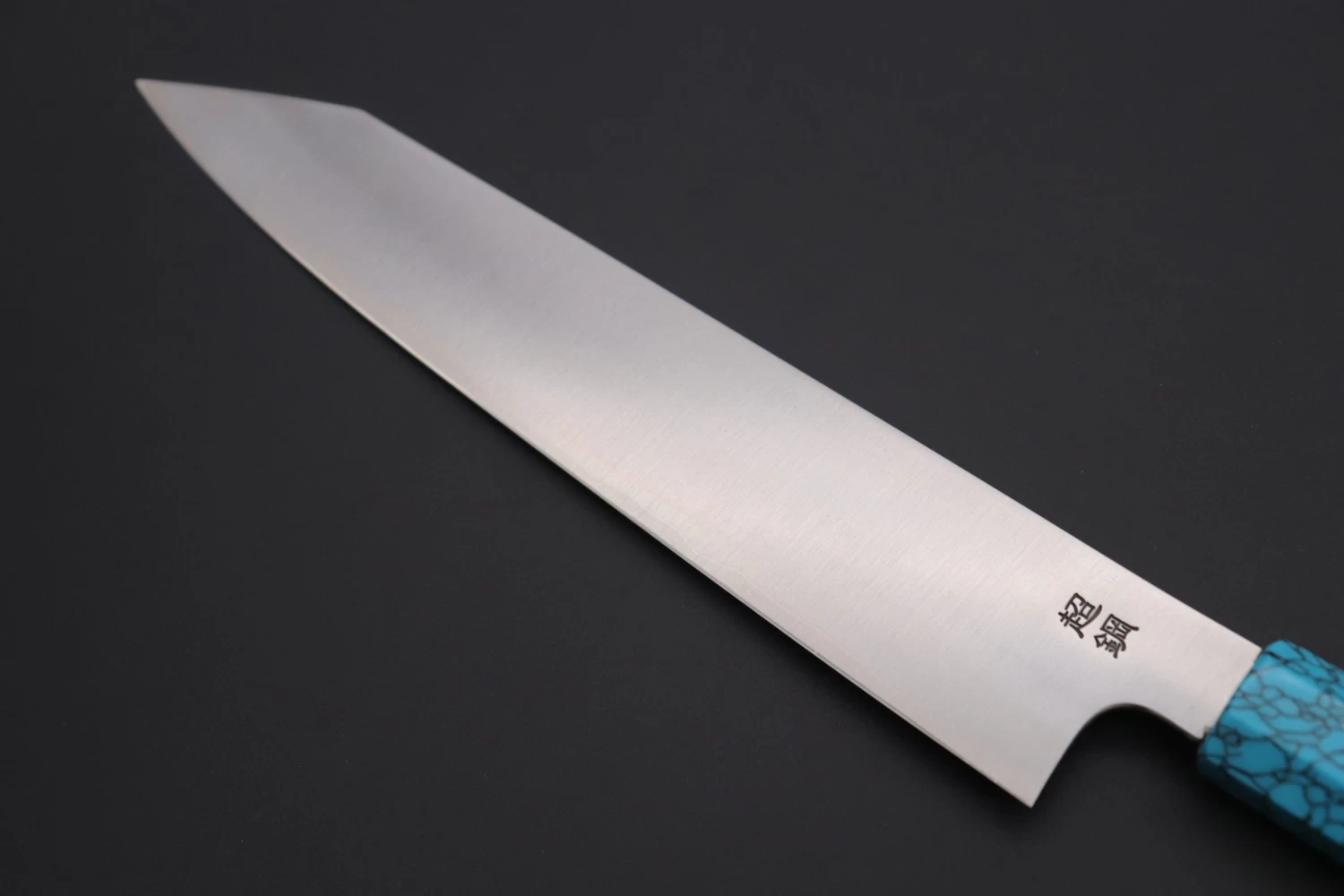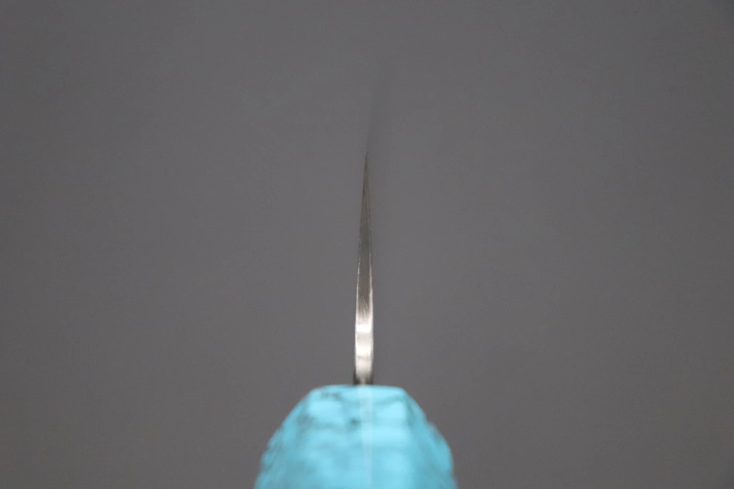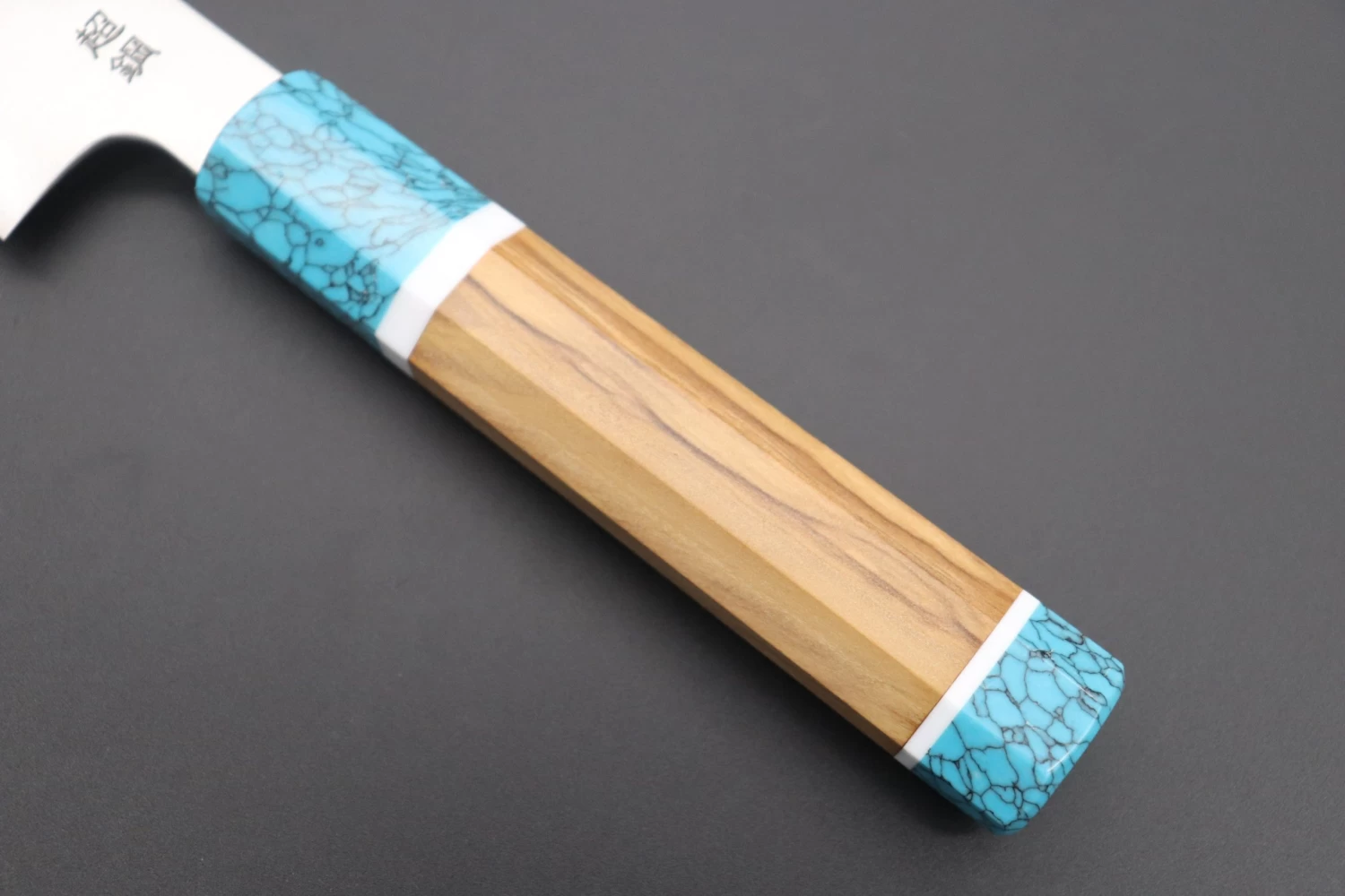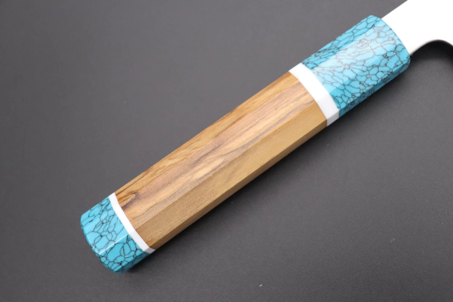 This Custom Limited Edition Sukenari ZDP-189 Clad Kiritsuke Slicer knife is fitted with a Innovative Octagonal Olivewood Handle with White Spacers and a Turquoise Composite Stone Ferrule & Butt. A matching Magnolia wood Saya (Sheath) with a black pakkawood Saya pin is also included with the knife.