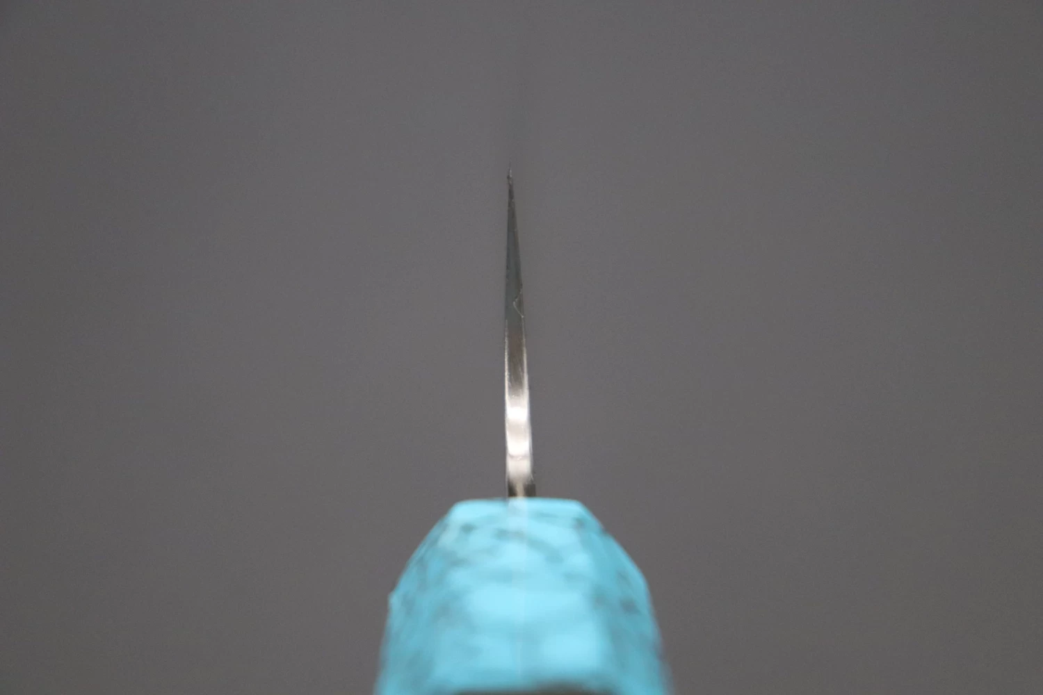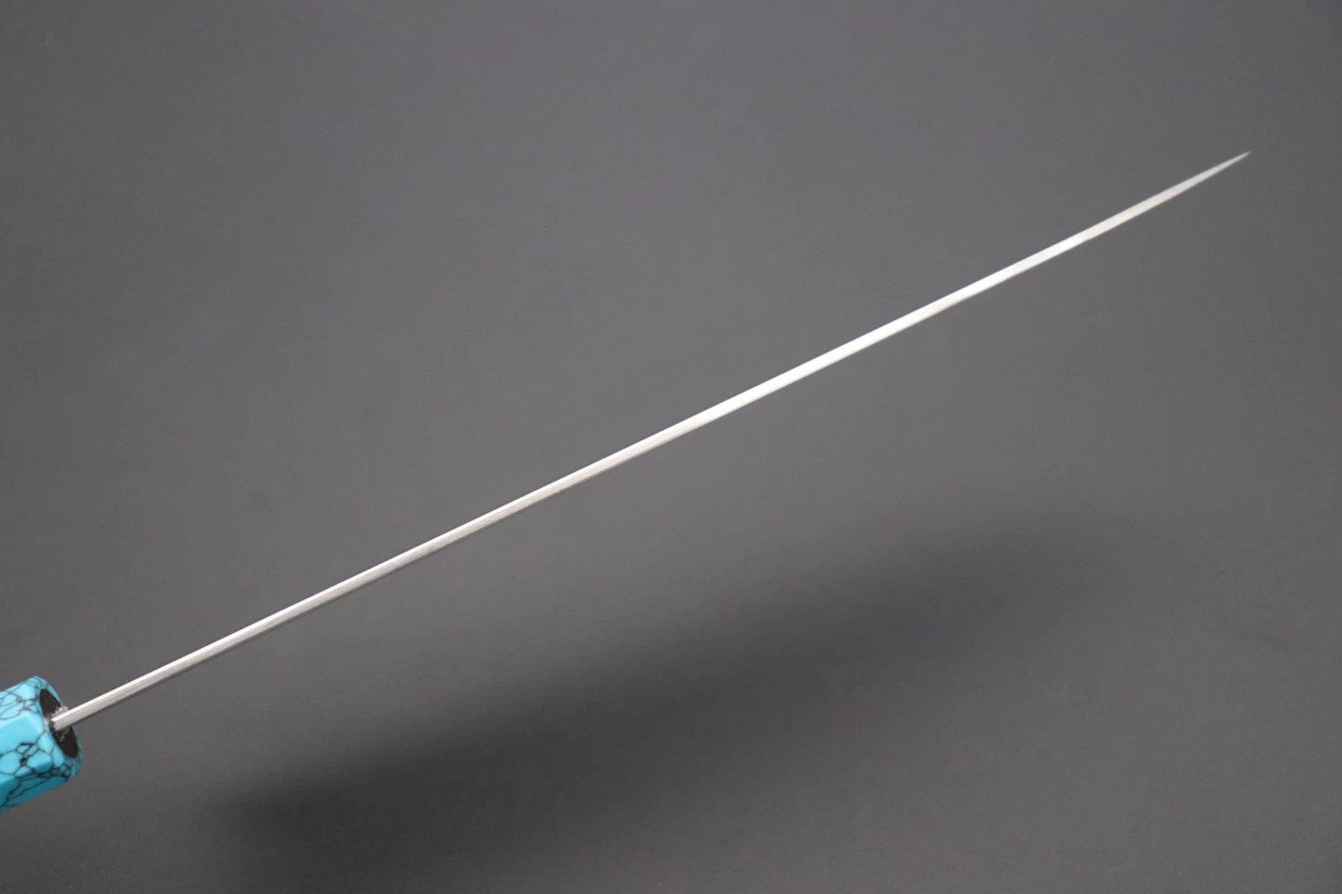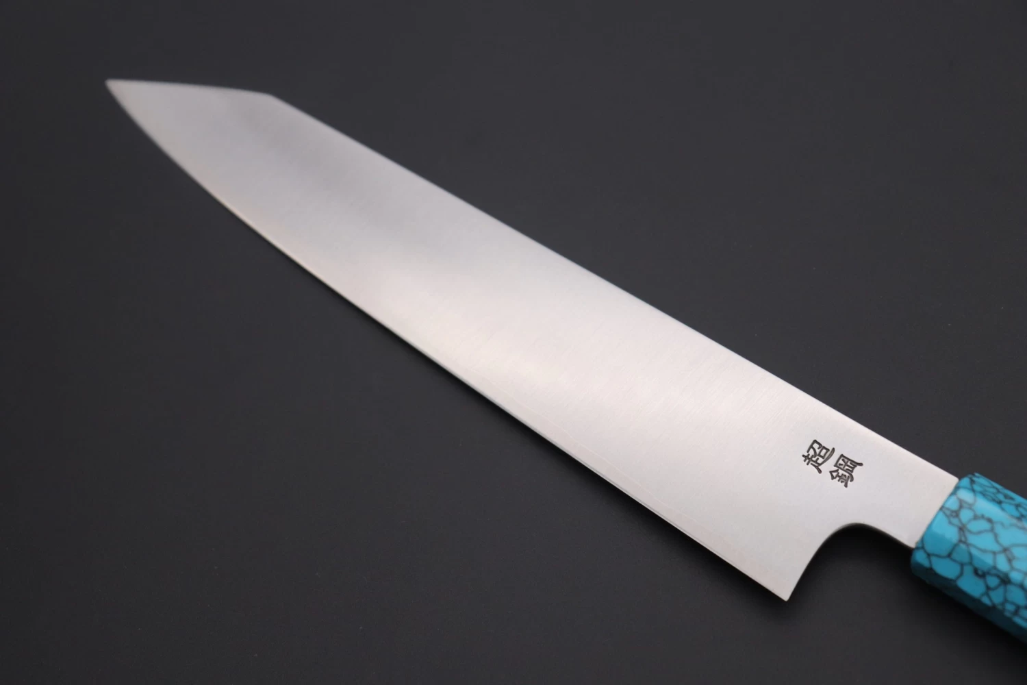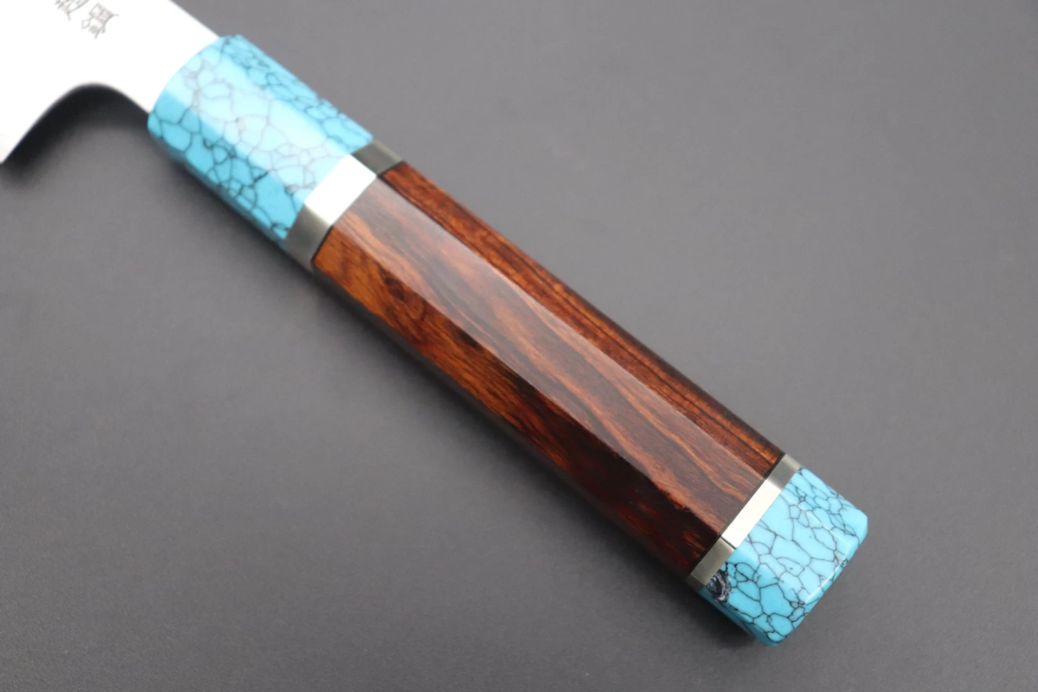 This Custom Limited Edition Sukenari ZDP-189 Clad Kiritsuke Slicer knife is fitted with a Innovative Octagonal Desert Ironwood Handle with Nickel Silver Spacers and a Turquoise Composite Stone Ferrule & Butt. A matching Magnolia wood Saya (Sheath) with a black pakkawood Saya pin is also included with the knife.