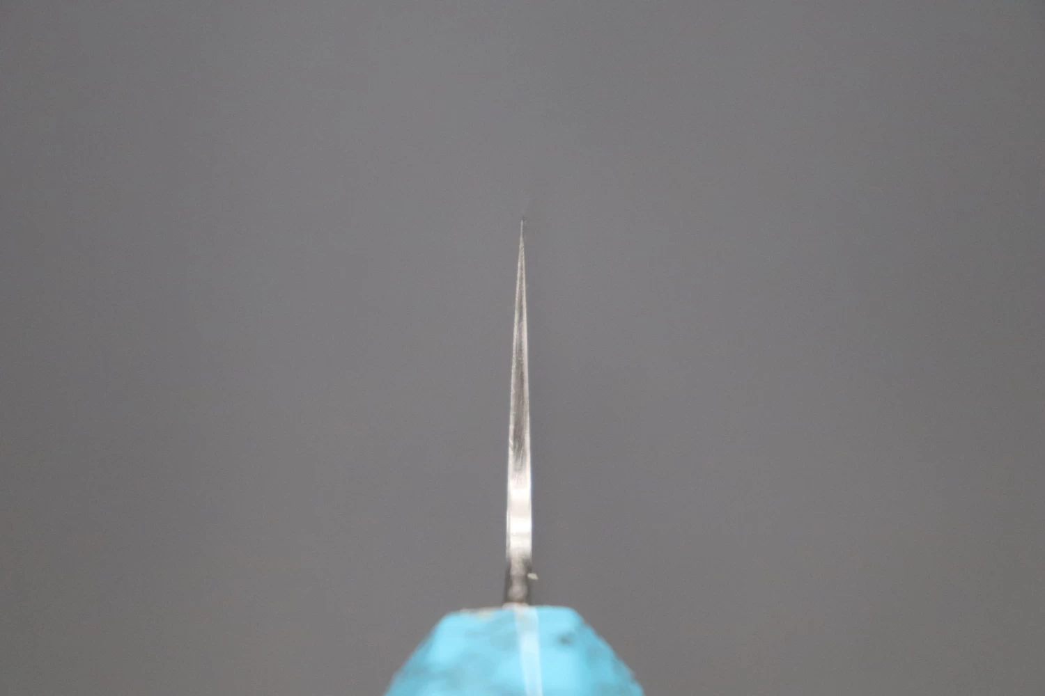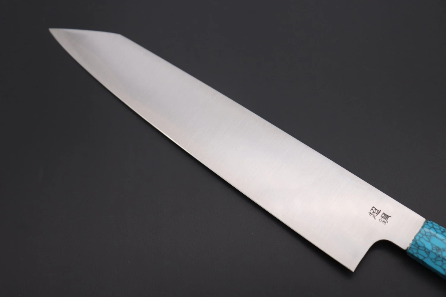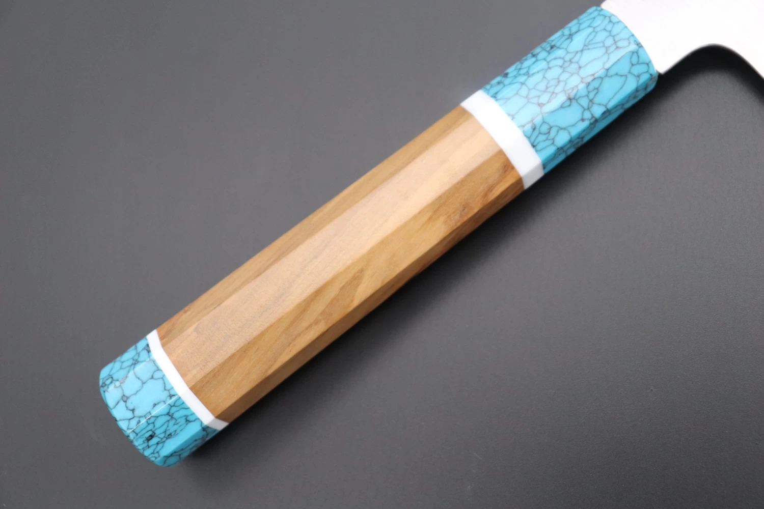 This Custom Limited Edition Sukenari ZDP-189 Clad Kiritsuke Slicer knife is fitted with a Innovative Octagonal Olive wood Handle with White Spacers and a Turquoise-Gem Composite Stone Ferrule & Butt. A matching Magnolia wood Saya (Sheath) with a black pakkawood Saya pin is also included with the knife.