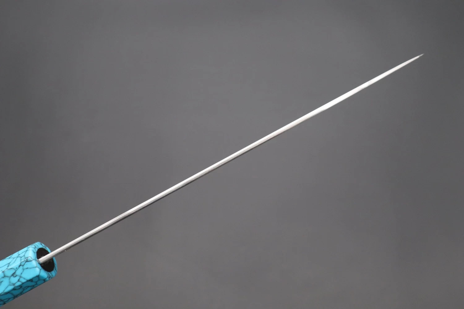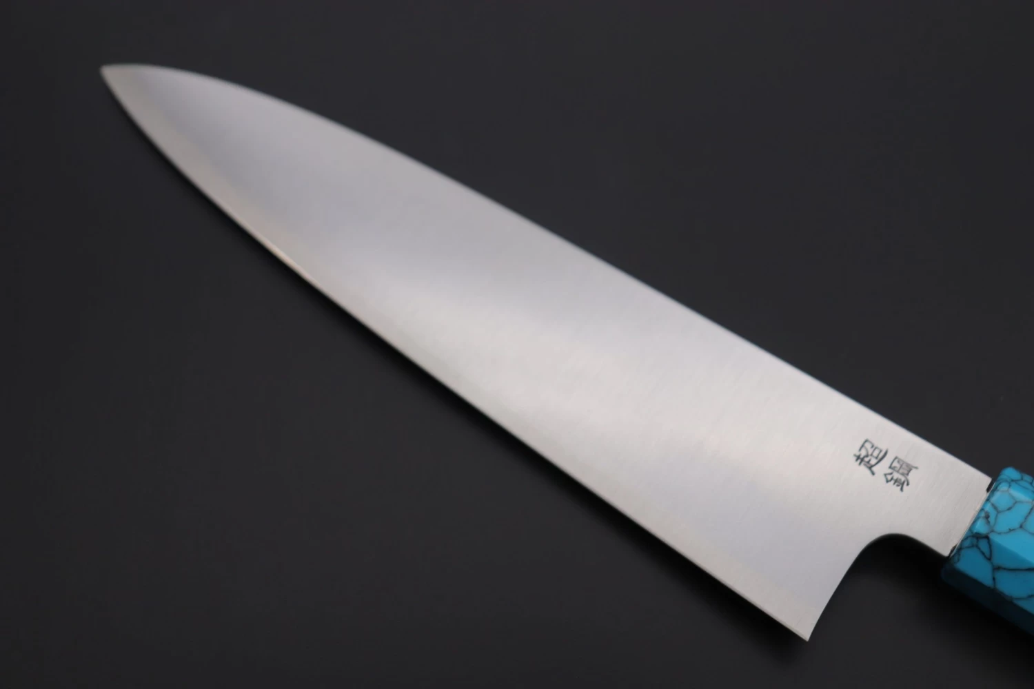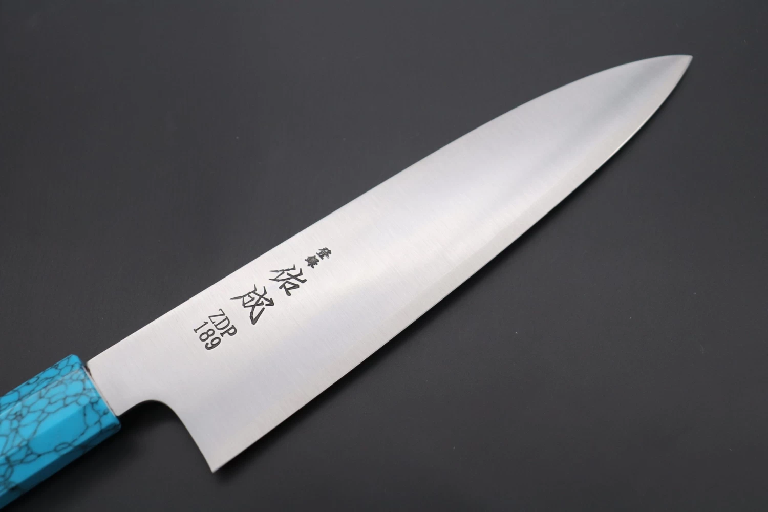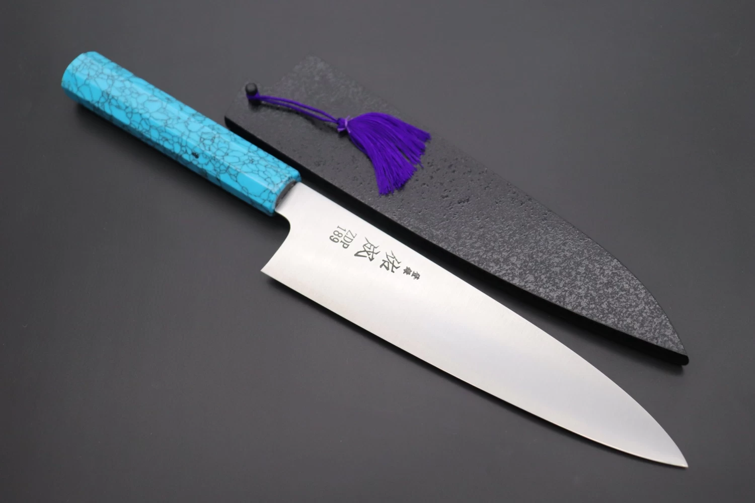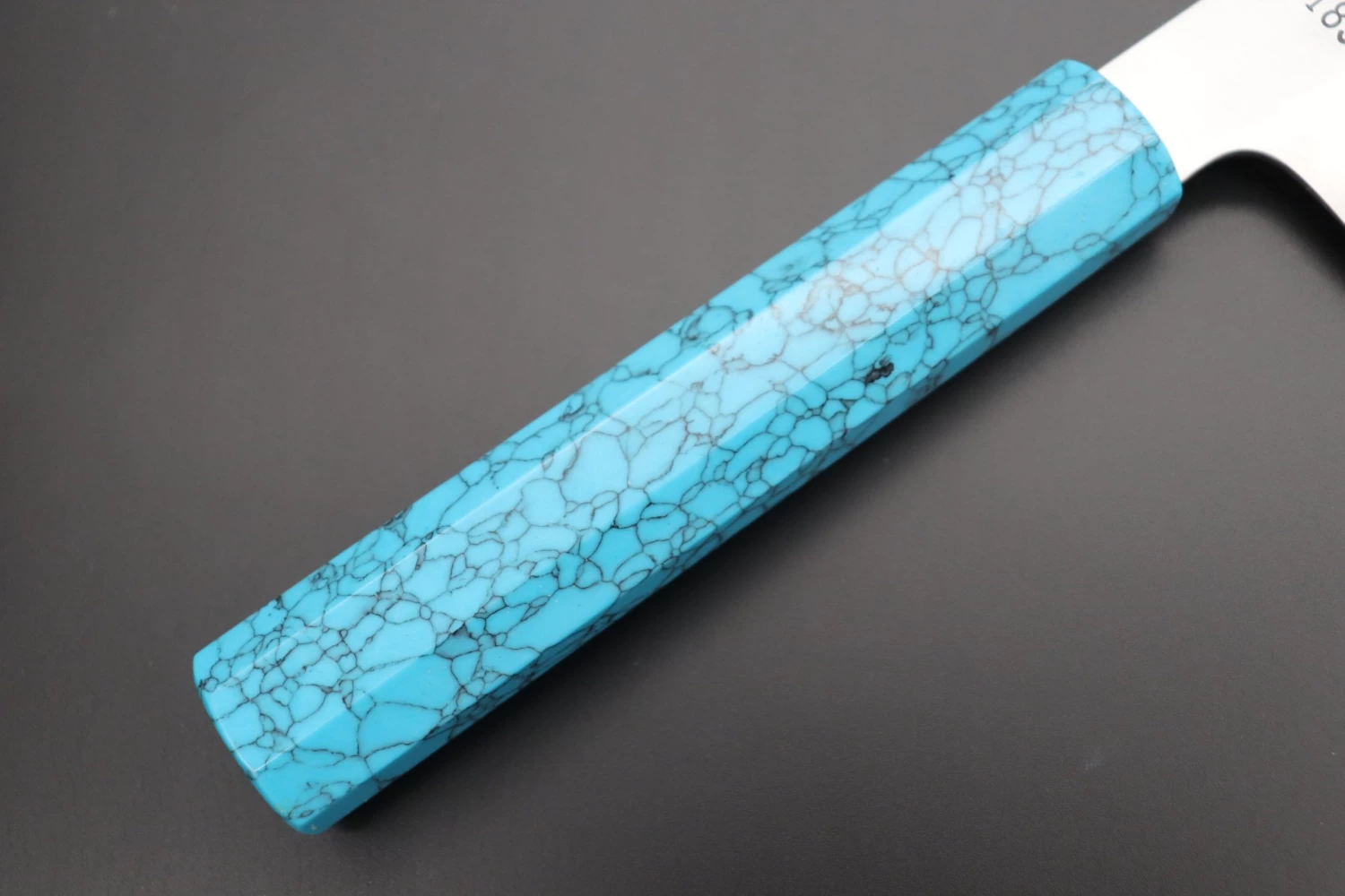 This Custom Limited Edition Sukenari ZDP-189 Clad Wa Gyuto knife is fitted with a Innovative Octagonal Turquoise Composite Stone Handle. A matching Black Lacquered wood Saya (Sheath) with a black pakkawood Saya pin is also included with the knife.