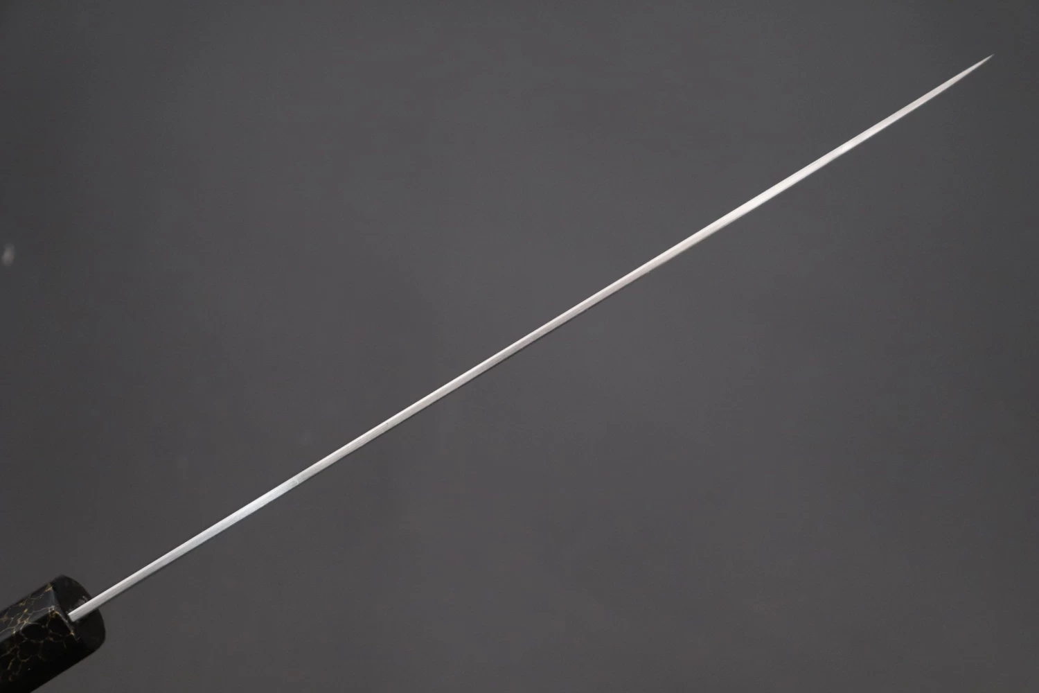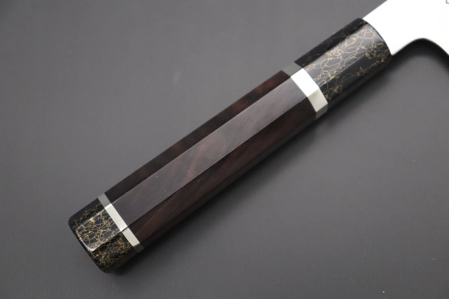 This Custom Limited Edition Sukenari ZDP-189 Clad Wa Gyuto knife is fitted with a Innovative Octagonal Ebonywood Handle with Nickel Silver Spacers and Black-Golden-Color Turquoise Composite Stone Ferrule & Butt. A matching Black Lacquered wood Saya (Sheath) with a black pakkawood Saya pin is also included with the knife.