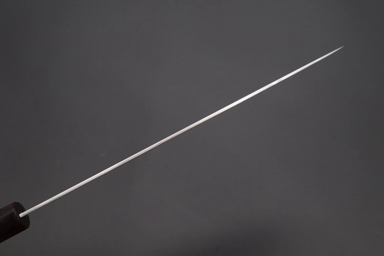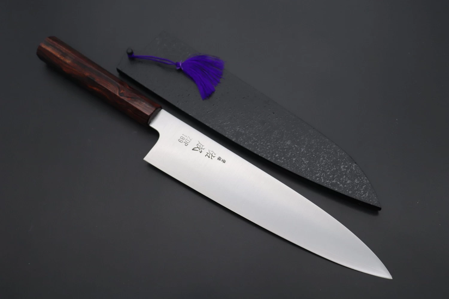This Custom Limited Edition Sukenari ZDP-189 Clad Wa Gyuto knife is fitted with a Innovative Octagonal Desert Ironwood Handle. A matching Black Lacquered wood Saya (Sheath) with a black pakkawood Saya pin is also included with the knife.