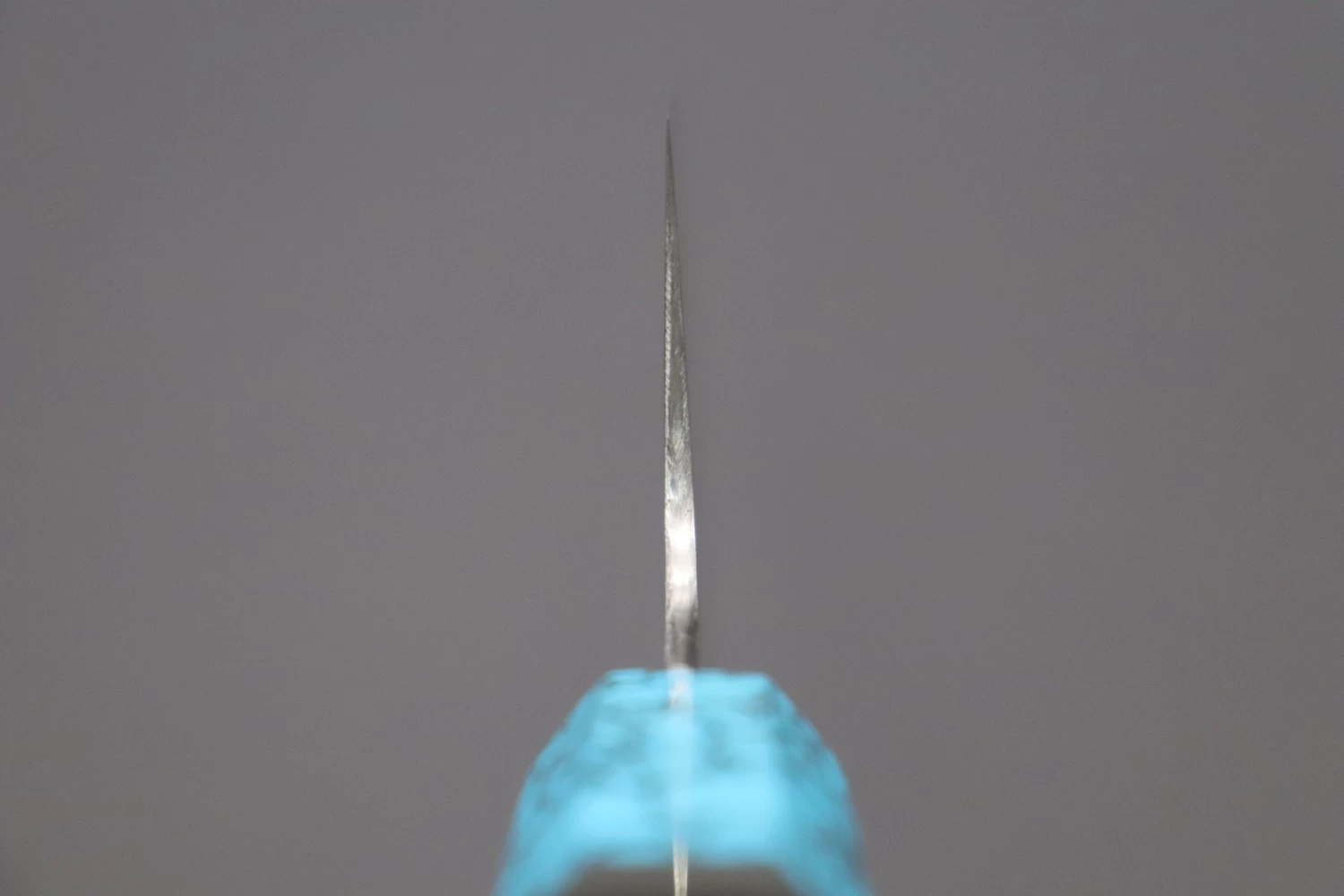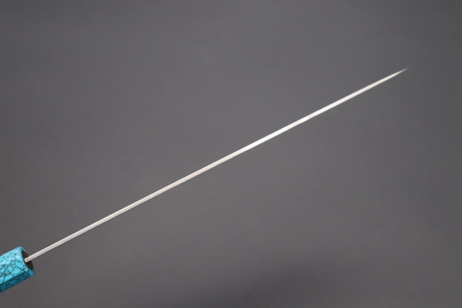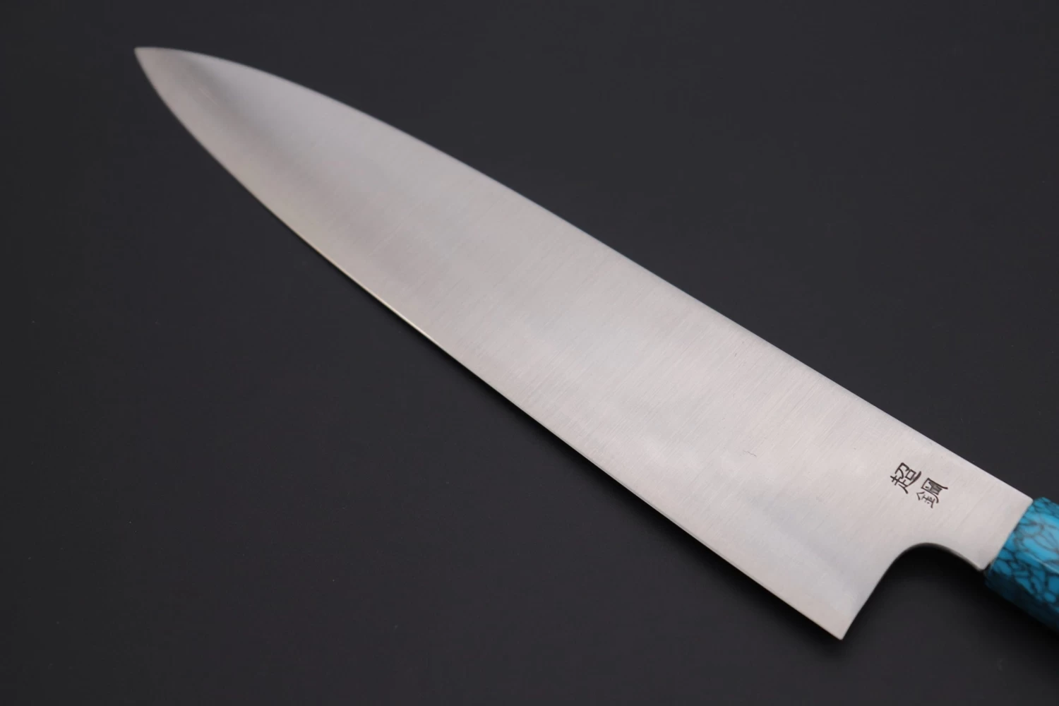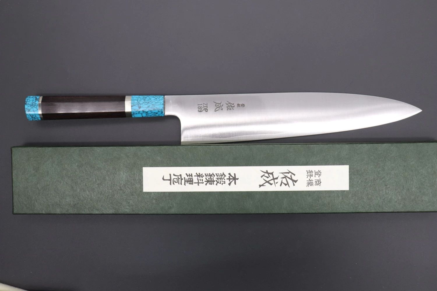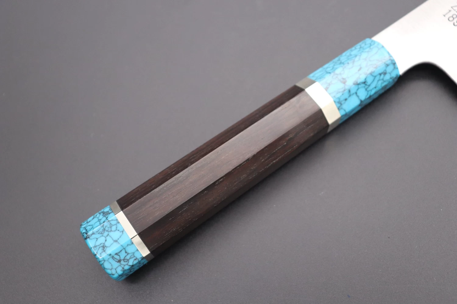 This Custom Limited Edition Sukenari ZDP-189 Clad Wa Gyuto knife is fitted with a Innovative Octagonal Ebonywood Handle with Nickel Silver Spacers and Turquoise Composite Stone Ferrule & Butt. A matching Black Lacquered wood Saya (Sheath) with a black pakkawood Saya pin is also included with the knife.