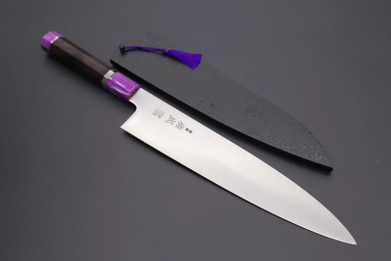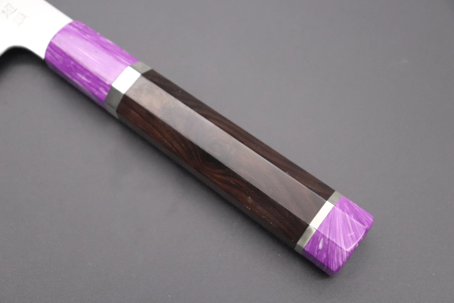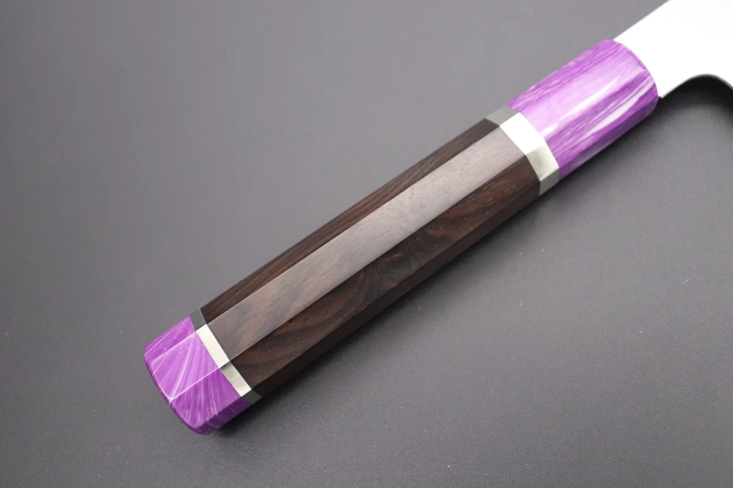 This Custom Limited Edition Sukenari ZDP-189 Clad Wa Gyuto knife is fitted with a Innovative Octagonal Ebonywood Handle with Nickel Silver Spacers and a Royal Purple Composite Stone Ferrule & Butt. A matching Black Lacquered wood Saya (Sheath) with a black pakkawood Saya pin is also included with the knife.