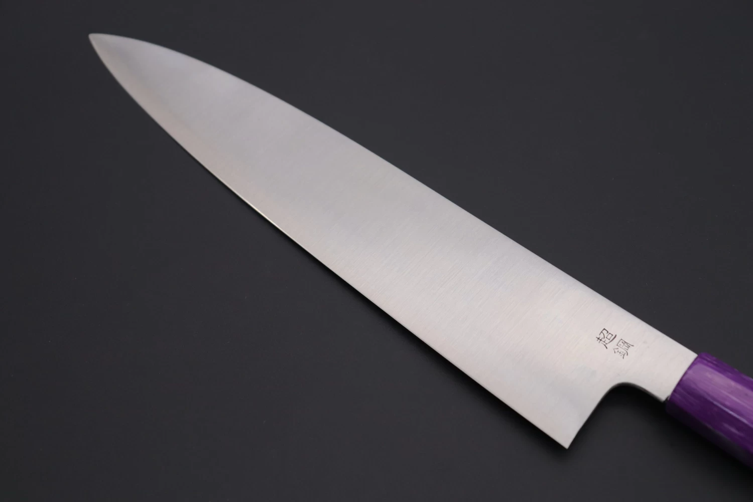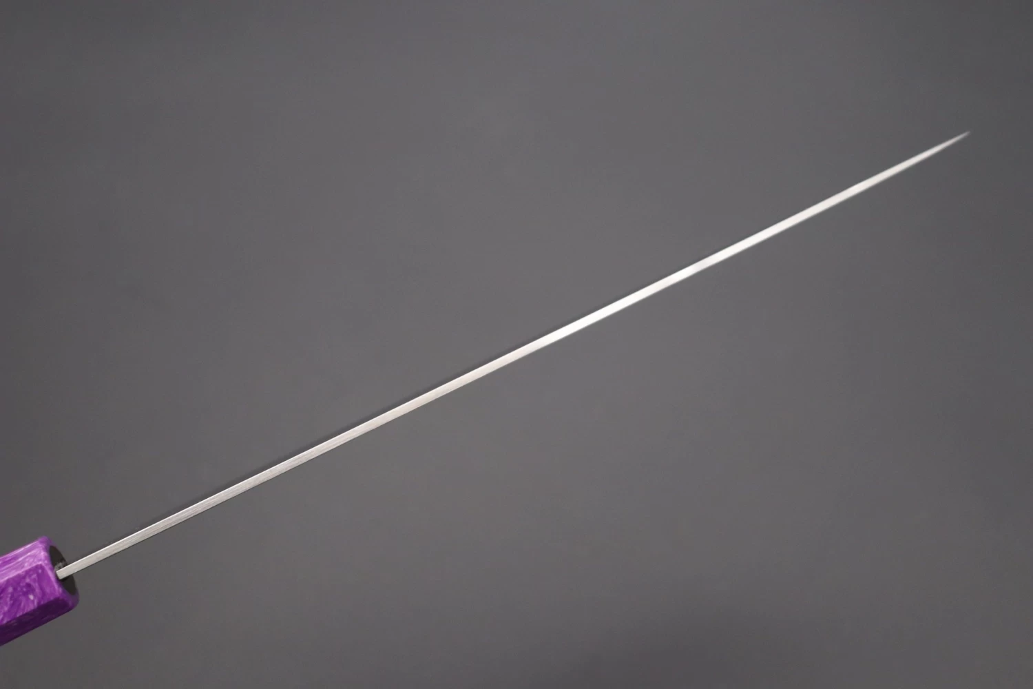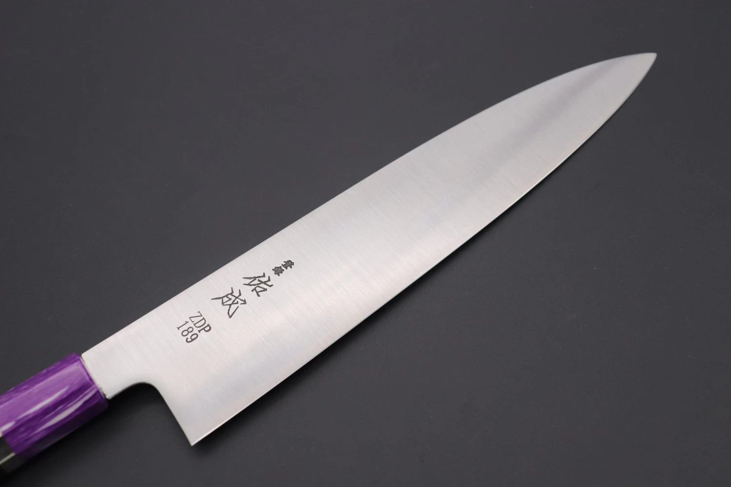 This Custom Limited Edition Sukenari ZDP-189 Clad Wa Gyuto knife is fitted with a Innovative Octagonal Ebonywood Handle with Nickel Silver Spacers and a Royal Purple Composite Stone Ferrule & Butt. A matching Black Lacquered wood Saya (Sheath) with a black pakkawood Saya pin is also included with the knife.