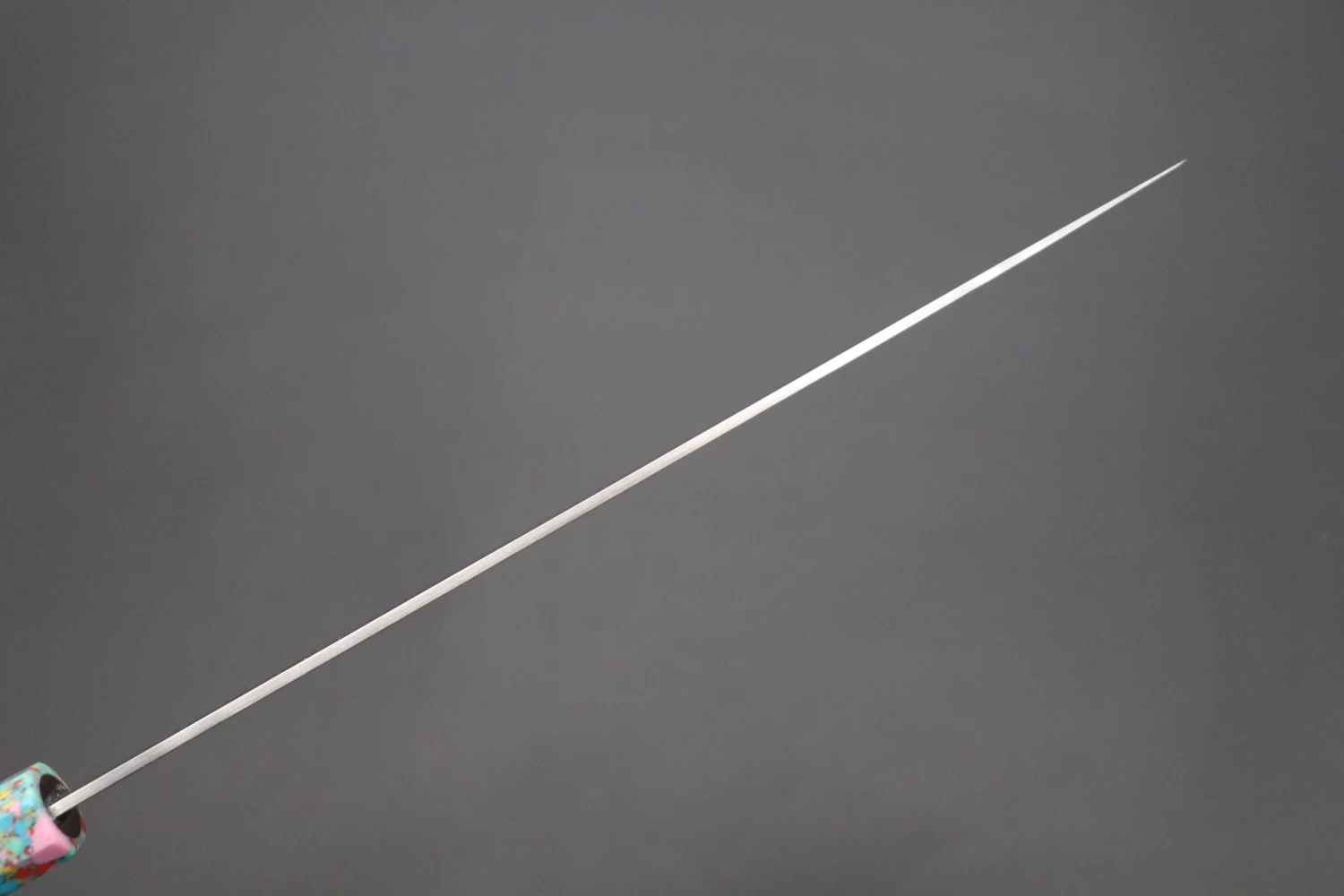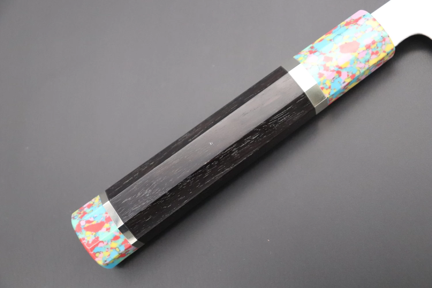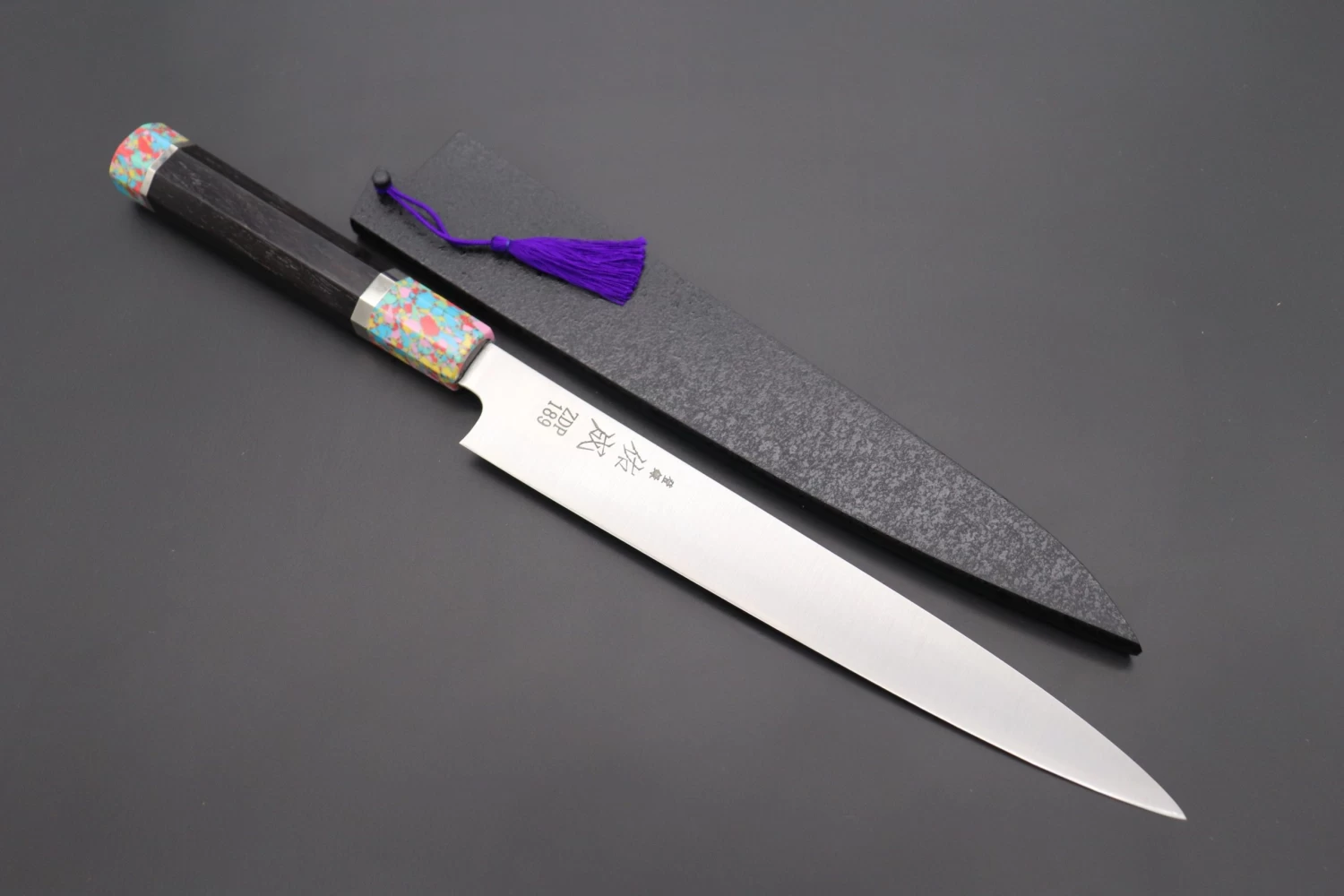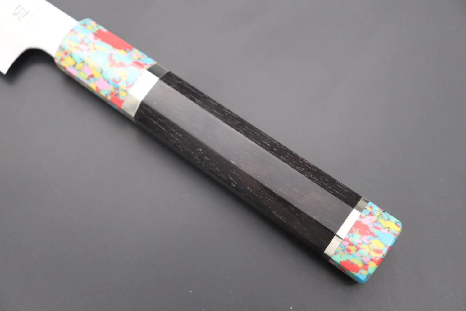 This Custom Limited Edition Sukenari ZDP-189 Clad Wa Sujihiki knife is fitted with a Innovative Octagonal Ebonywood Handle with Nickel Silver Spacers and a Tropical- Color Turquoise Composite Stone Ferrule & Butt. A matching Black Lacquered wood Saya (Sheath) with a black pakkawood Saya pin is also included with the knife.