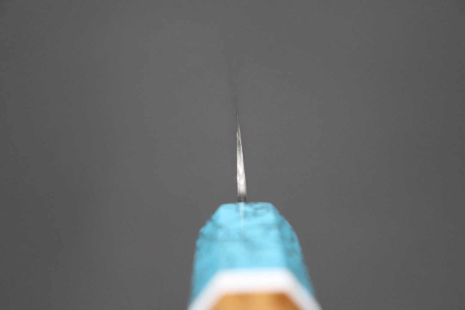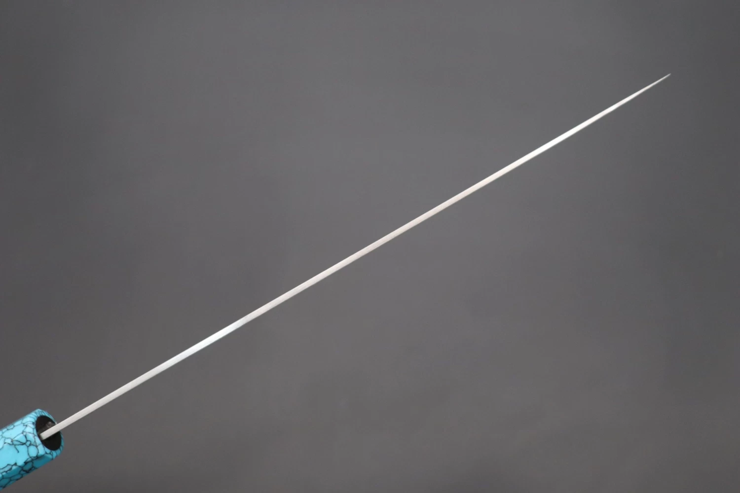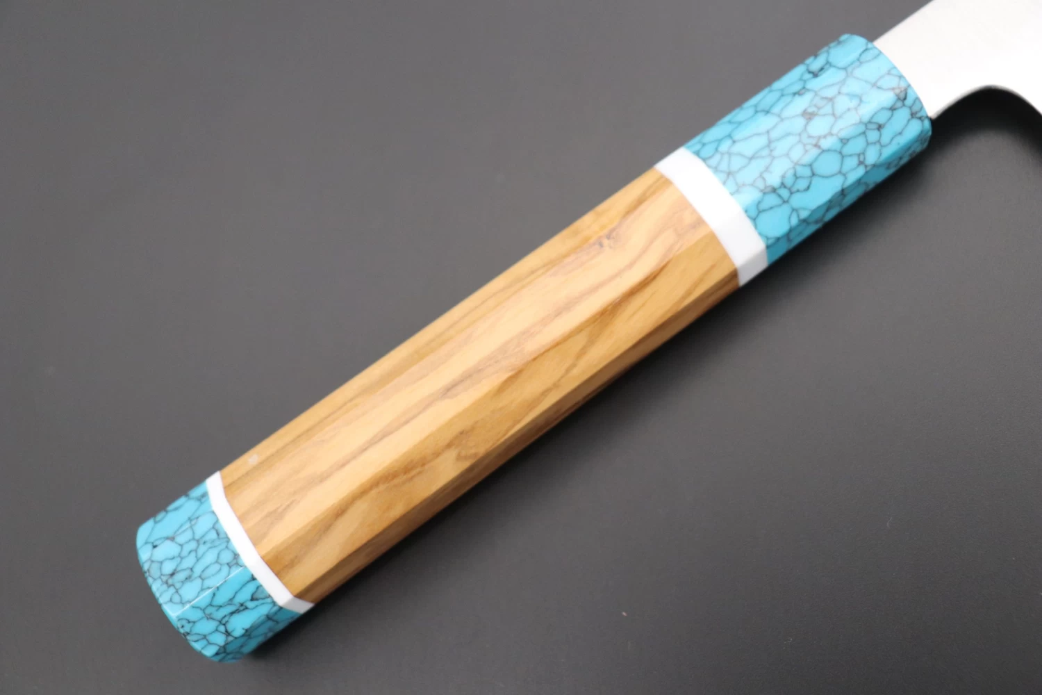 This Custom Limited Edition Sukenari ZDP-189 Clad Wa Sujihiki knife is fitted with a Innovative Octagonal Olivewood Handle with White-Acrylic Spacers and a Turquoise Composite Stone Ferrule & Butt. A matching Black Lacquered wood Saya (Sheath) with a black pakkawood Saya pin is also included with the knife.