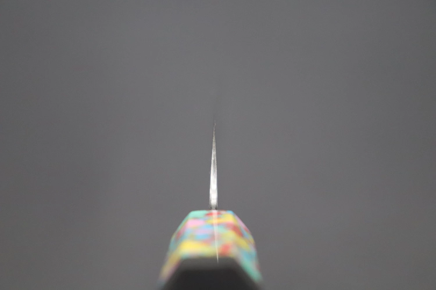 This Custom Limited Edition Sukenari ZDP-189 Clad Wa Sujihiki knife is fitted with a Innovative Octagonal Ebonywood Handle with Nickel Silver Spacers and a Tropical-Color-Turquoise Composite Stone Ferrule & Butt. A matching Black Lacquered wood Saya (Sheath) with a black pakkawood Saya pin is also included with the knife.