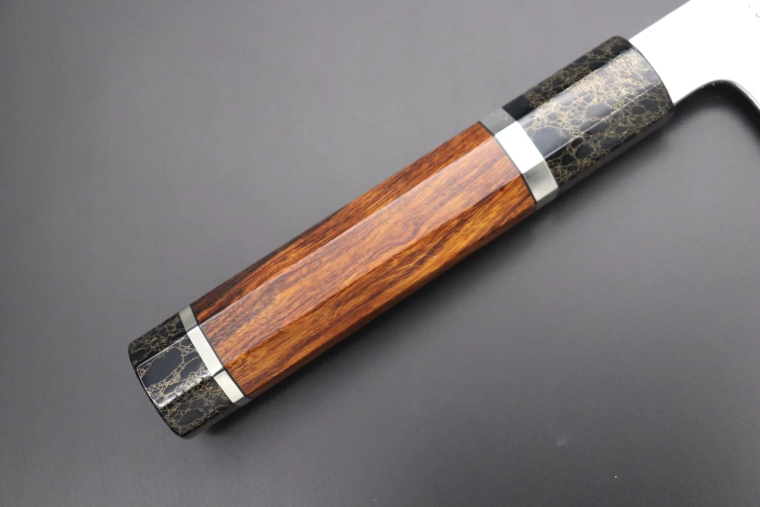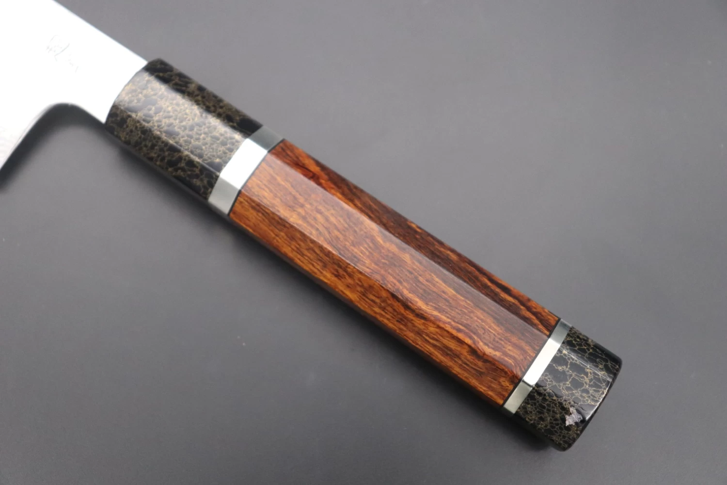 This Sukenari ZDP-189 Nickel Damascus knife is fitted with a Innovative Octagonal Desert Ironwood handle with a Black-Golden-Color-Turquoise Composite Stone Ferrule & Butt with Nickel Silver Spacers. For safekeeping, this knife comes with a matching Magnolia wood Saya (Sheath) with a black pakkawood Saya pin.