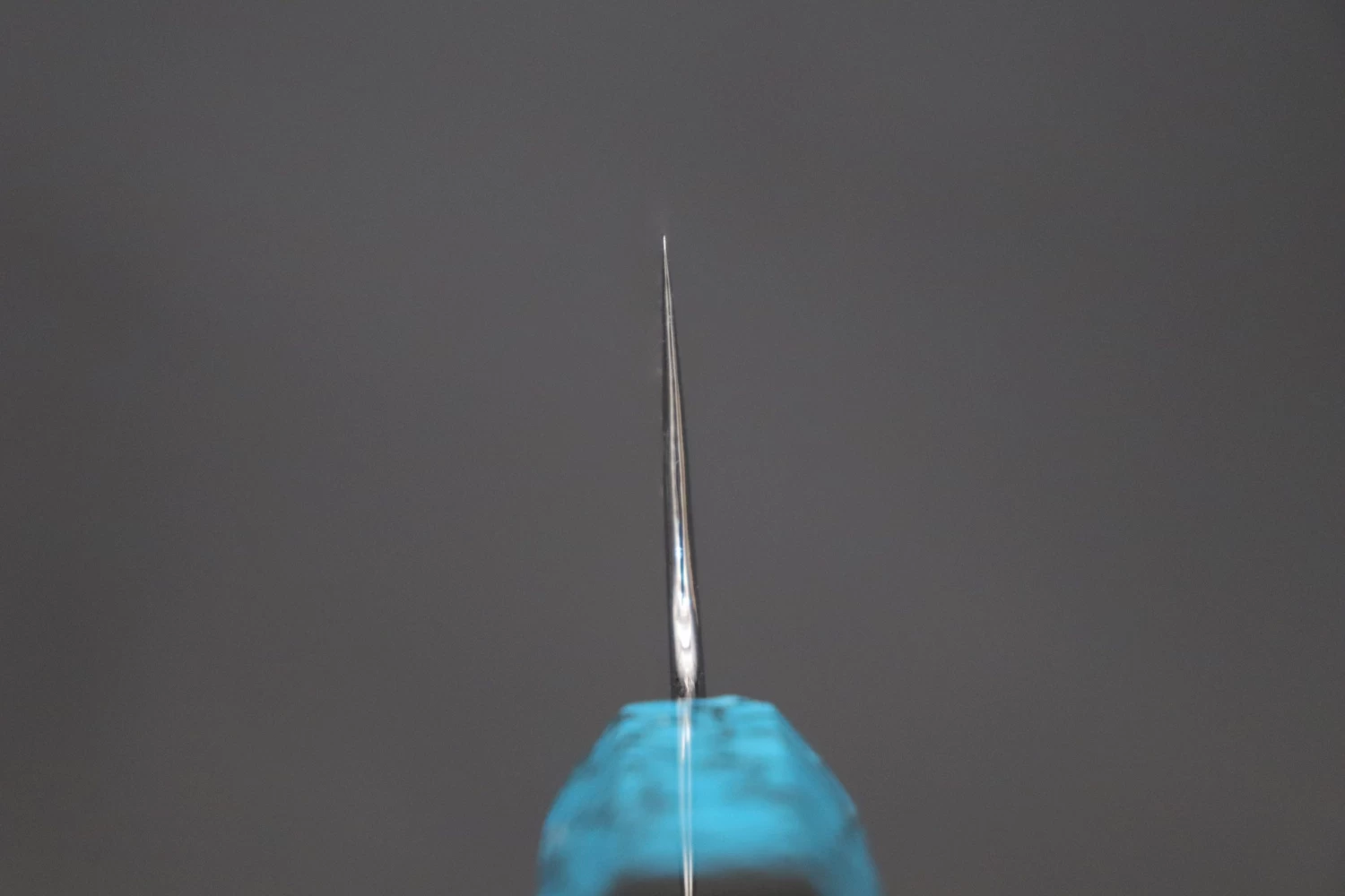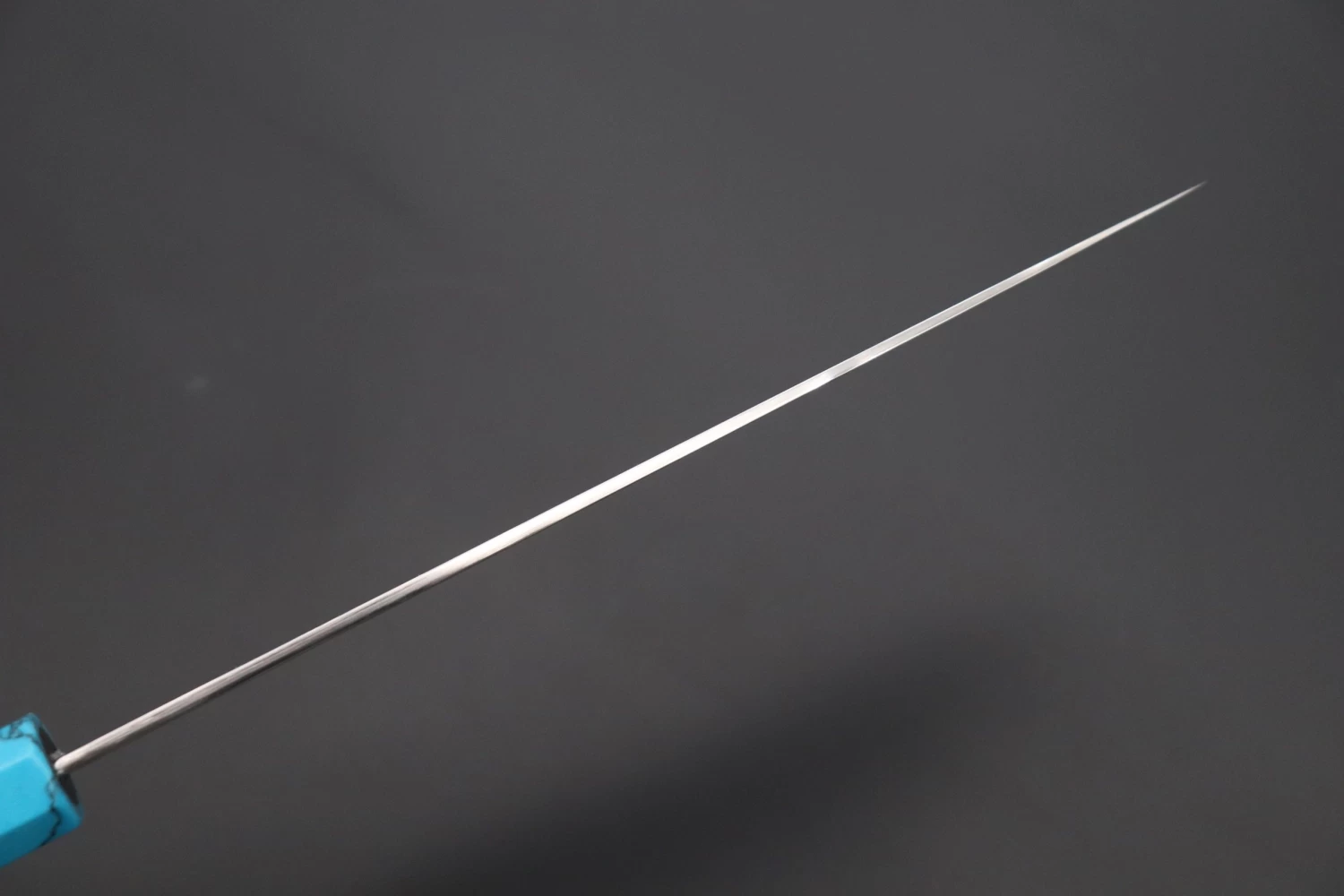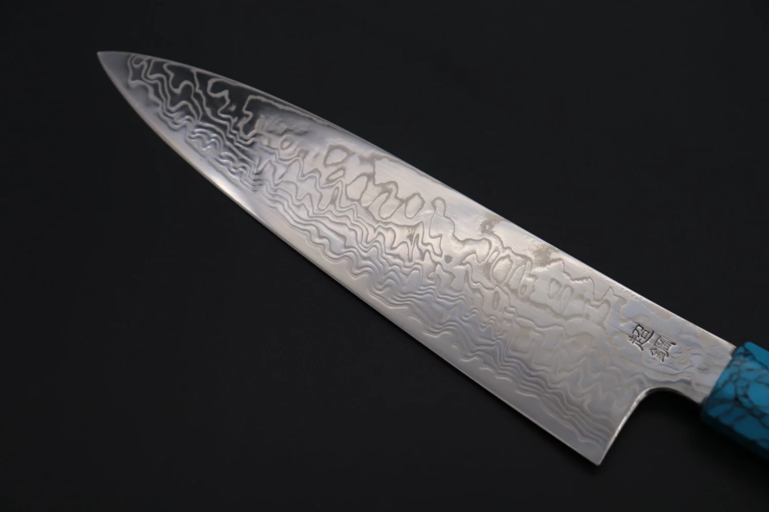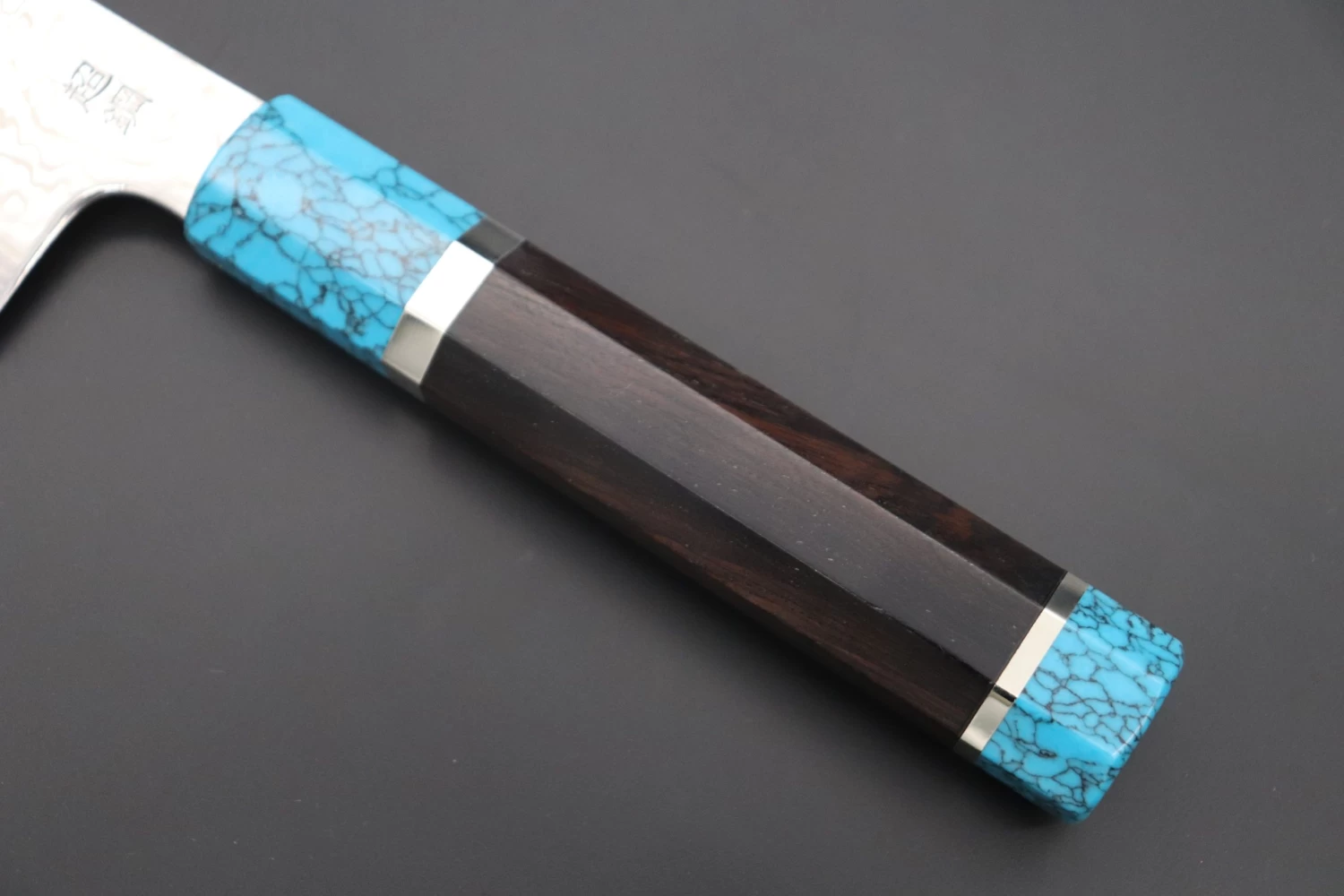 This Sukenari ZDP-189 Nickel Damascus knife is fitted with a Innovative Octagonal Ebonywood handle with a Turquoise Composite Stone Ferrule & Butt with Nickel Silver Spacers. For safekeeping, this knife comes with a matching Black Lacquered wood Saya (Sheath) with a black pakkawood Saya pin.