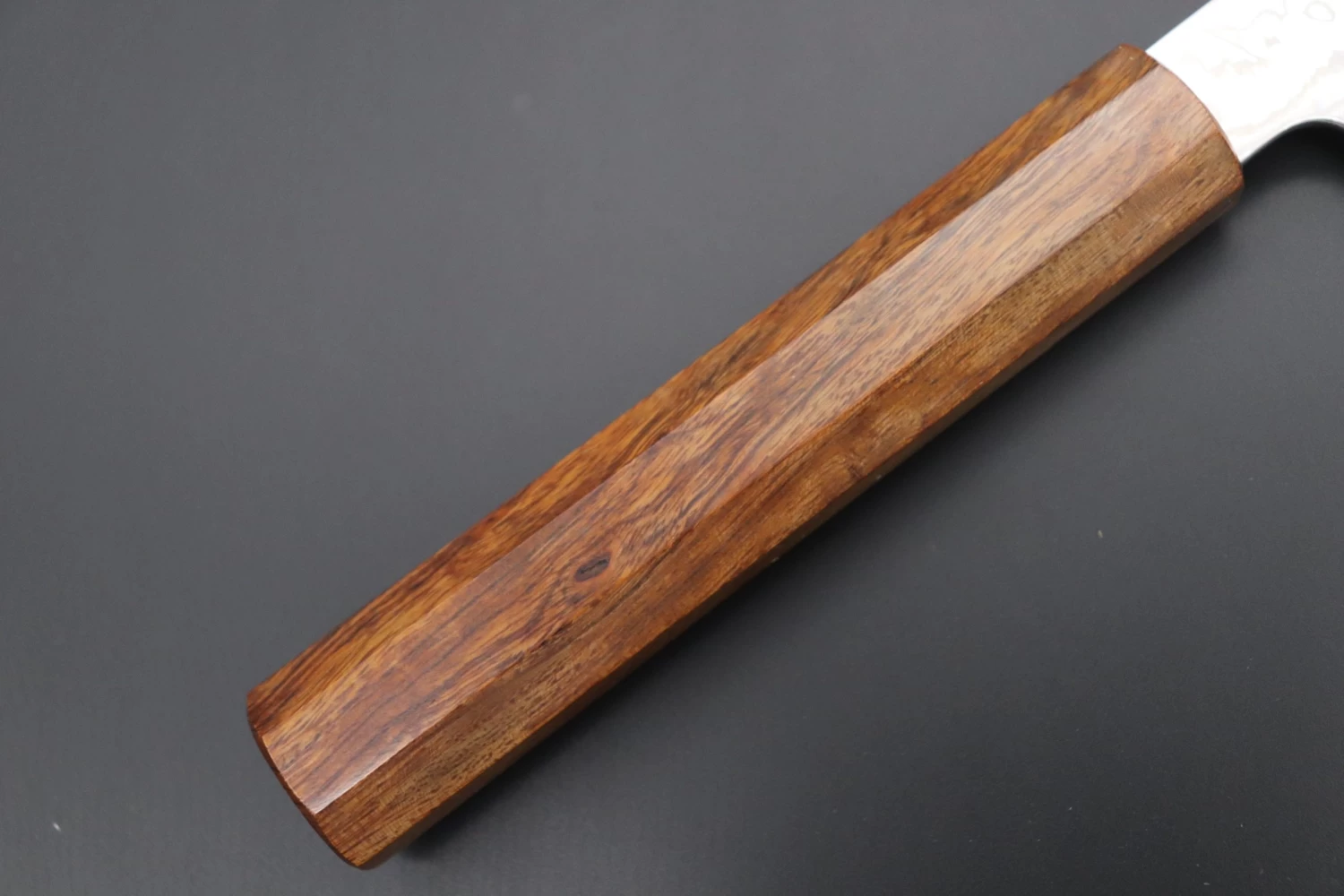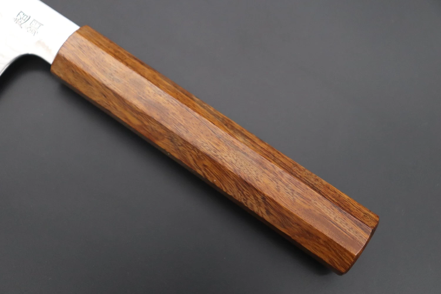 This Sukenari ZDP-189 Nickel Damascus knife is fitted with a Innovative Octagonal Desert Ironwood Handle. For safekeeping, this knife comes with a matching Black Lacquered wood Saya (Sheath) with a black pakkawood Saya pin.