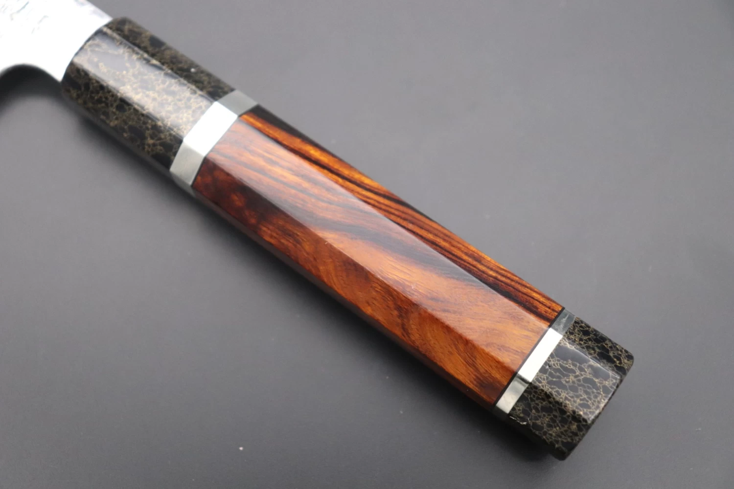 This Sukenari ZDP-189 Nickel Damascus knife is fitted with a Innovative Octagonal Desert Ironwood handle with a Black-Golden-Color Turquoise Composite Stone Ferrule & Butt with Nickel Silver Spacers. For safekeeping, this knife comes with a matching Black Lacquered wood Saya (Sheath) with a black pakkawood Saya pin.