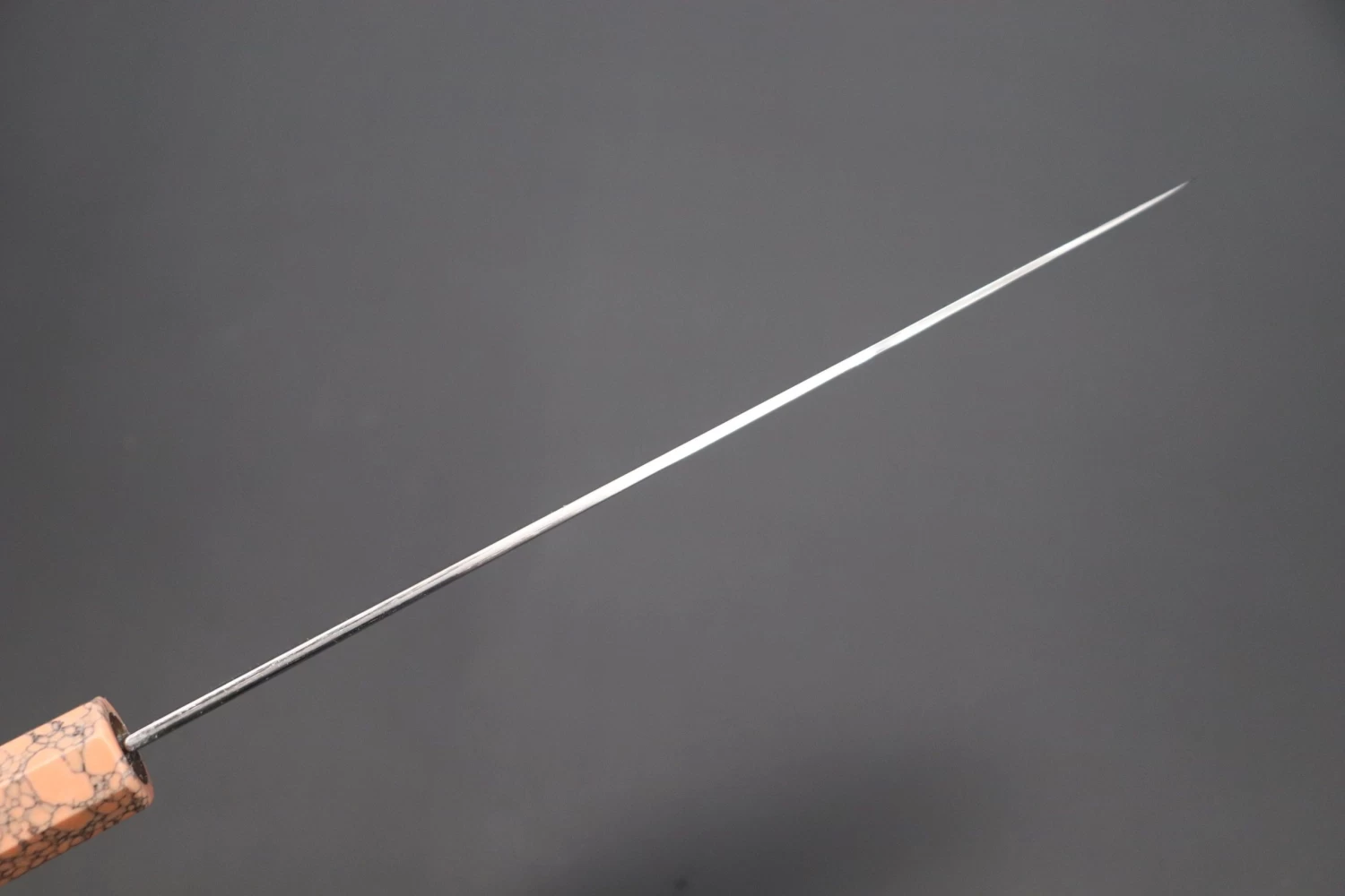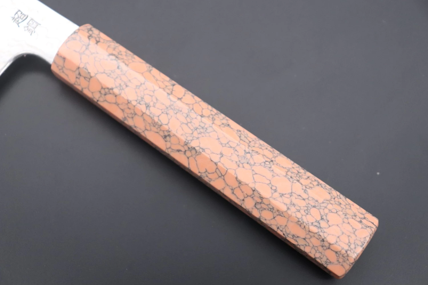 This Sukenari ZDP-189 Nickel Damascus knife is fitted with a Innovative Octagonal Soft Pink Turquoise Composite Stone Handle. For safekeeping, this knife comes with a matching Black Lacquered wood Saya (Sheath) with a black pakkawood Saya pin.