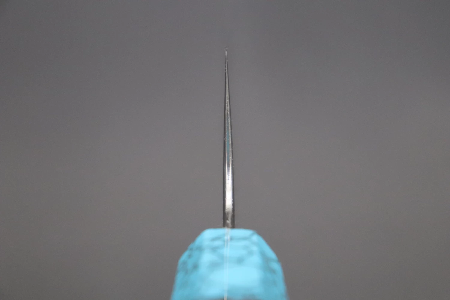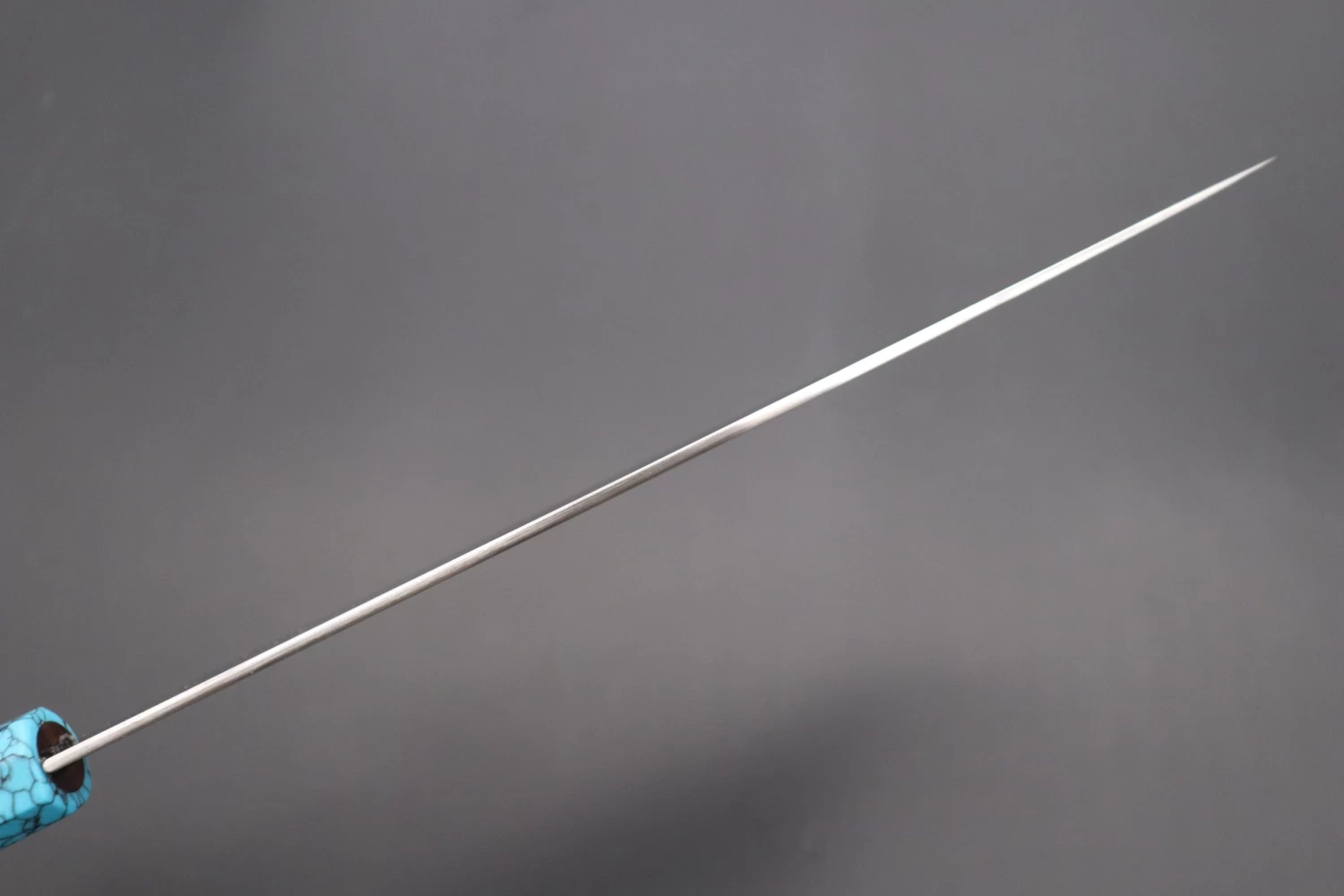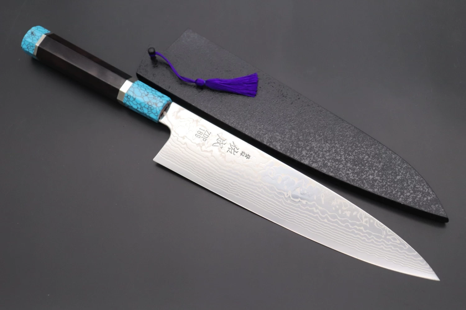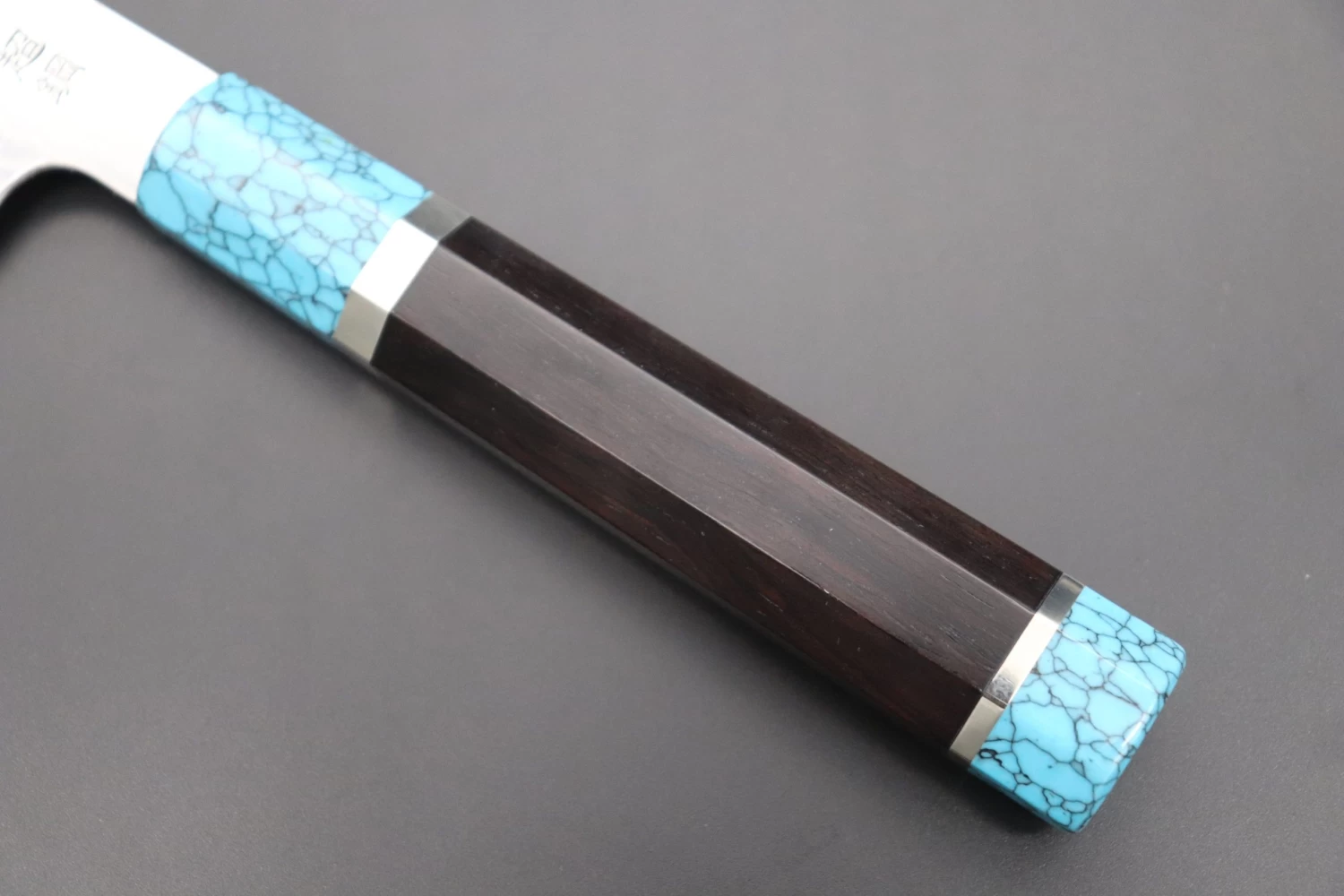This Sukenari ZDP-189 Nickel Damascus knife is fitted with a Innovative Octagonal Ebonywood handle with a Turquoise Composite Stone Ferrule & Butt with Nickel Silver Spacers. For safekeeping, this knife comes with a matching Black Lacquered wood Saya (Sheath) with a black pakkawood Saya pin.