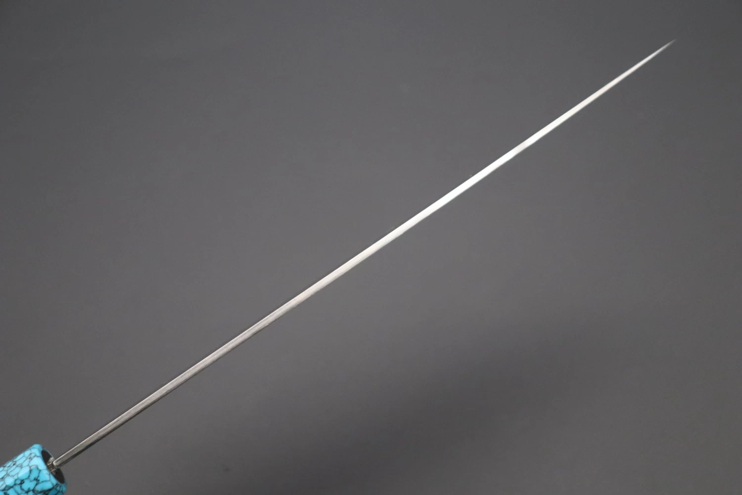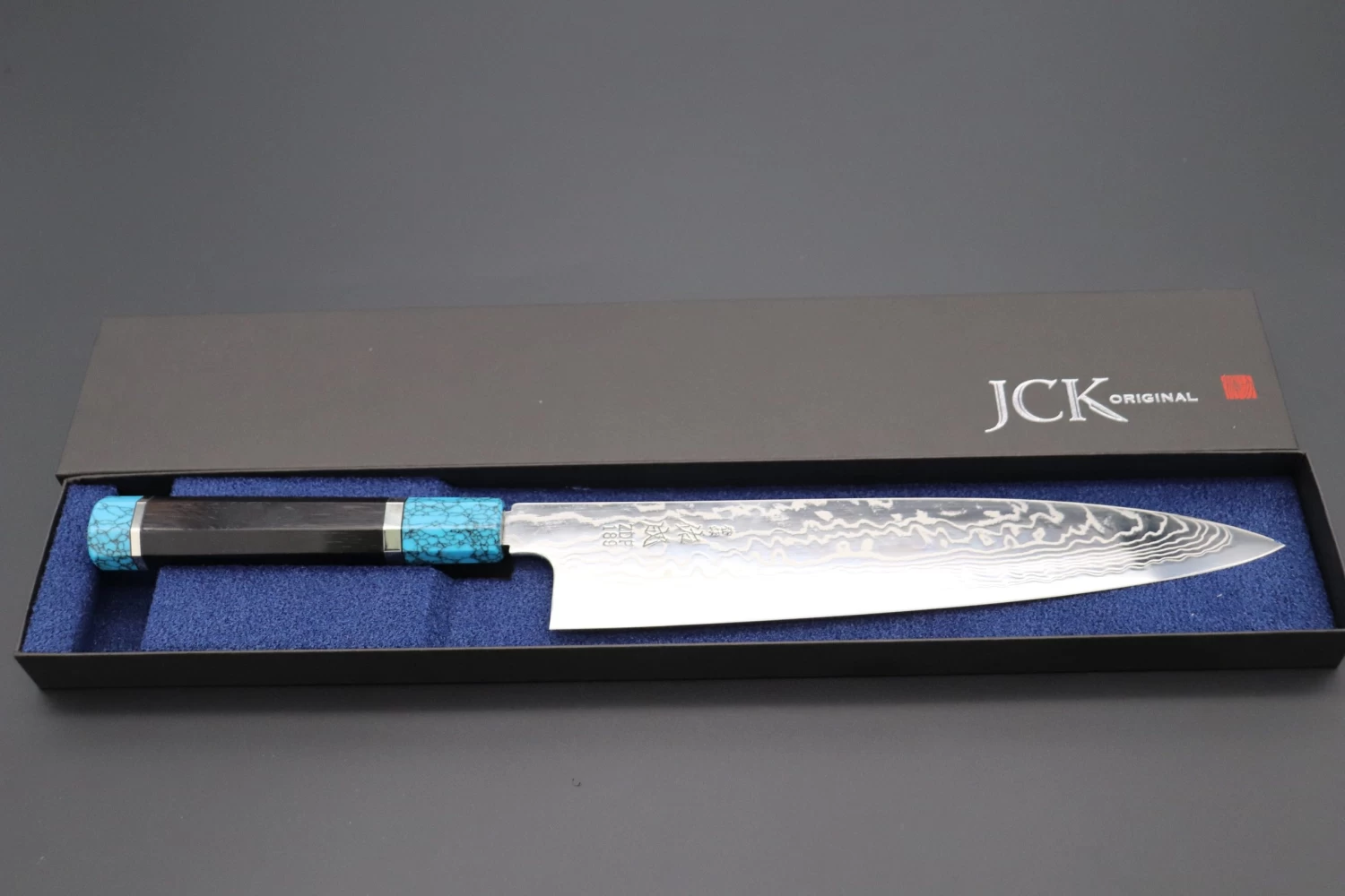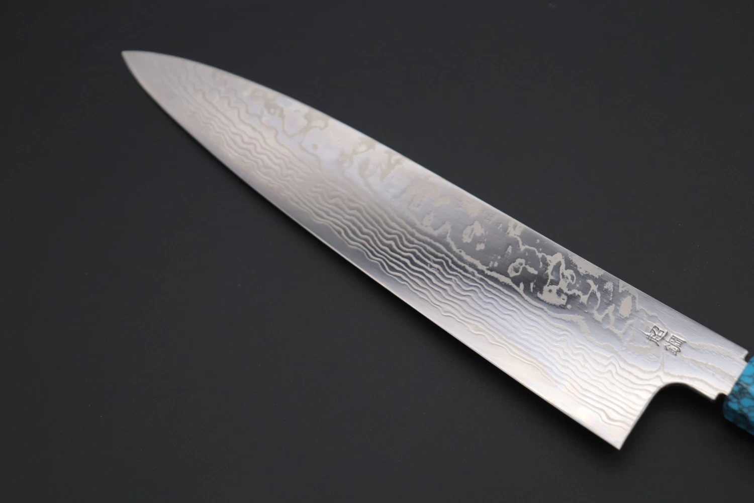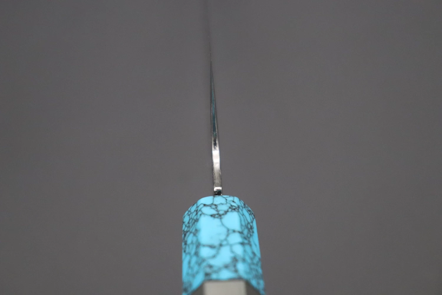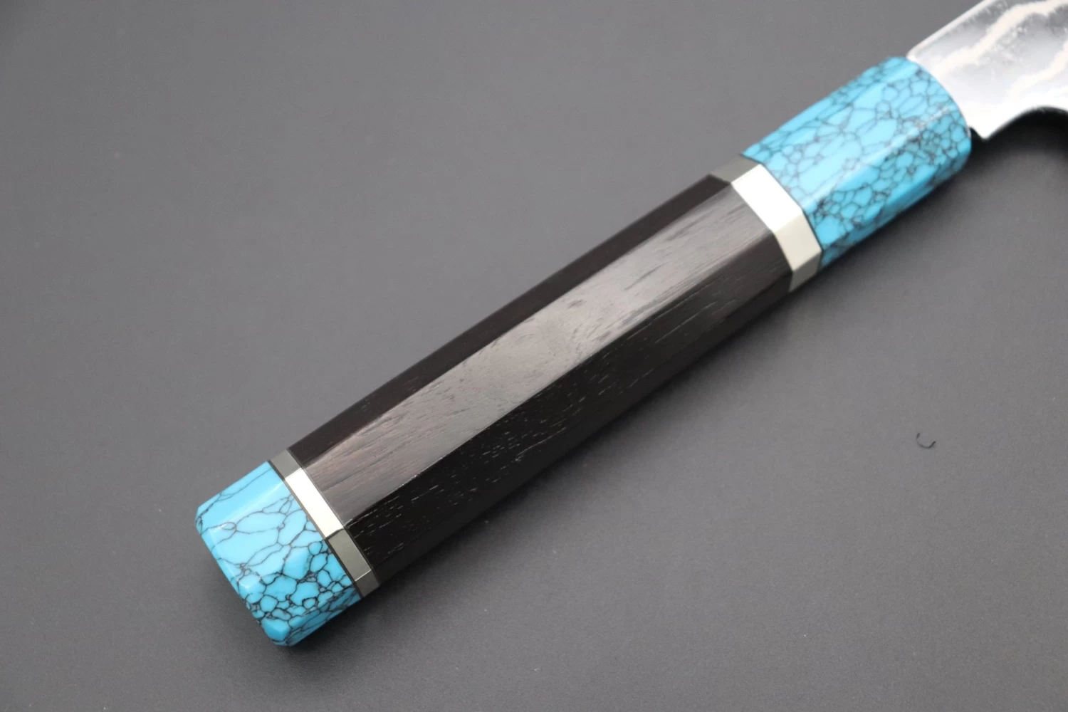 This Sukenari ZDP-189 Nickel Damascus knife is fitted with a Innovative Octagonal Ebony wood handle with a Turquoise Composite Stone Ferrule & Butt with Nickel Silver Spacers. For safekeeping, this knife comes with a matching Black Lacquered wood Saya (Sheath) with a black pakkawood Saya pin.
