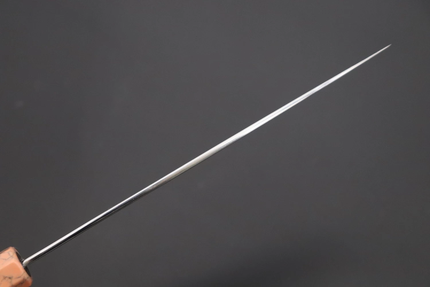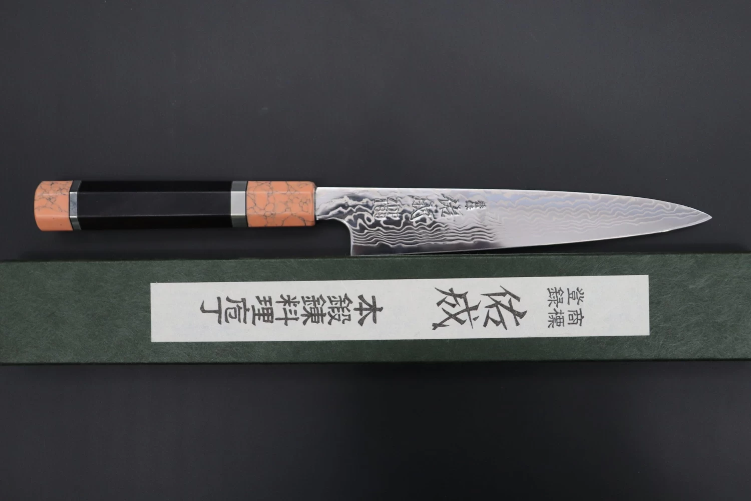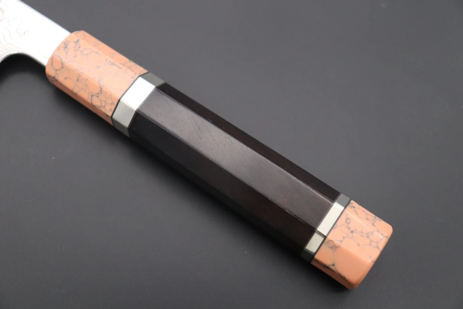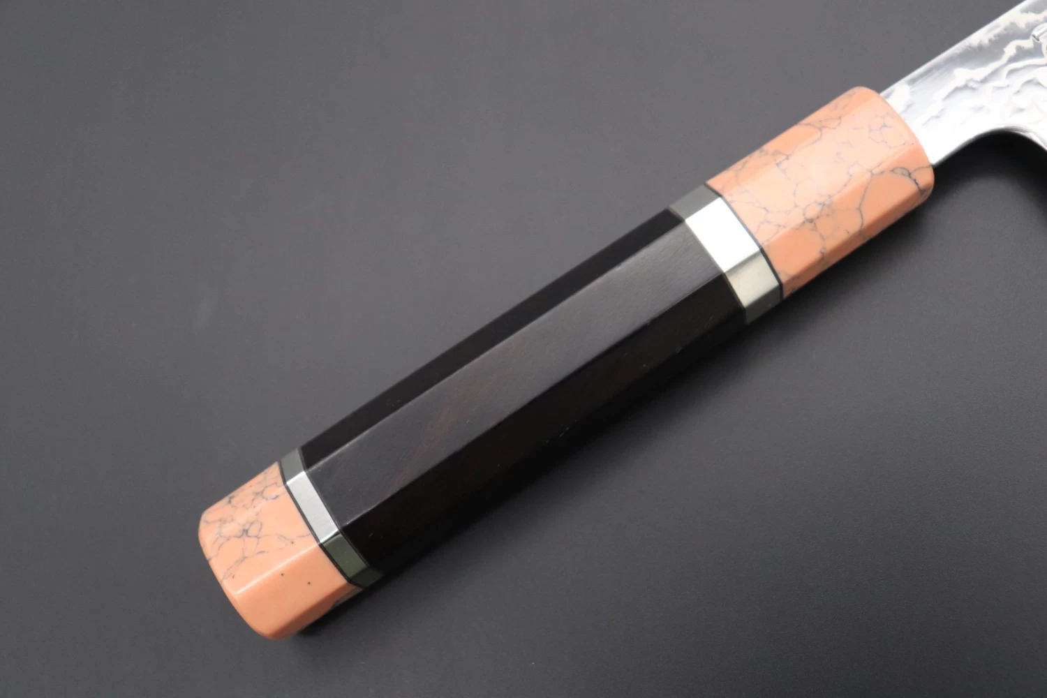 This Sukenari ZDP-189 Nickel Damascus knife is fitted with a Innovative Octagonal Ebonywood handle with a Soft Pink Turquoise Composite Stone Ferrule & Butt with Nickel Silver Spacers. For safekeeping, this knife comes with a matching Magnolia wood Saya (Sheath) with a black pakkawood Saya pin.