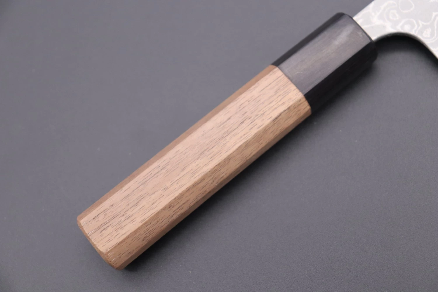 Master Yamamoto’s custom hammer forging process brings out the maximum potential of the premier-quality Japanese Aogami Super Carbon Steel blade core (HRc. 63-64), which is clad with a beautiful Damascus laminate that is made with alternating layers of Aogami Super steel and soft iron. Yamamoto’s trademark “Vortex Damascus” pattern it is clearly distinguishable from other Damascus patterns and it is also our favorite.