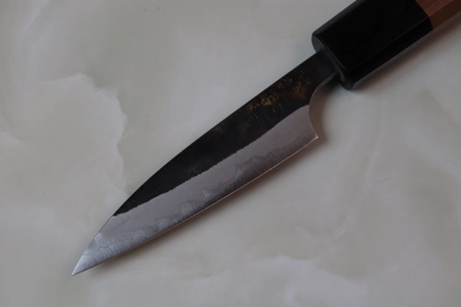 Talented forge-smith Master Yamamoto, of Takefu City, recently finished these unique Kurouchi (“Black-forged”) finished Aogami Super Knives. The blade core is made from Japan’s premium high carbon steel, Hitachi Aogami Super (“Blue Super Steel”) (HRc. 64), is sandwiched between two layers of corrosion-resistant, soft stainless steel – a steel that is not often combined with a Kurouchi finish. Because Aogami Super is somewhat corrosion-resistant, these knives should not require a lot of maintenance. However, please note that the exposed blade core can discolor or rust if it is exposed to acid, salt or water for a long time.