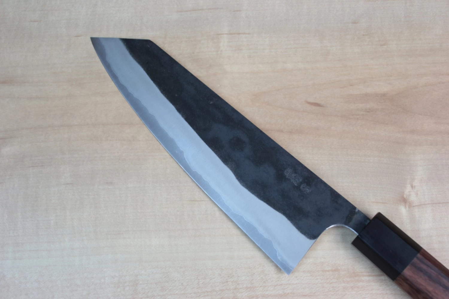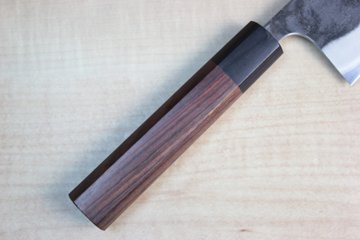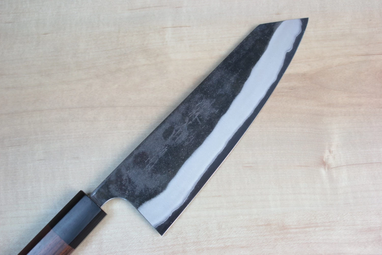 Talented forge-smith Master Yamamoto, of Takefu City, recently finished these unique Kurouchi (“Black-forged”) finished Aogami Super Knives. The blade core is made from Japan’s premium high carbon steel, Hitachi Aogami Super (“Blue Super Steel”) (HRc. 64), is sandwiched between two layers of corrosion-resistant, soft stainless steel – a steel that is not often combined with a Kurouchi finish. Because Aogami Super is somewhat corrosion-resistant, these knives should not require a lot of maintenance. However, please note that the exposed blade core can discolor or rust if it is exposed to acid, salt or water for a long time.