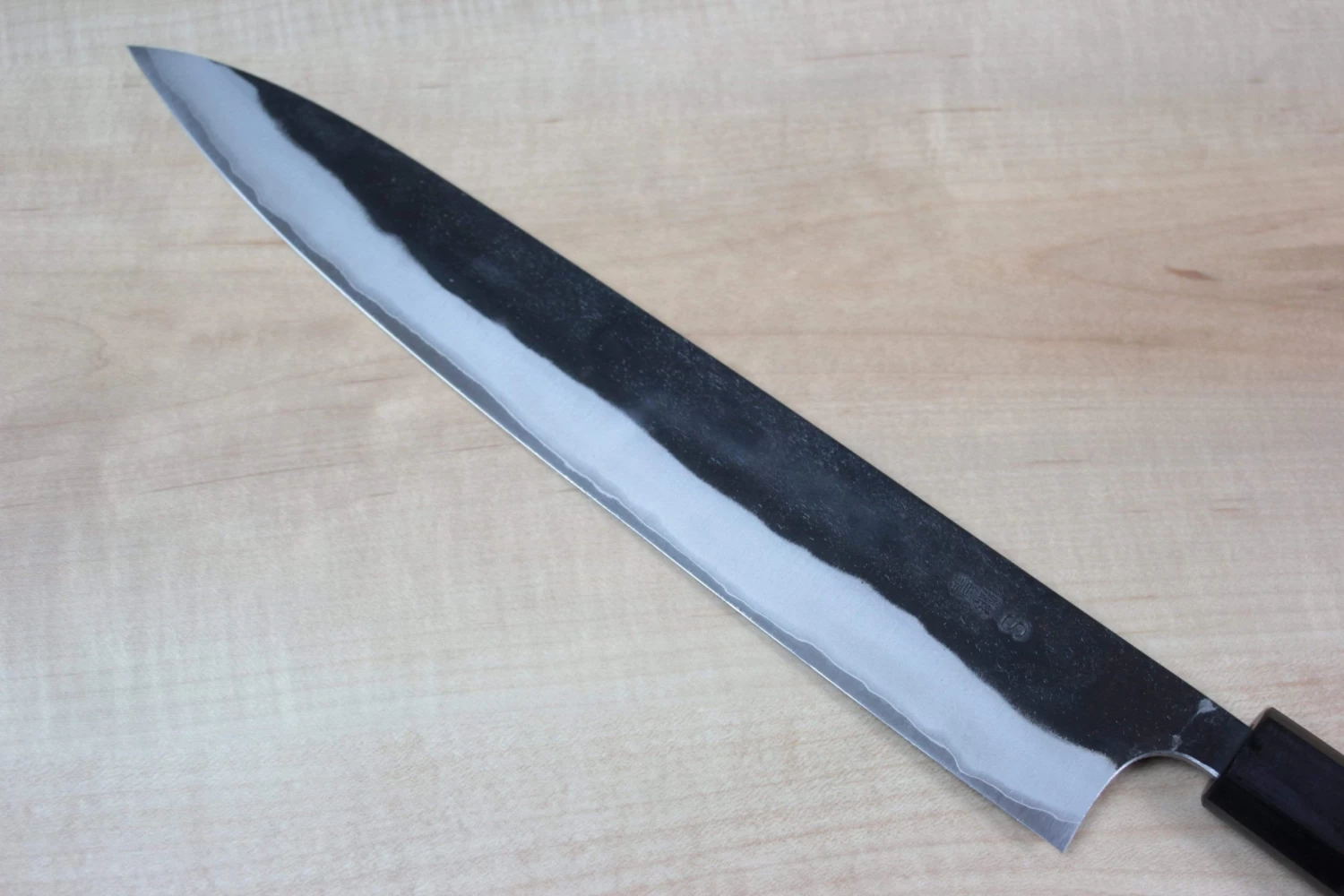 Talented forge-smith Master Yamamoto, of Takefu City, recently finished these unique Kurouchi (“Black-forged”) finished Aogami Super Knives. The blade core is made from Japan’s premium high carbon steel, Hitachi Aogami Super (“Blue Super Steel”) (HRc. 64), is sandwiched between two layers of corrosion-resistant, soft stainless steel – a steel that is not often combined with a Kurouchi finish. Because Aogami Super is somewhat corrosion-resistant, these knives should not require a lot of maintenance. However, please note that the exposed blade core can discolor or rust if it is exposed to acid, salt or water for a long time.