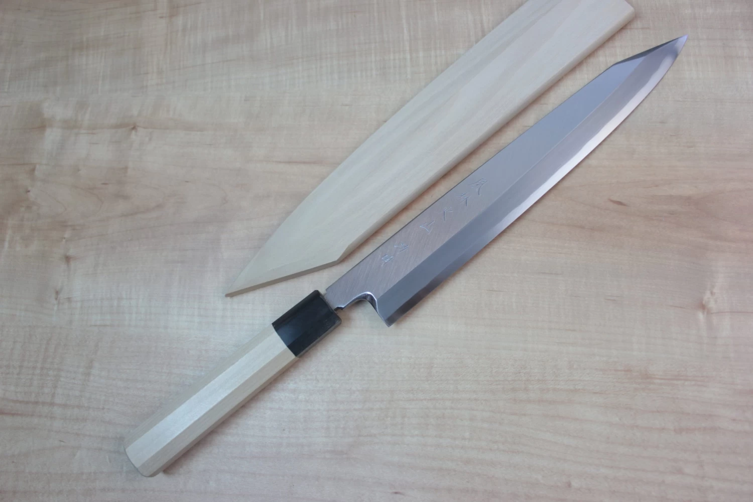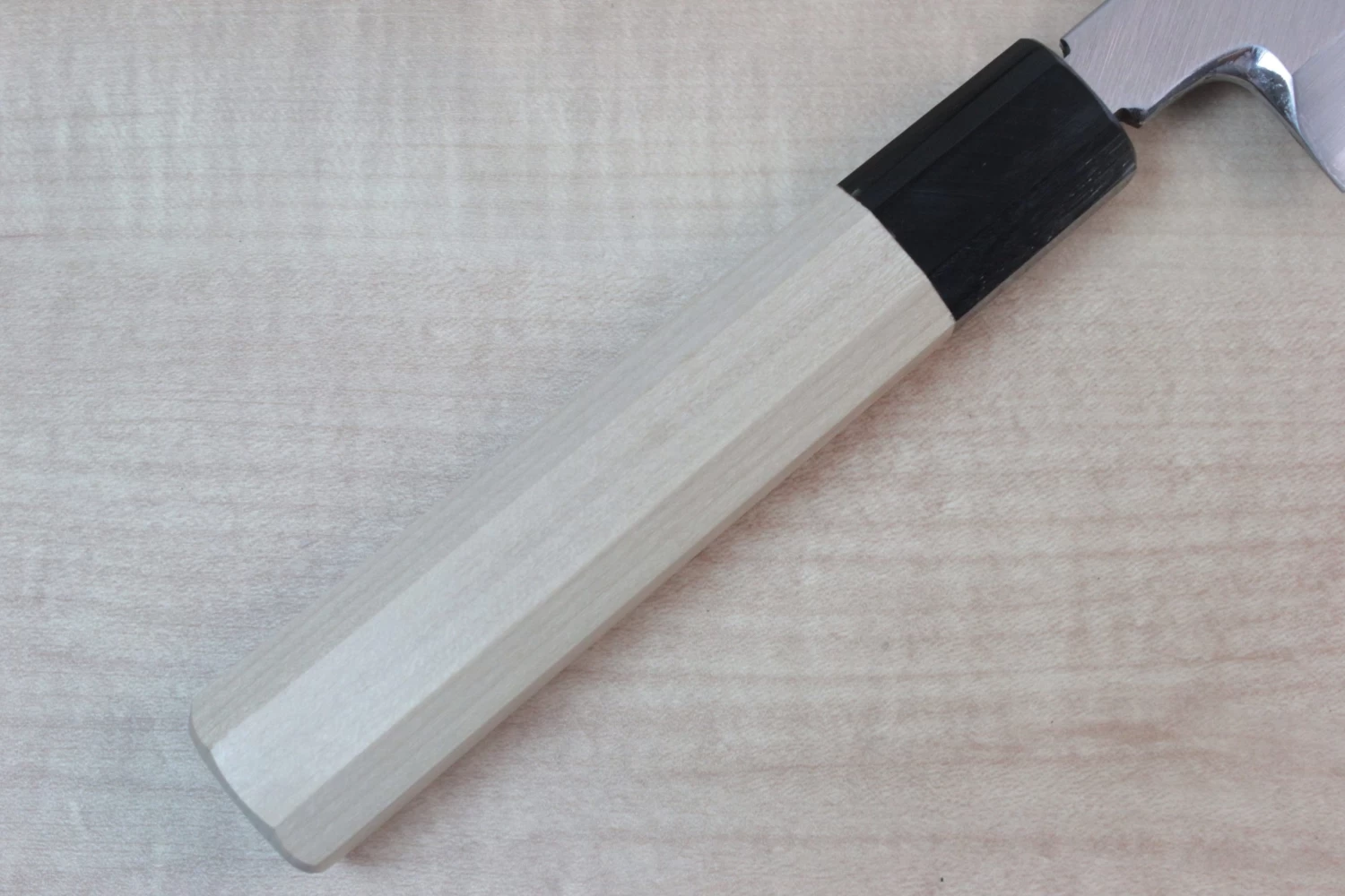 This knife comes with a comfortable octagonal magnolia wood handle with black water buffalo horn ferrule / bolster, and includes a matching magnolia wood Saya (“Sheath”) -with black pakkawood saya pin- for safekeeping.