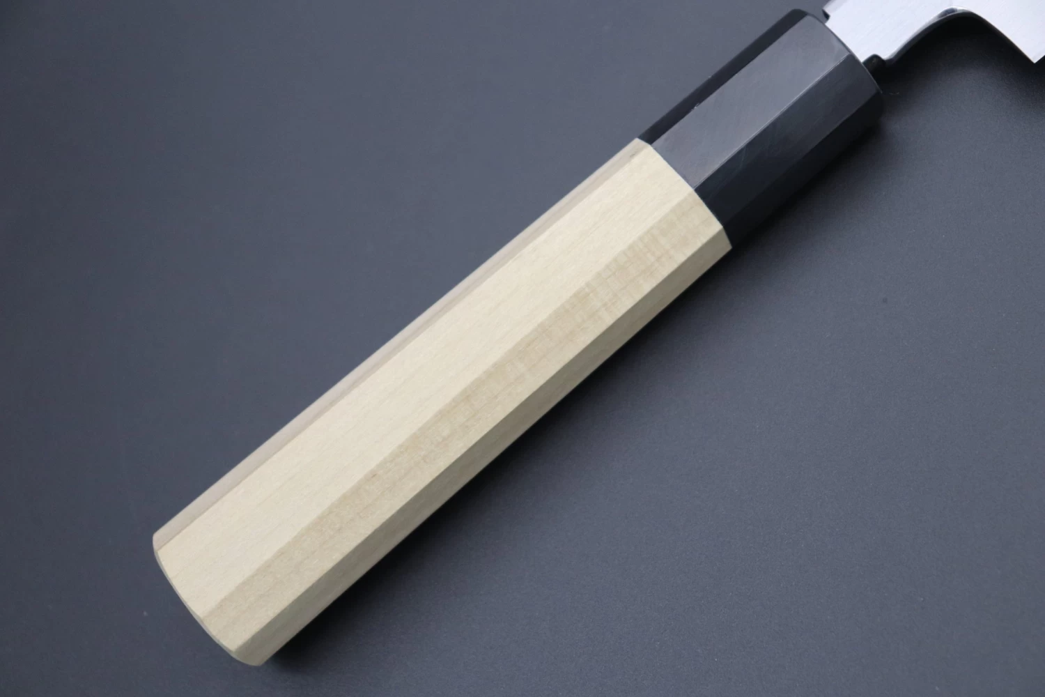 This knife comes with a comfortable octagonal magnolia wood handle with black water buffalo horn ferrule / bolster, and includes a matching magnolia wood Saya (“Sheath”) -with black pakkawood saya pin- for safekeeping.
