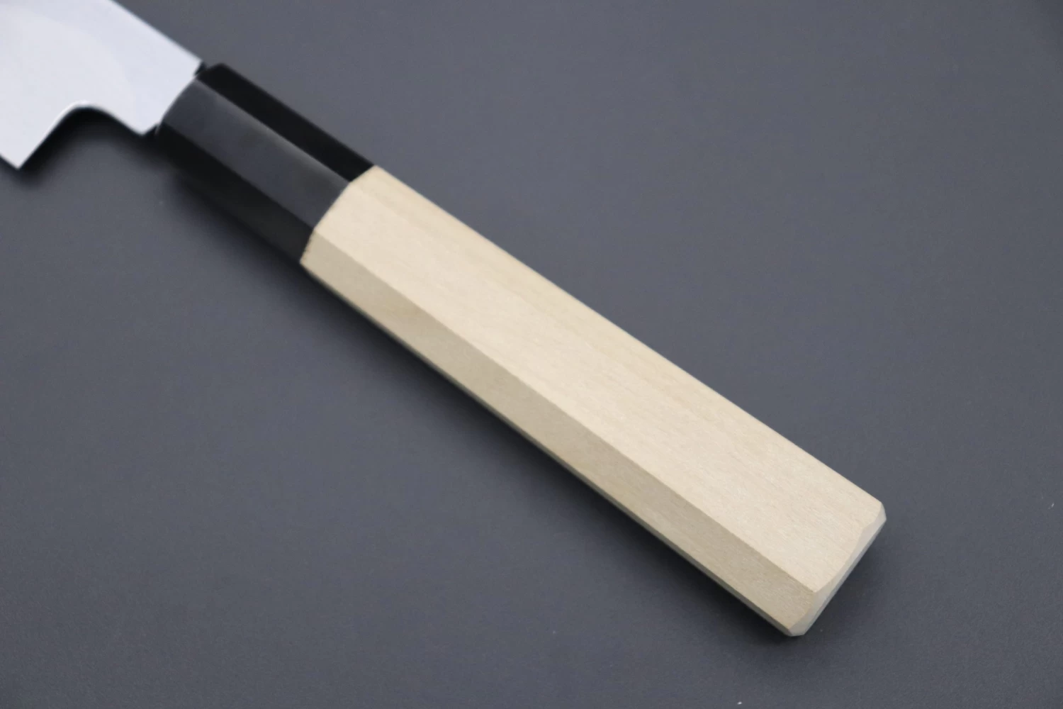 This knife comes with a comfortable octagonal magnolia wood handle with black water buffalo horn ferrule / bolster, and includes a matching magnolia wood Saya (“Sheath”) -with black pakkawood saya pin- for safekeeping.