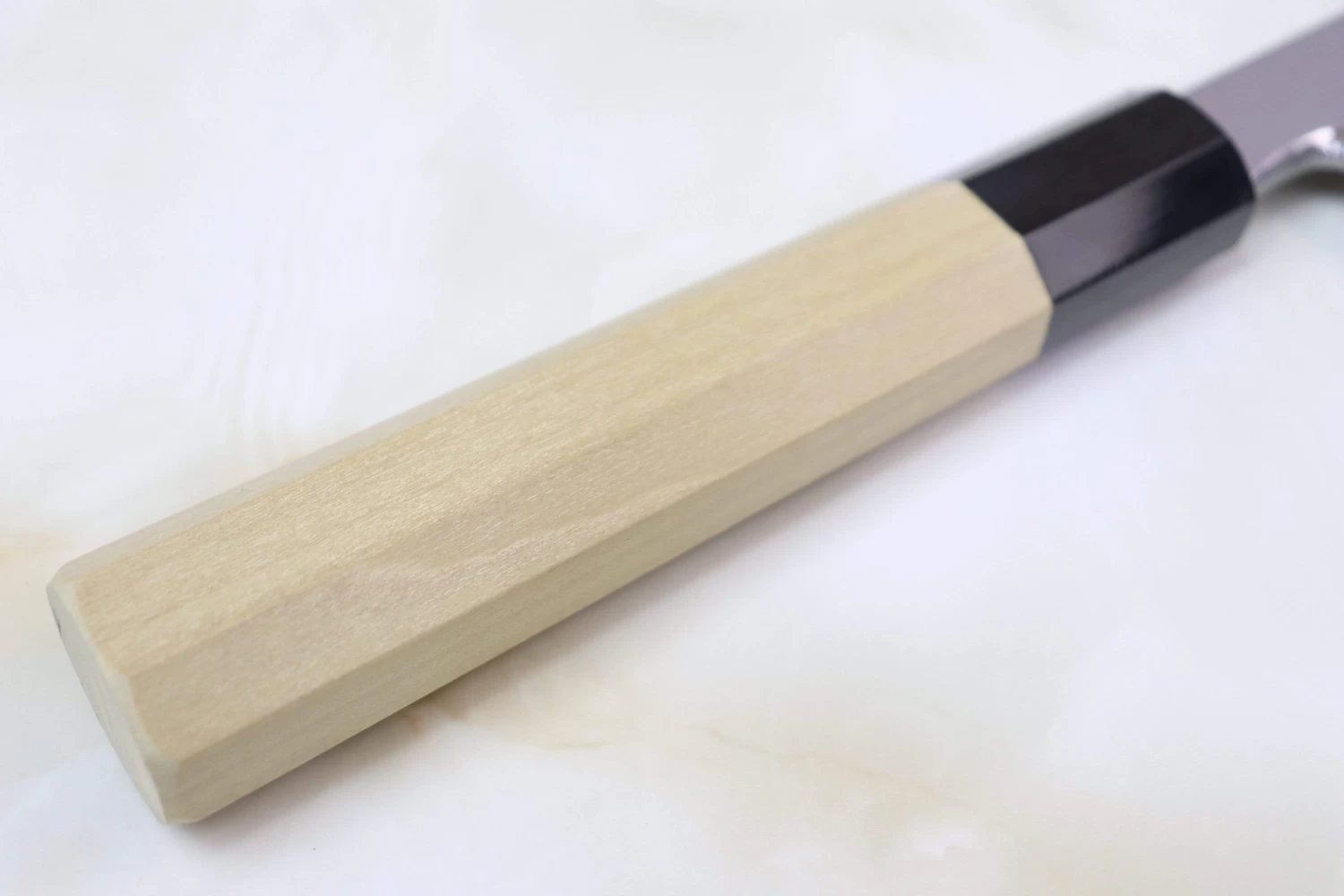This knife comes with a comfortable octagonal magnolia wood handle with black water buffalo horn ferrule / bolster, and includes a matching magnolia wood Saya (“Sheath”) -with black pakkawood saya pin- for safekeeping.