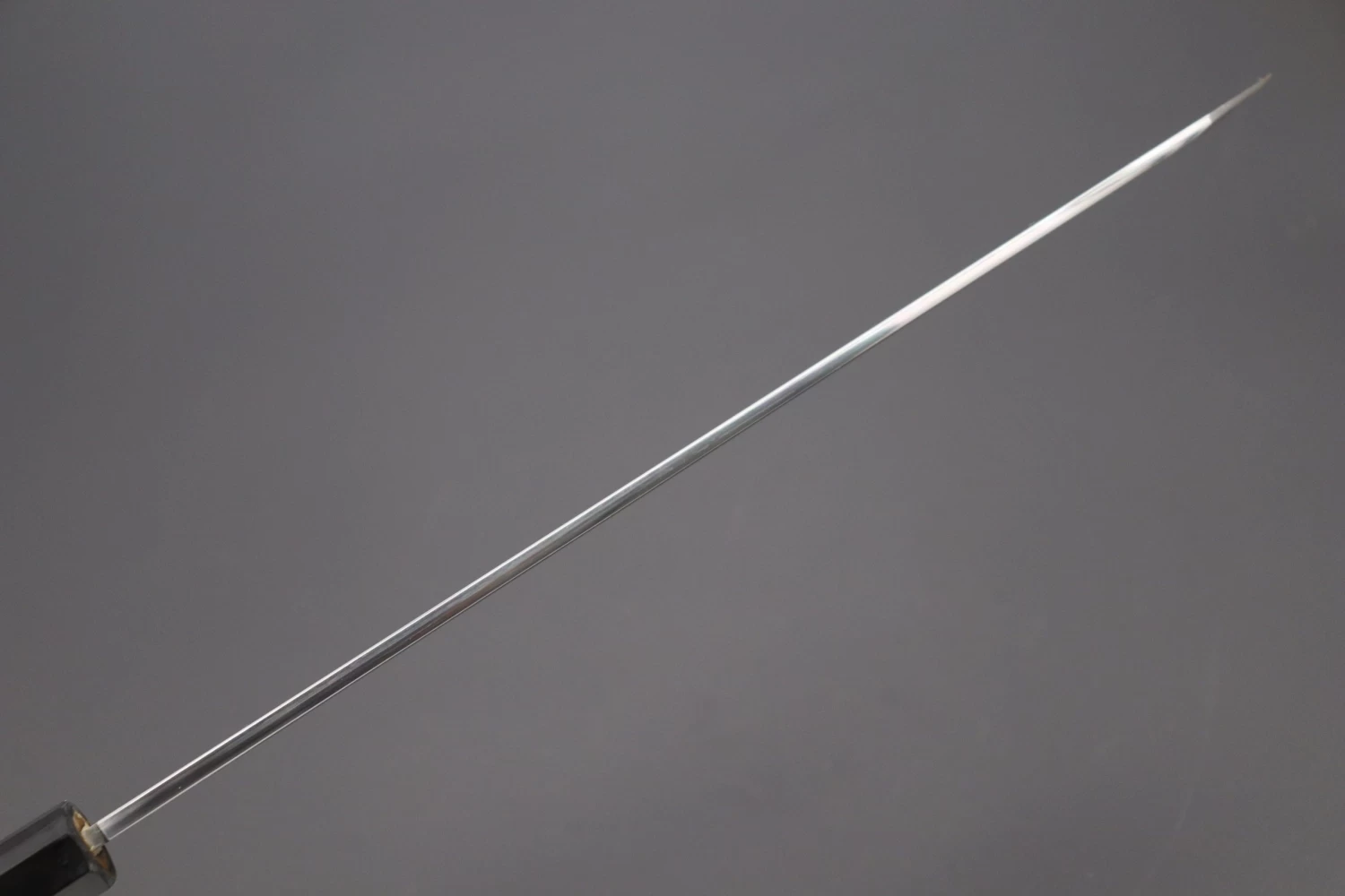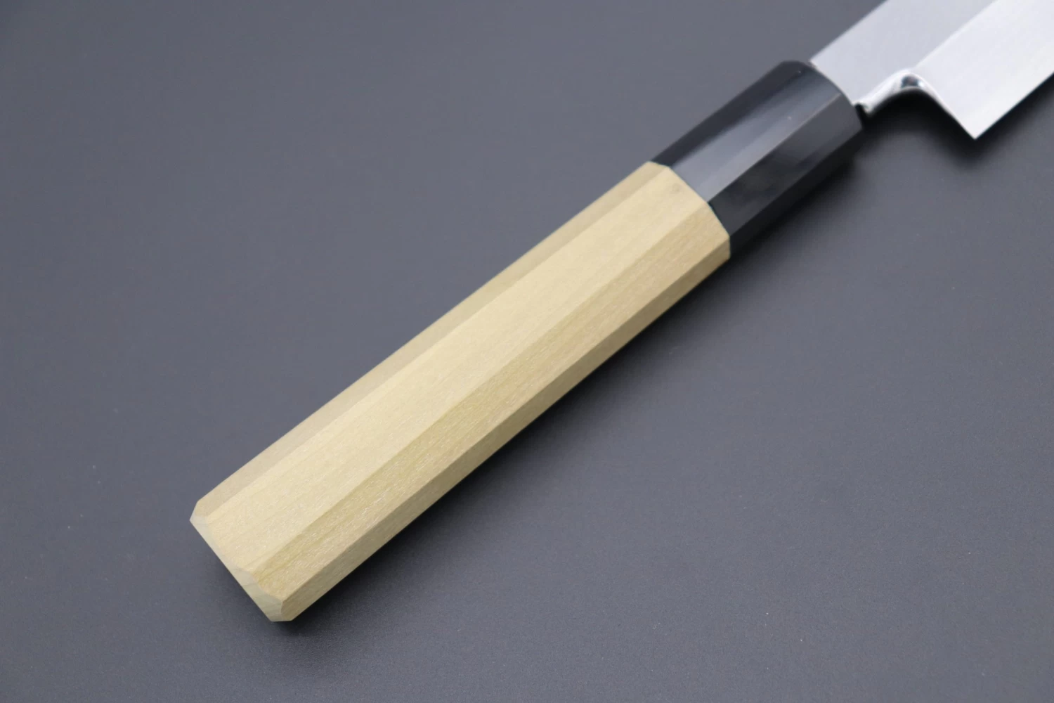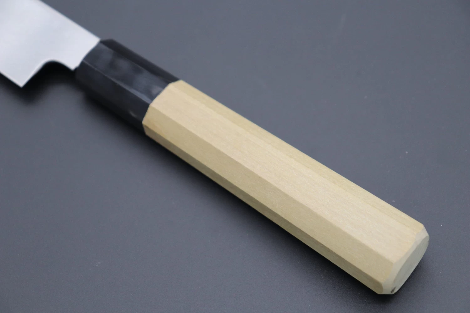 This knife comes with a comfortable octagonal magnolia wood handle with black water buffalo horn ferrule / bolster, and includes a matching magnolia wood Saya (“Sheath”) -with black pakkawood saya pin- for safekeeping.