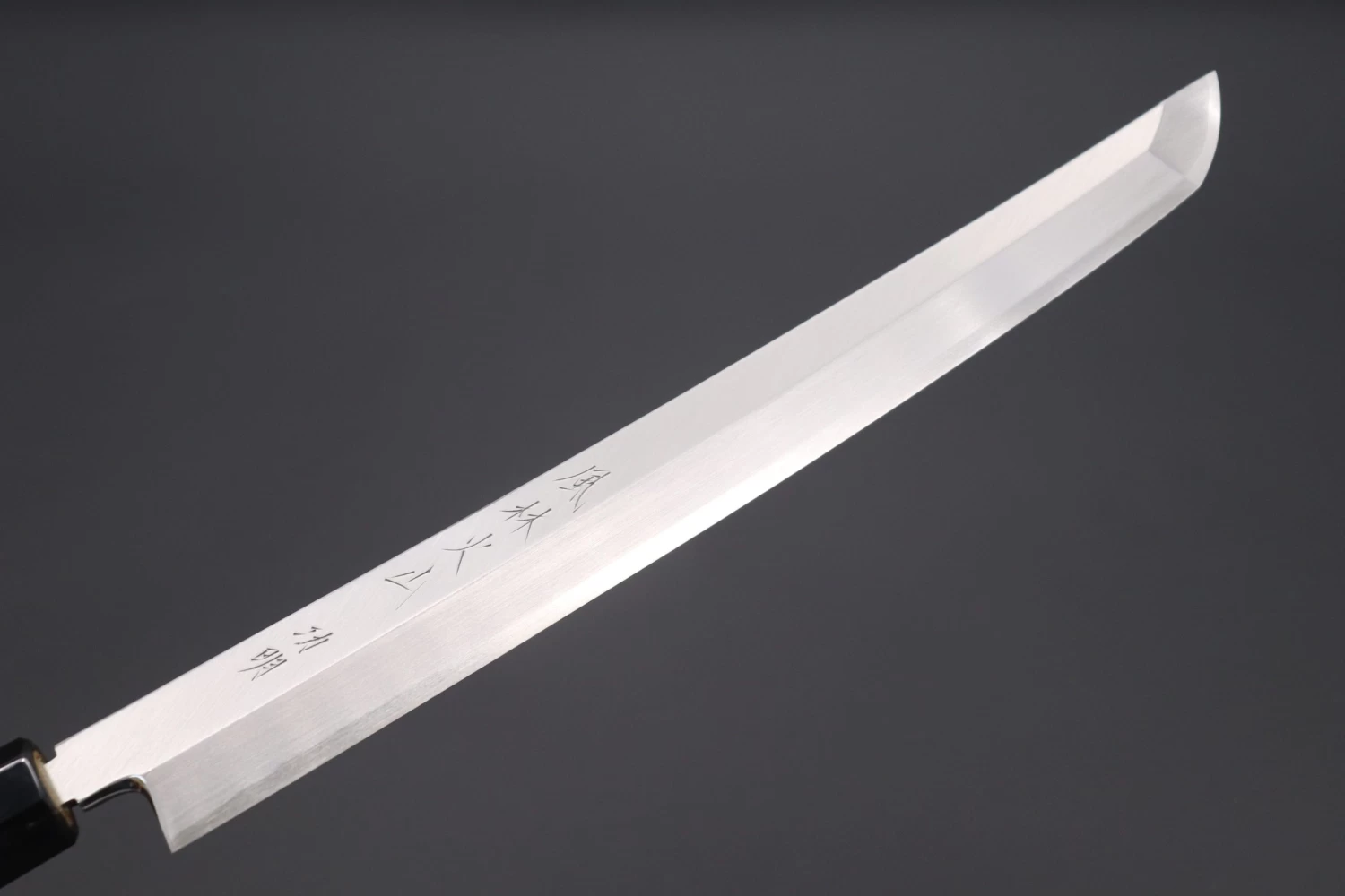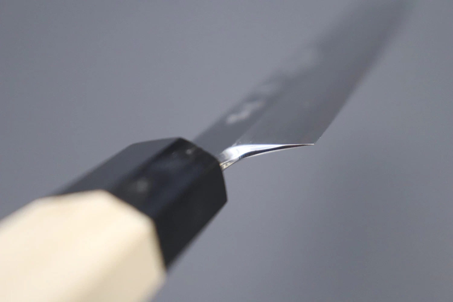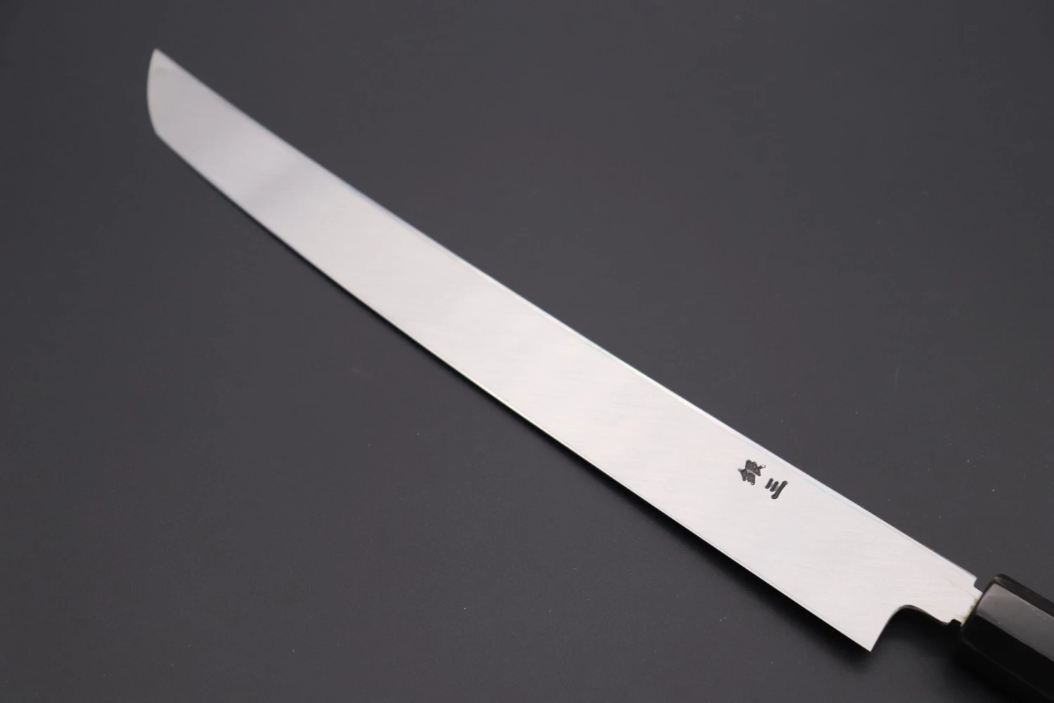 The Sakimaru Takohiki is a variation of the Yanagiba and Takohiki, and is used for much the same purposes. Sakimaru Takohiki are easily identifiable by their blade tips, which look similar to that of a Katana. Their blades have a straight spine similar to the Takohiki, and a slightly curved edge like the Yanagiba, resulting in a knife which looks somewhat like a combination of the two.
