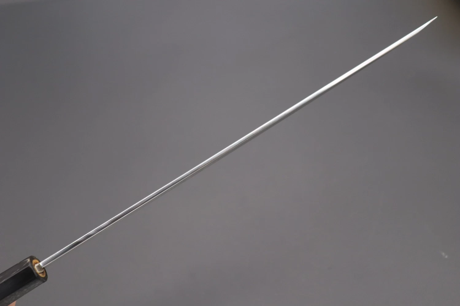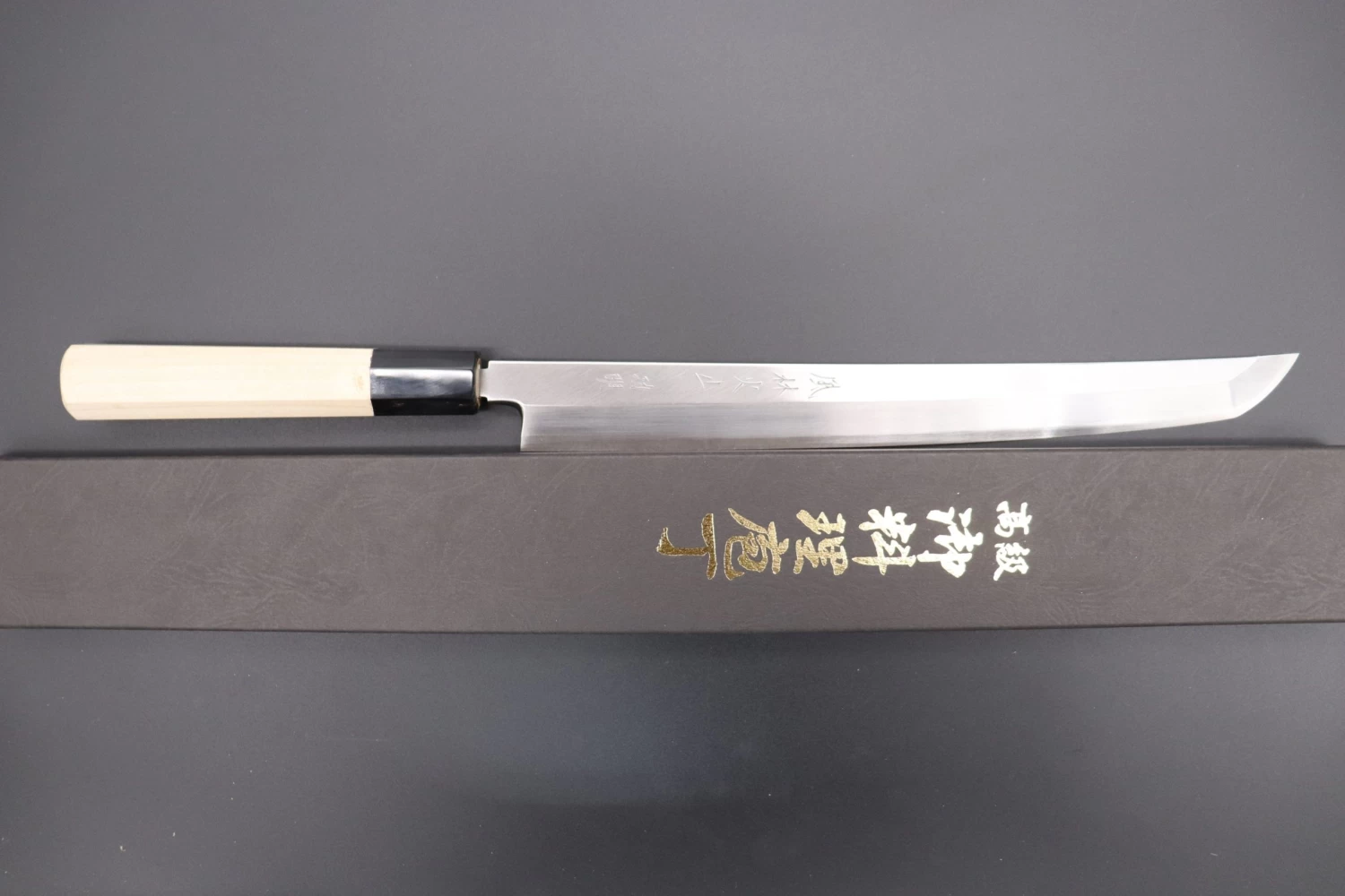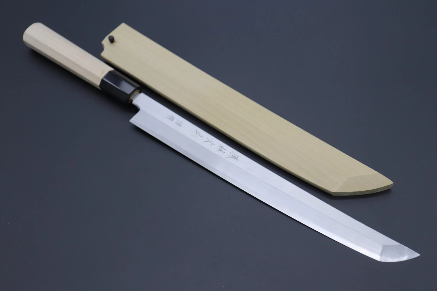 The Sakimaru Takohiki is a variation of the Yanagiba and Takohiki, and is used for much the same purposes. Sakimaru Takohiki are easily identifiable by their blade tips, which look similar to that of a Katana. Their blades have a straight spine similar to the Takohiki, and a slightly curved edge like the Yanagiba, resulting in a knife which looks somewhat like a combination of the two.