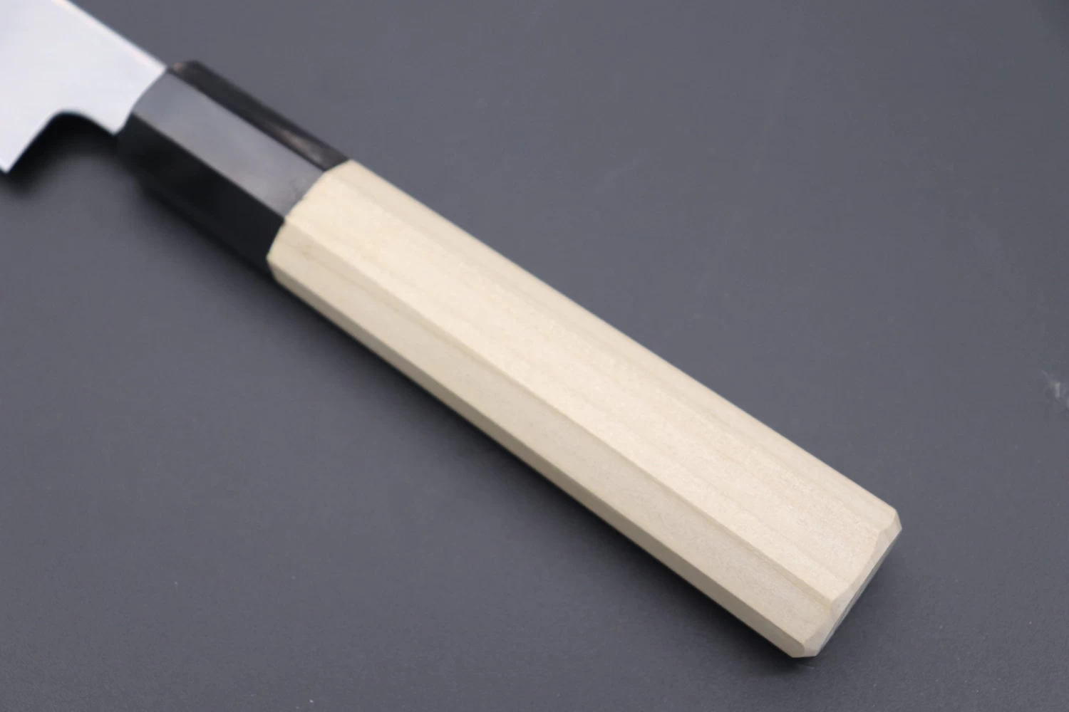 This knife comes with a comfortable octagonal magnolia wood handle with black water buffalo horn ferrule / bolster, and includes a matching magnolia wood Saya (“Sheath”) -with black pakkawood saya pin- for safekeeping.