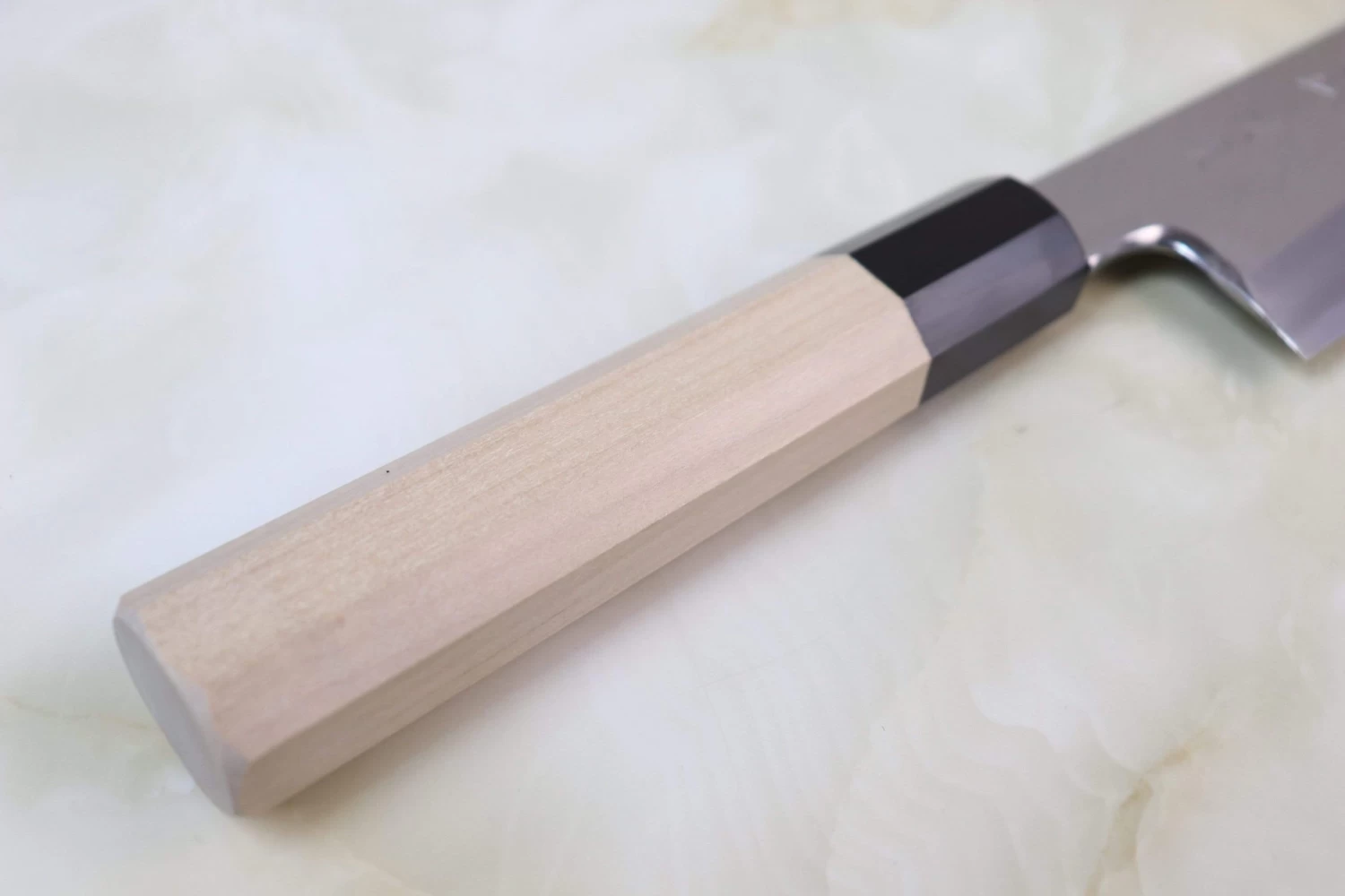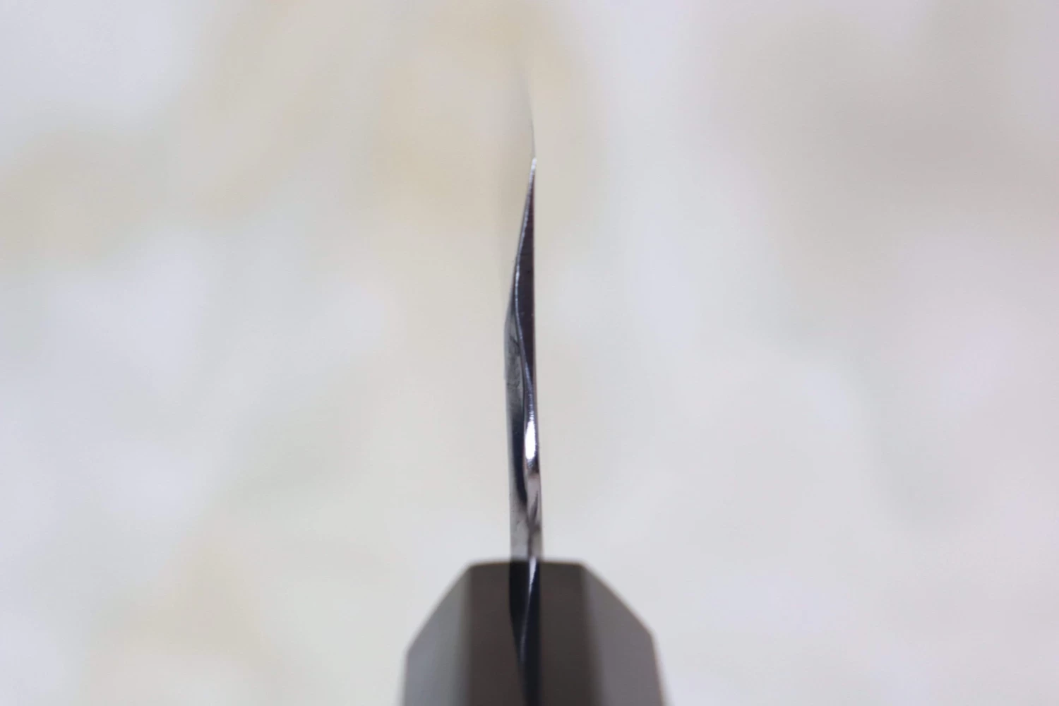 - No compromises are made during the finishing and fitting of the blade and handle. Particular attention is paid to the spine, the finger choil / heel, and the gap between the blade tang and the handle (The “Machi”). This extra work is not just important for the overall appearance of the knife; it also allows a more comfortable grip and provides a more secure handle. As a result, these knives are perfect for customers who care about both the aesthetic appearance and the functionality of their knives.