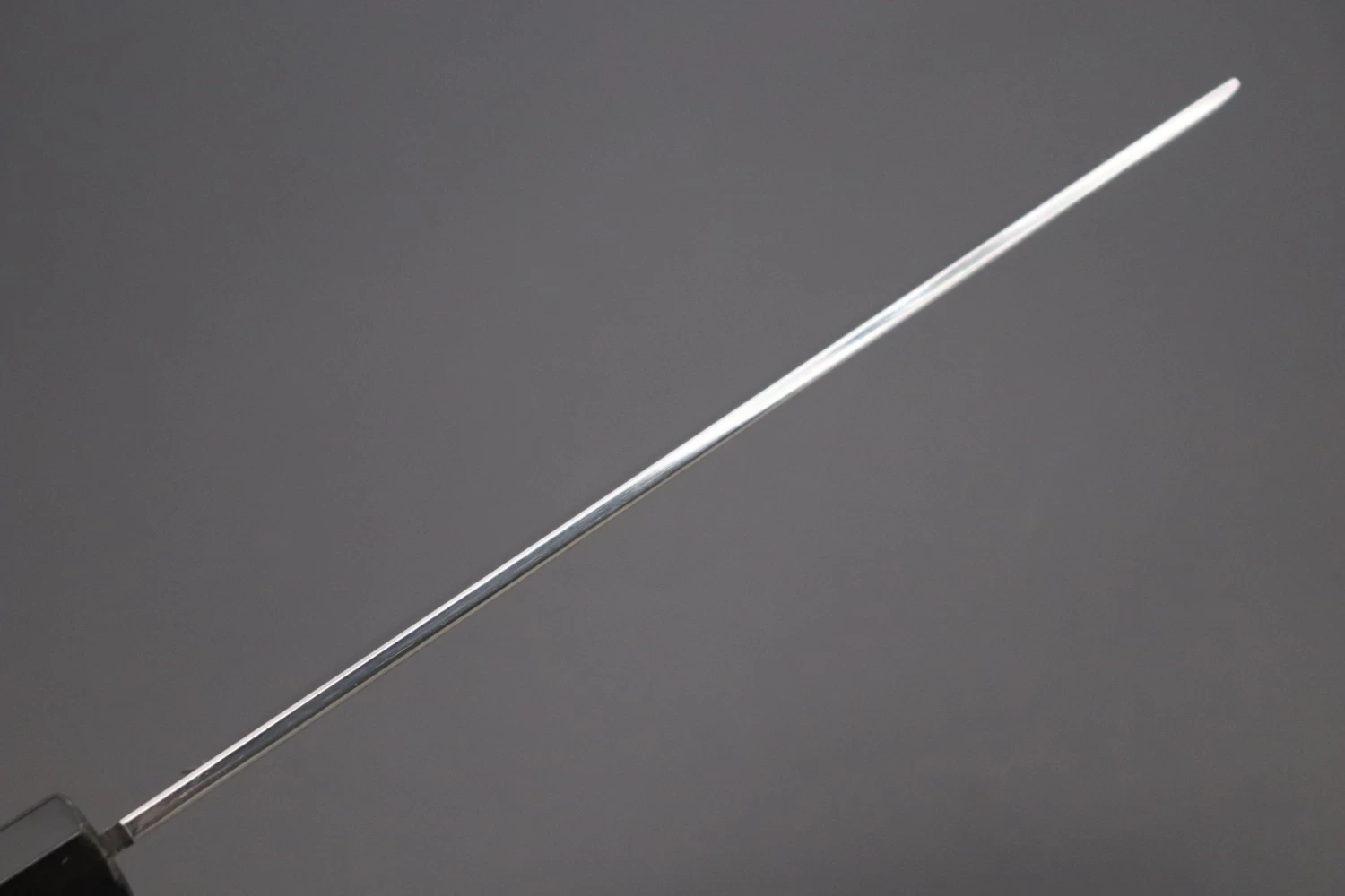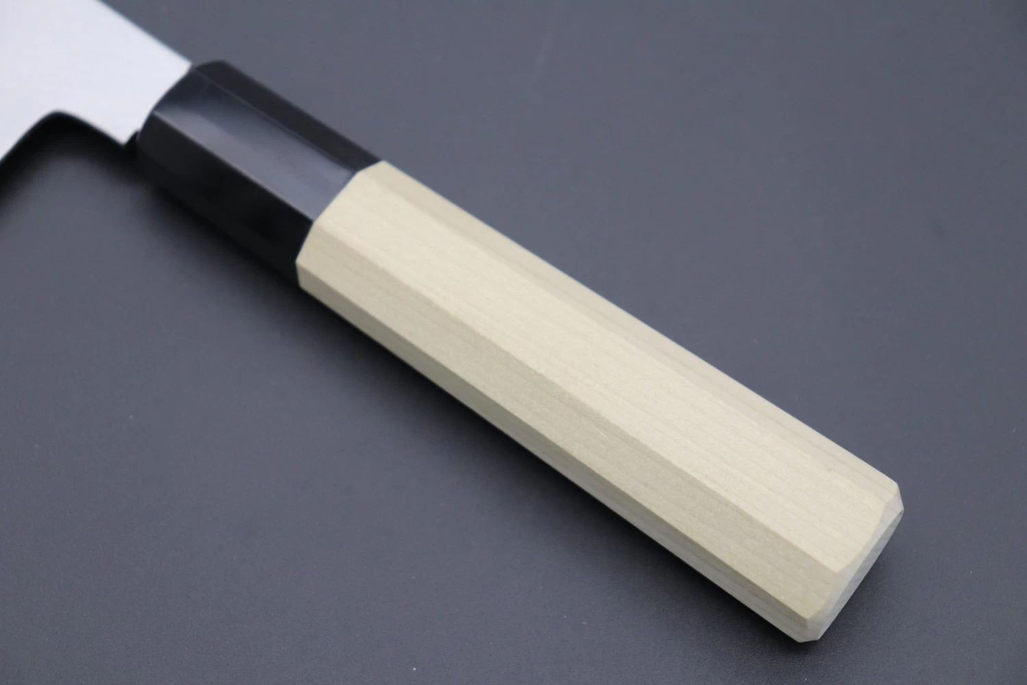 This knife comes with a comfortable octagonal magnolia wood handle with black water buffalo horn ferrule / bolster, and includes a matching magnolia wood Saya (“Sheath”) -with black pakkawood saya pin- for safekeeping.