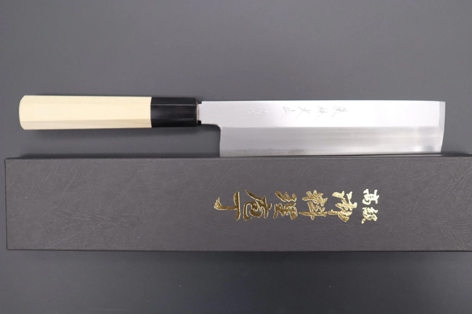 Japanese Traditional Style “Wa-Bocho” knives generally come with Single bevel edge for right-handed use (the opposite side of blade is ground flat with slightly concaved shape). The reverse grinding left-handed version is also available at 50% extra of regular price. (Sorry for much extra! Due to a small demand for the left-handed version in Japan, it is costly to run a special small production from the beginning step and production is very very limited.)