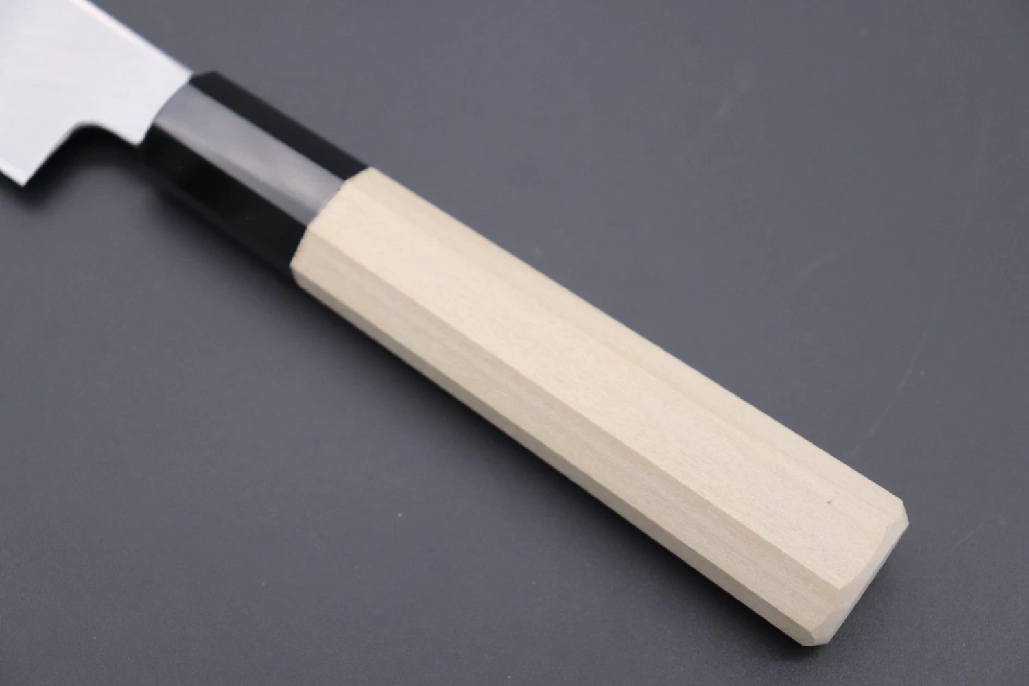This knife comes with a comfortable octagonal magnolia wood handle with black water buffalo horn ferrule / bolster, and includes a matching magnolia wood Saya (“Sheath”) -with black pakkawood saya pin- for safekeeping.