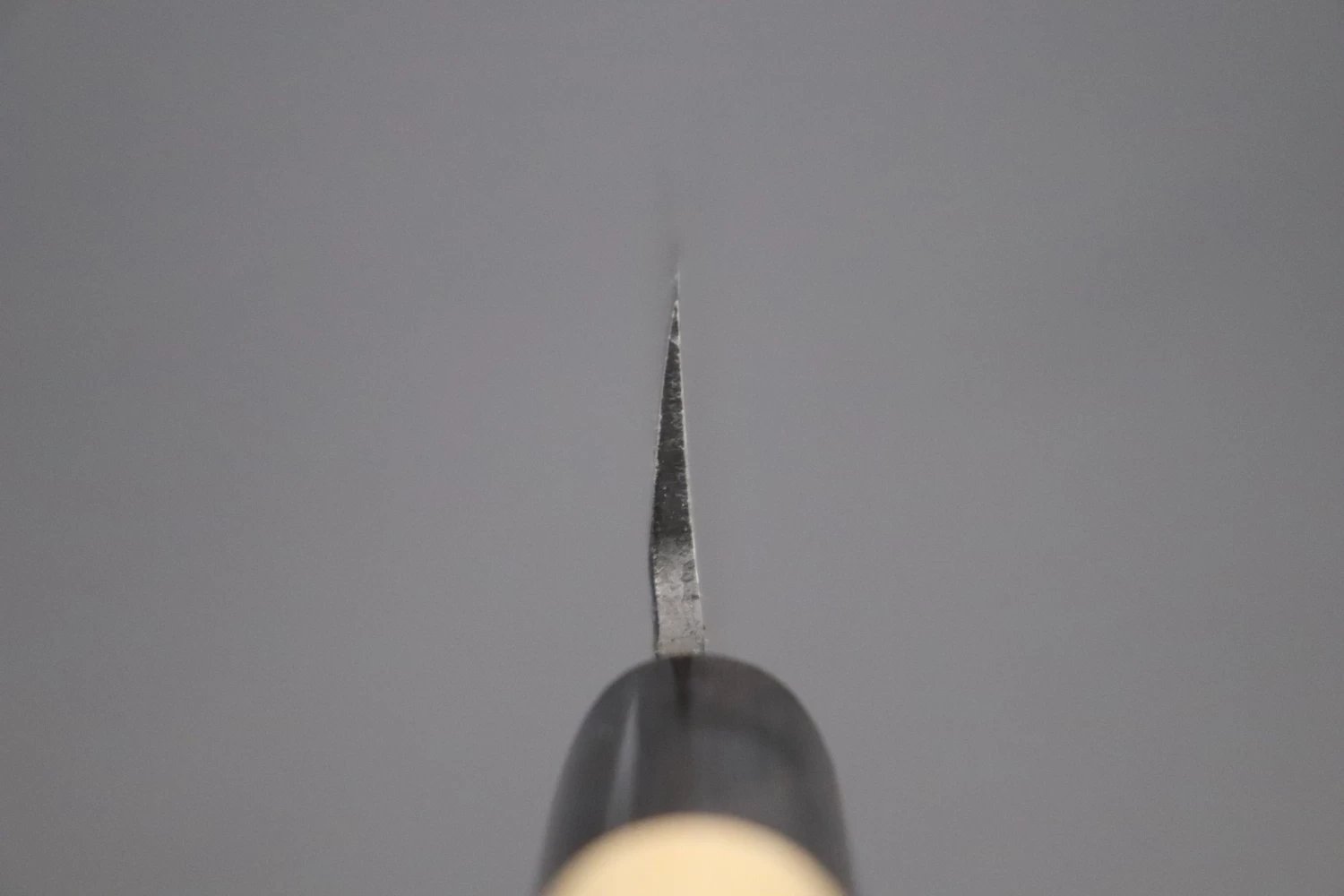 Very impressive and the unique Kurouchi (“Black-forged”) finish of the blade and its beautiful color gradation. The Kurouchi finished section of the blade (See Top-half) also has a unique Tsuchime (“Hammered pattern”) texture. It contrasts beautifully with the cloudy grey colored Kasumi (“True mist”) finished upper blade bevel and the shining silver of the polished cutting edge.