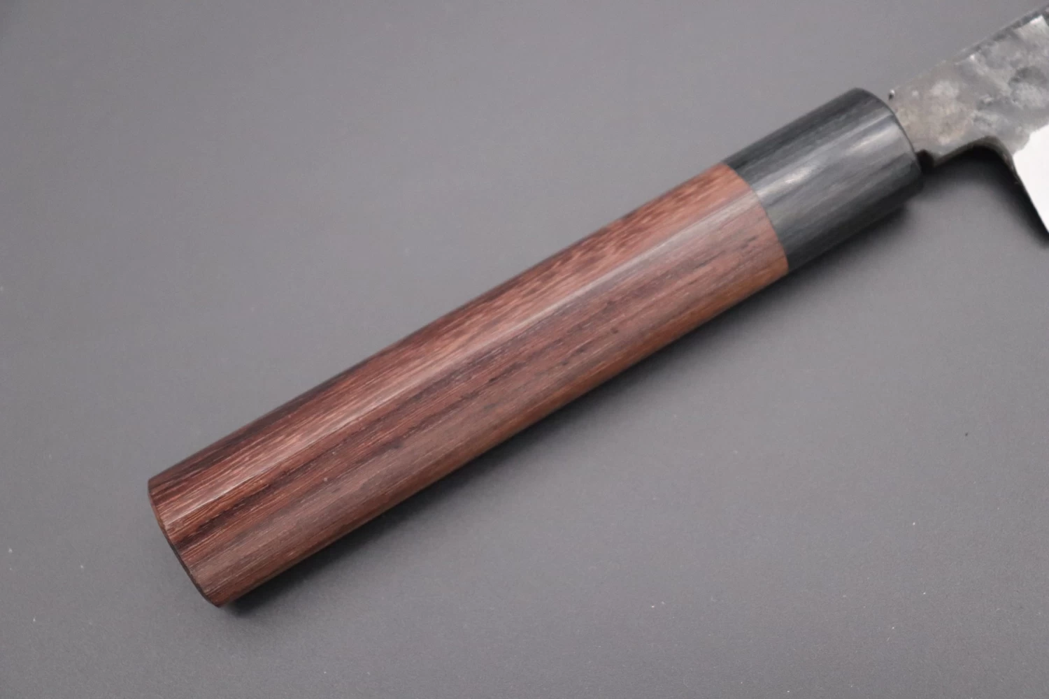 - ‘D-shaped’ handle in dark-red sandalwood with a black pakkawood ferrule that nicely complements the Kurouchi blade.