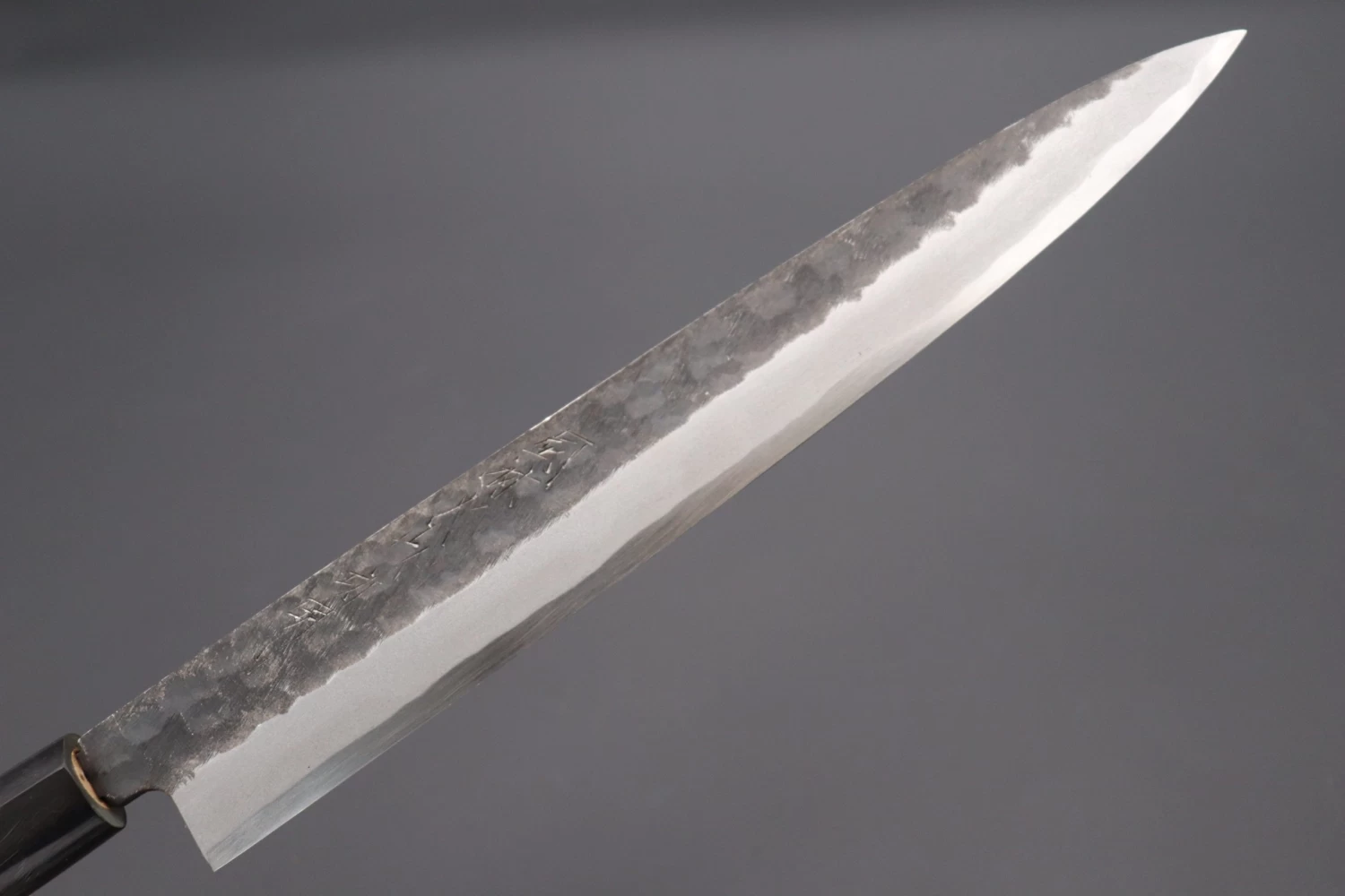 Very impressive and the unique Kurouchi (“Black-forged”) finish of the blade and its beautiful color gradation. The Kurouchi finished section of the blade (See Top-half) also has a unique Tsuchime (“Hammered pattern”) texture. It contrasts beautifully with the cloudy grey colored Kasumi (“True mist”) finished upper blade bevel and the shining silver of the polished cutting edge.