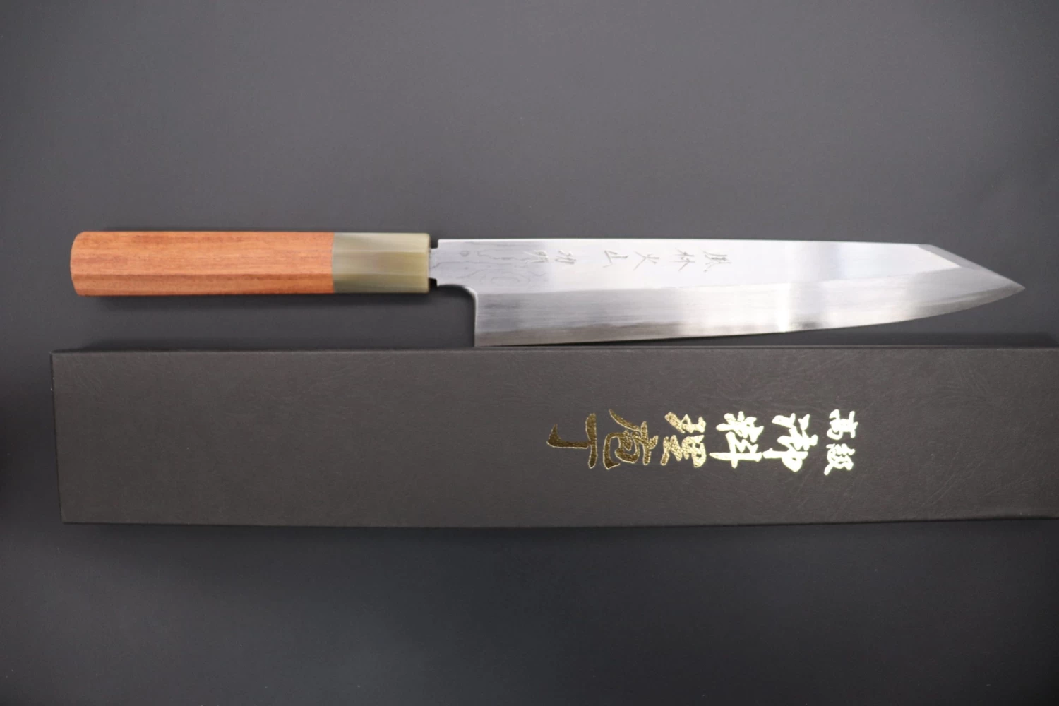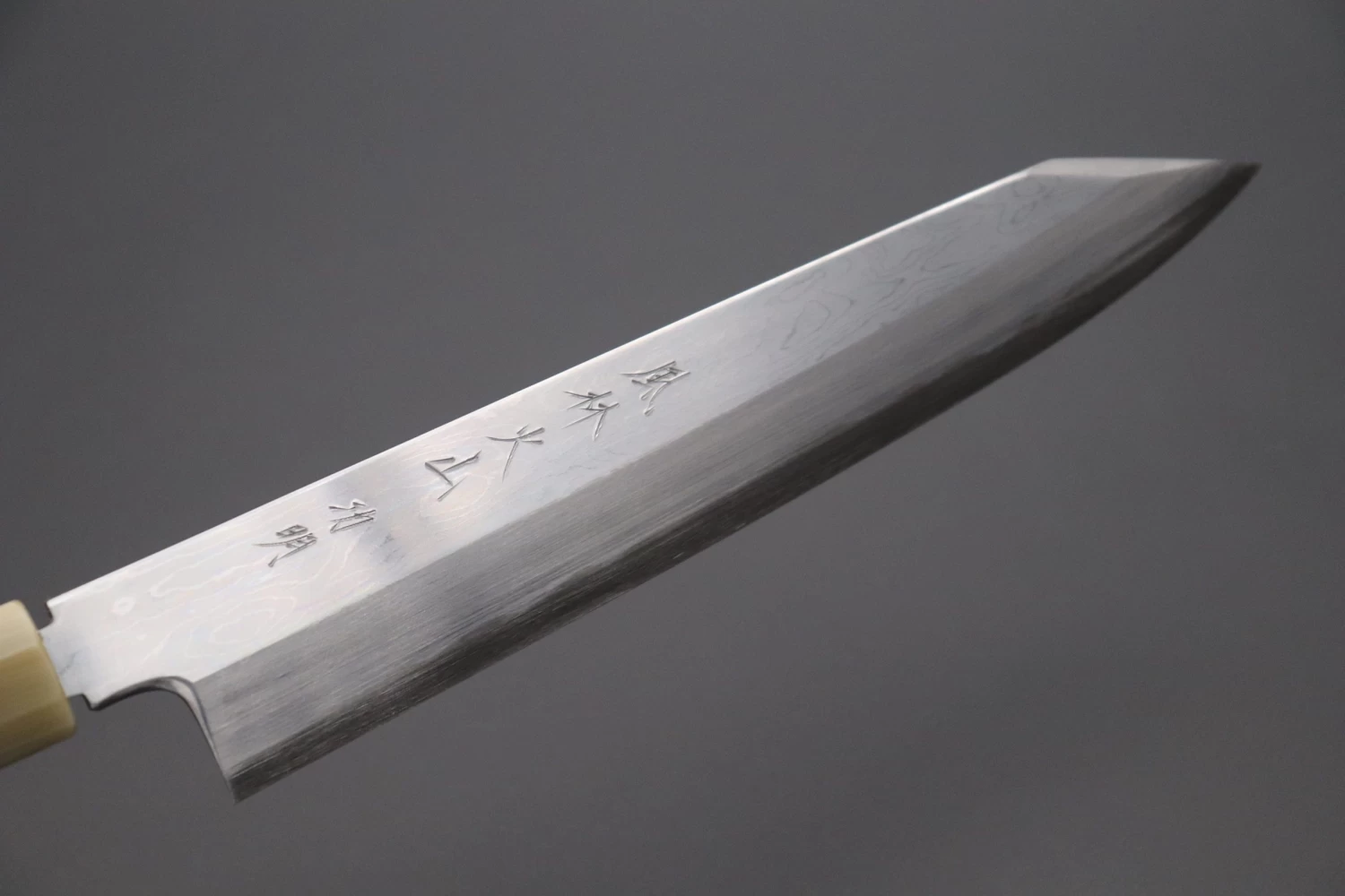 This is the special order made Fu-Rin-Ka-Zan Limited Model and available with limited quantity. Beautiful Masterpiece of Blue Steel No.1 Suminagashi Kiritsuke knife with Octagon Shaped Quince Wood Handle and hand crafted Magnolia wooden saya.