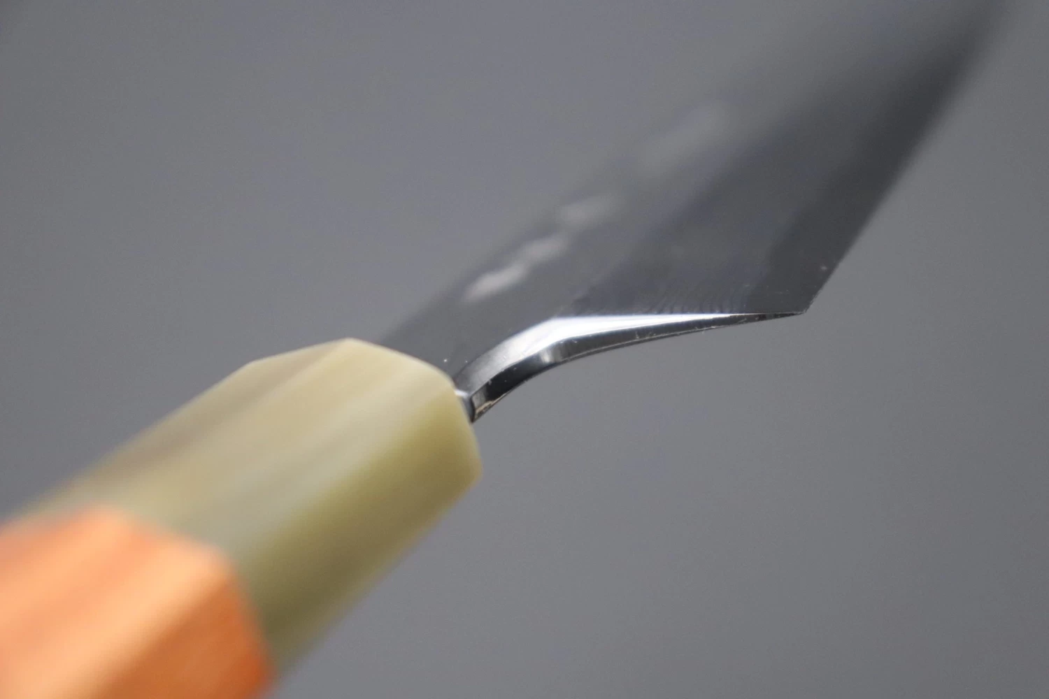Japanese Traditional Style “Wa-Bocho” knives generally come with Single bevel edge for right handed use (the opposite side of blade is ground flat with slightly concaved shape). The reverse grinding left handed version is also available at 50% extra of regular price. (Sorry for much extra! Due to a small demand for the left handed version in Japan, it is costly to run a special small production from the beginning step). We try to keep the left handed versions in stock, but once sold out, it may take 60 to 90 days for delivery. Please contact us first for the availability at email.