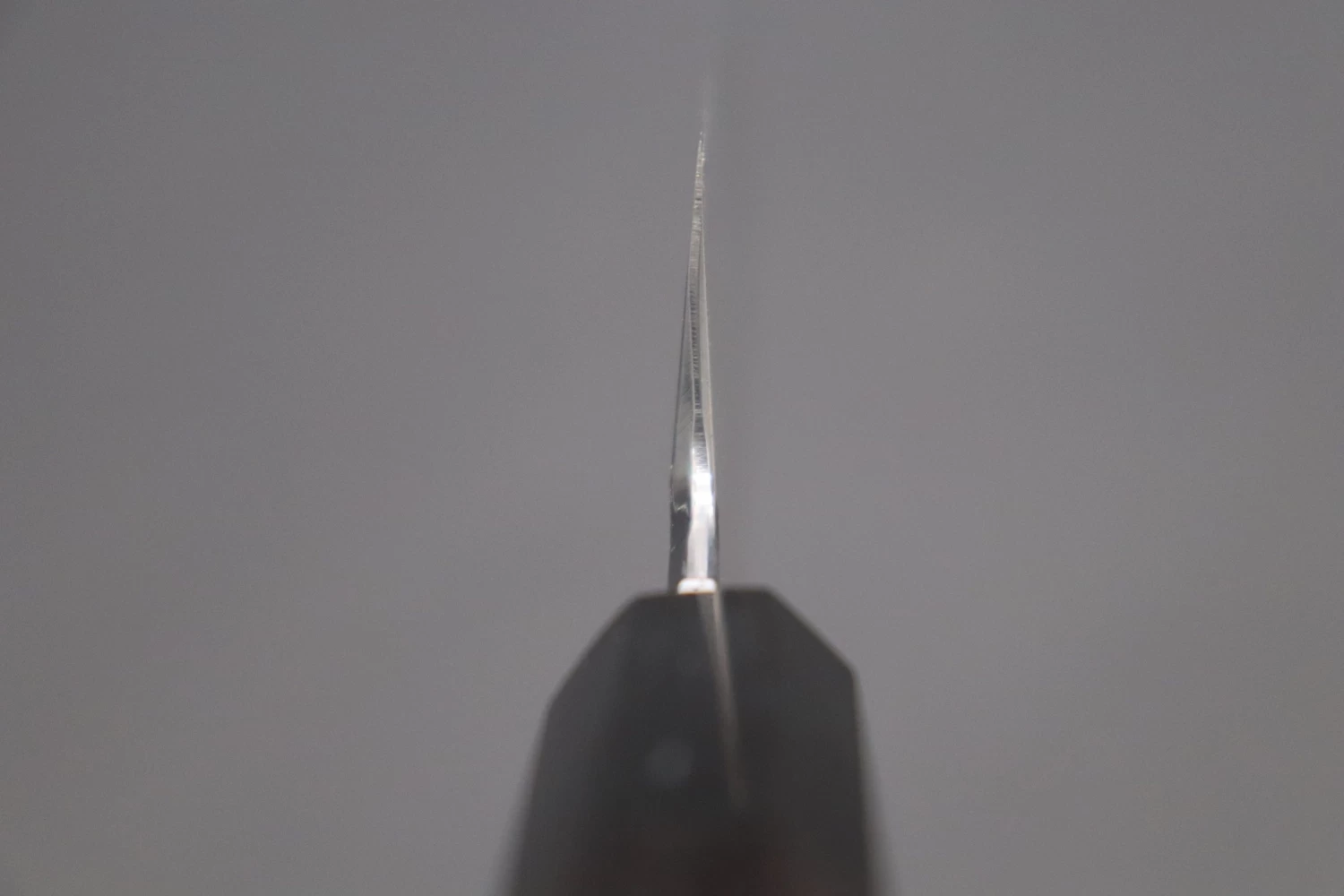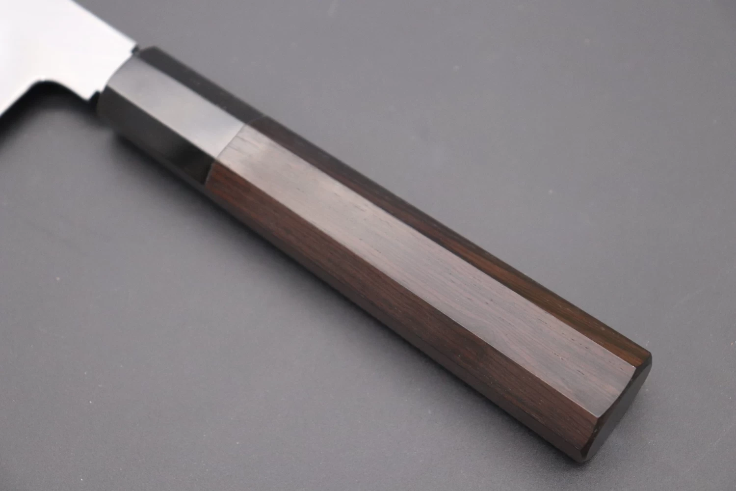 Japanese Traditional Style “Wa-Bocho” knives generally come with Single bevel edge for right handed use (the opposite side of blade is ground flat with slightly concaved shape). The reverse grinding left handed version is also available at 50% extra of regular price. (Sorry for much extra! Due to a small demand for the left handed version in Japan, it is costly to run a special small production from the beginning step). We try to keep the left handed versions in stock, but once sold out, it may take 60 to 90 days for delivery. Please contact us first for the availability at email.