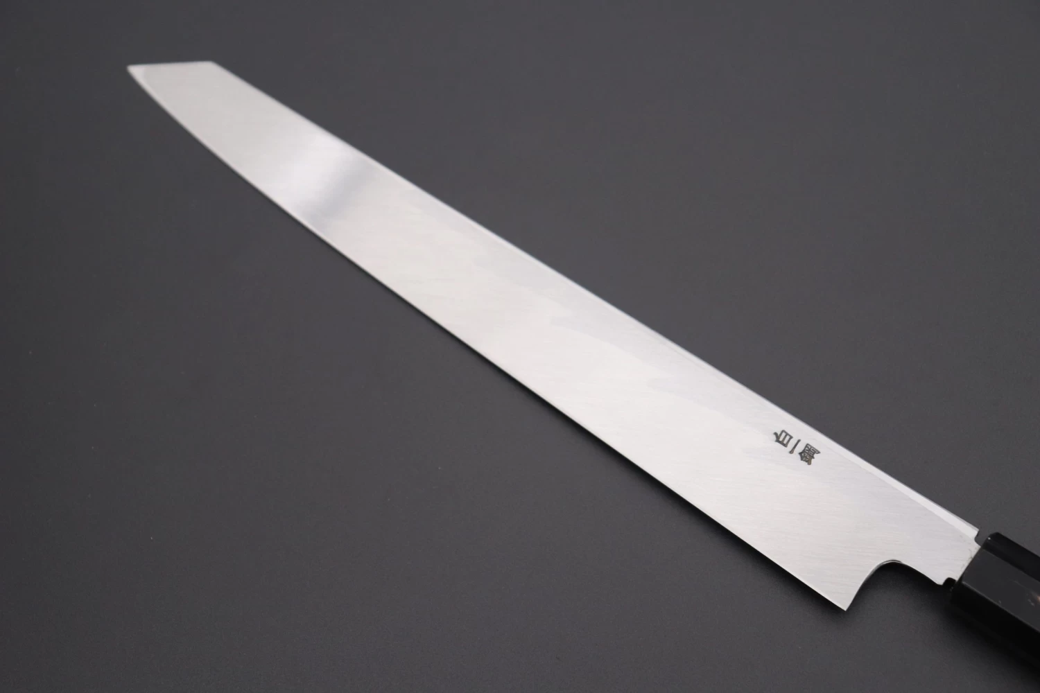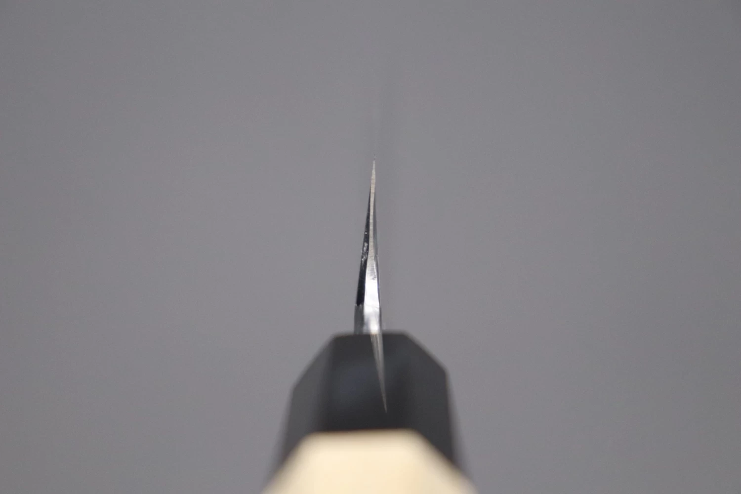 The Kirisuke Yanagiba has a very similar blade profile to the ‘regular’ Yanagiba, but it has what is commonly known as a ‘reverse tanto’ tip, or ‘clipped point’, which is very useful for precision cutting. Apart from this difference, the Kirisuke Yanagiba functions in the same way as the ‘plain’ Yanagiba or the Takohiki.