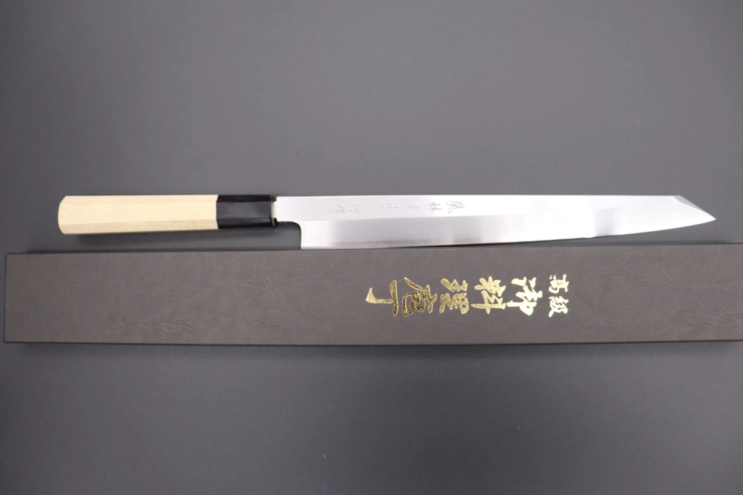 Te Kiritsuke Yanagiba comes with Octagonal Magnolia Wood Handle and hand crafted Magnolia Wooden Handle.