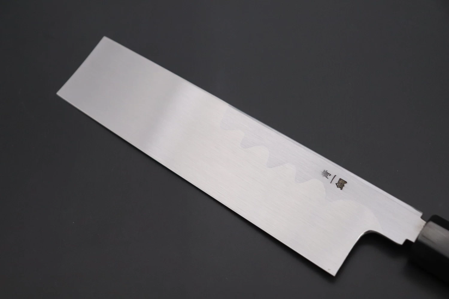 The Usuba is ideal for cutting vegetables and fruits which are served raw, because the thin and sharp blade produces cut surfaces with very little cell damage, and this minimizes the discoloration and change in flavor often caused by oxidation. The versatile middle section of the blade can be used for thinly slicing vegetables and also for performing the specialized Katsuramuki (“Rotary peeling”) technique.